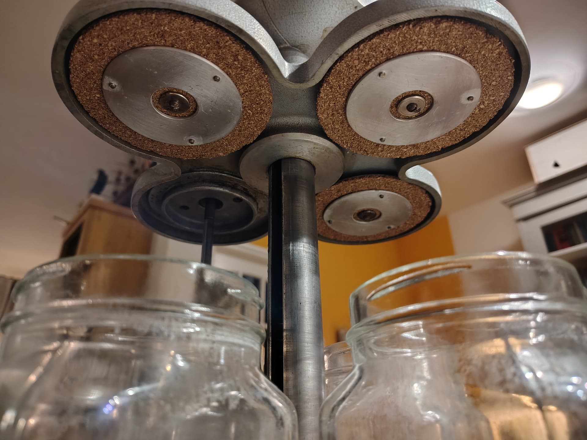 Zo te zien is het dekseltje van het droogkamertje verwisseld met die van 1 van de potten. De kurken ringen zijn vaak versleten. Ze zijn te koop bij van de Gevel, Zellerstraat Tilburg, maar ik heb ook gehoord dat je ze van Ikea placemats kunt snijden.
