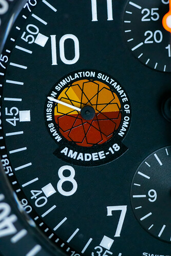 Elke lijn in het logo staat voor een geslaagd experiment en de verschillende tinten oranje en rood voor de zonsop- en ondergang op Mars en de Aarde. Waarom ze dit op de secondewijzer hebben gedaan weet ik niet maar het idee is leuk. Als ik het design had gedaan had ik dit echter liever op een GMT subdial geplakt (die dit horloge overigens niet heeft).