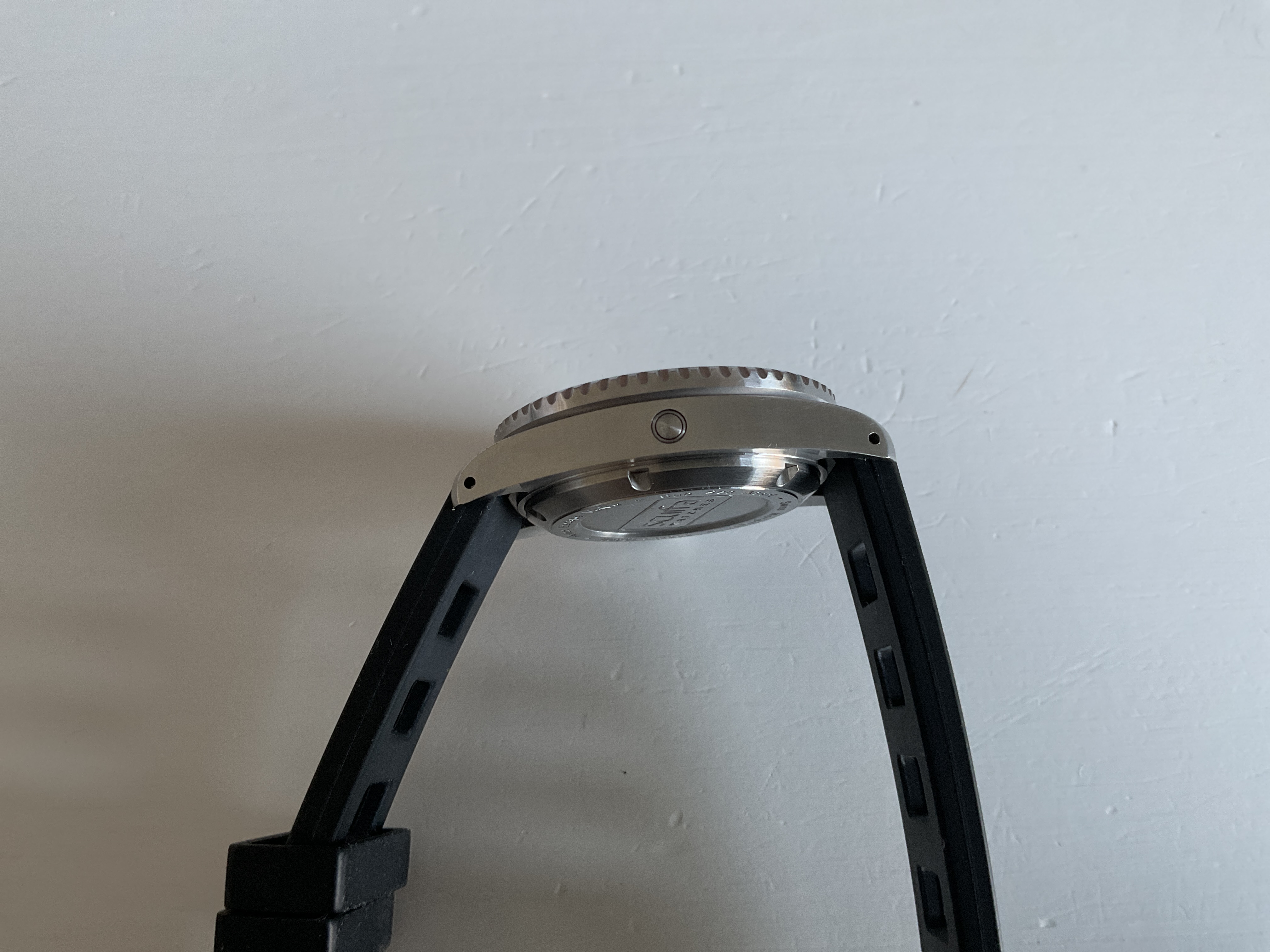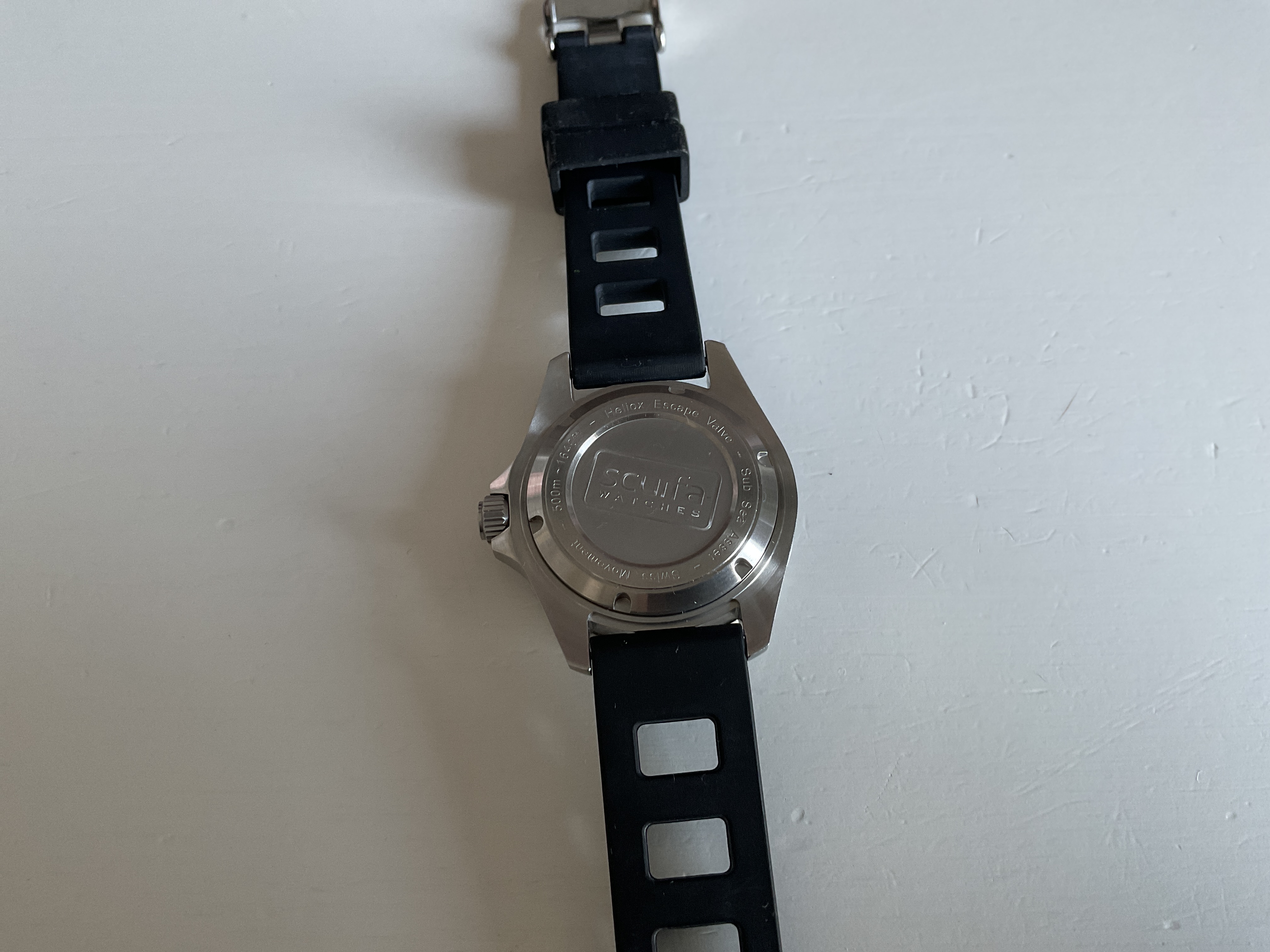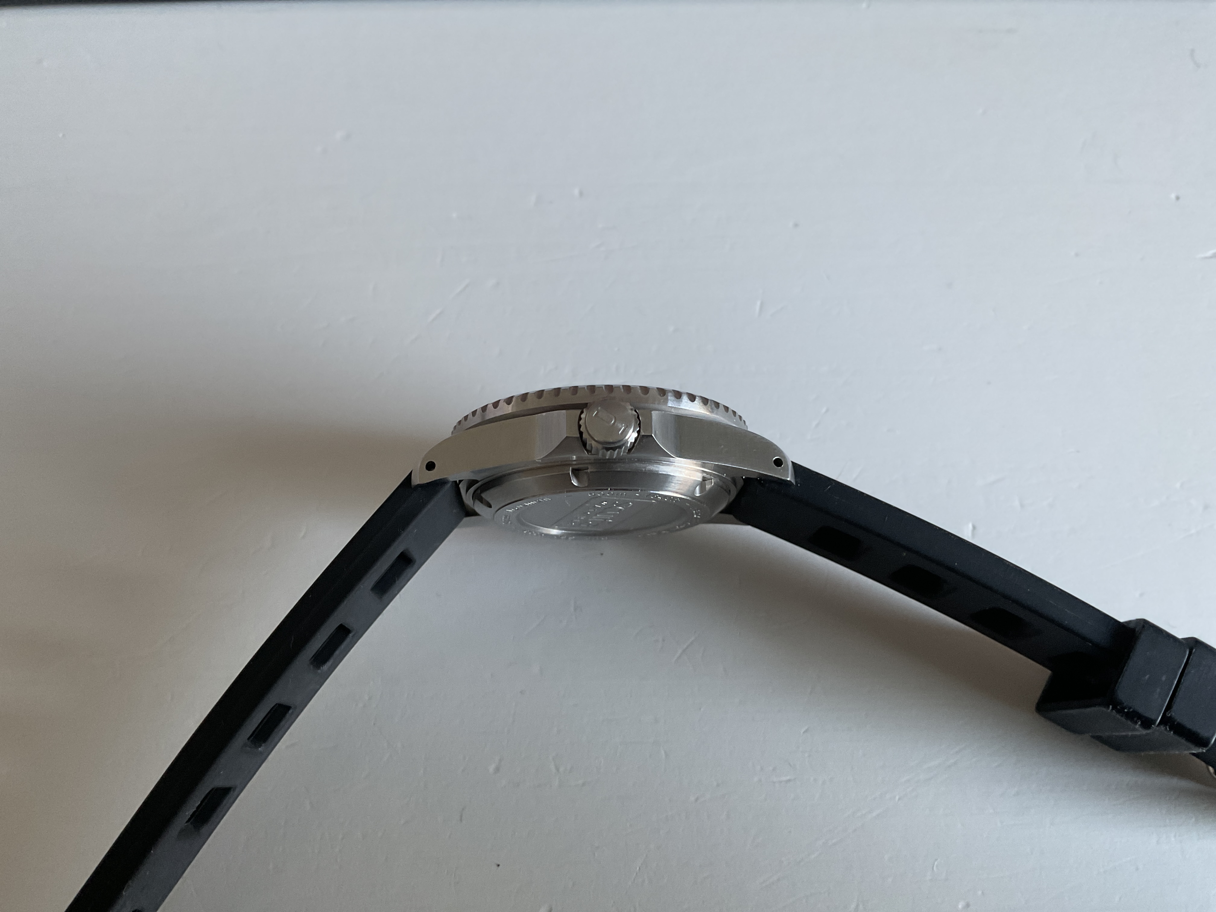 Originele band zit er bij maar is gaan glimmen door gebruik. Zit nu op een issofrane stijl band. Horloge is gedragen maar kan eigenlijk geen beschadigingen ontdekken. Heeft echt een fantastische lume.