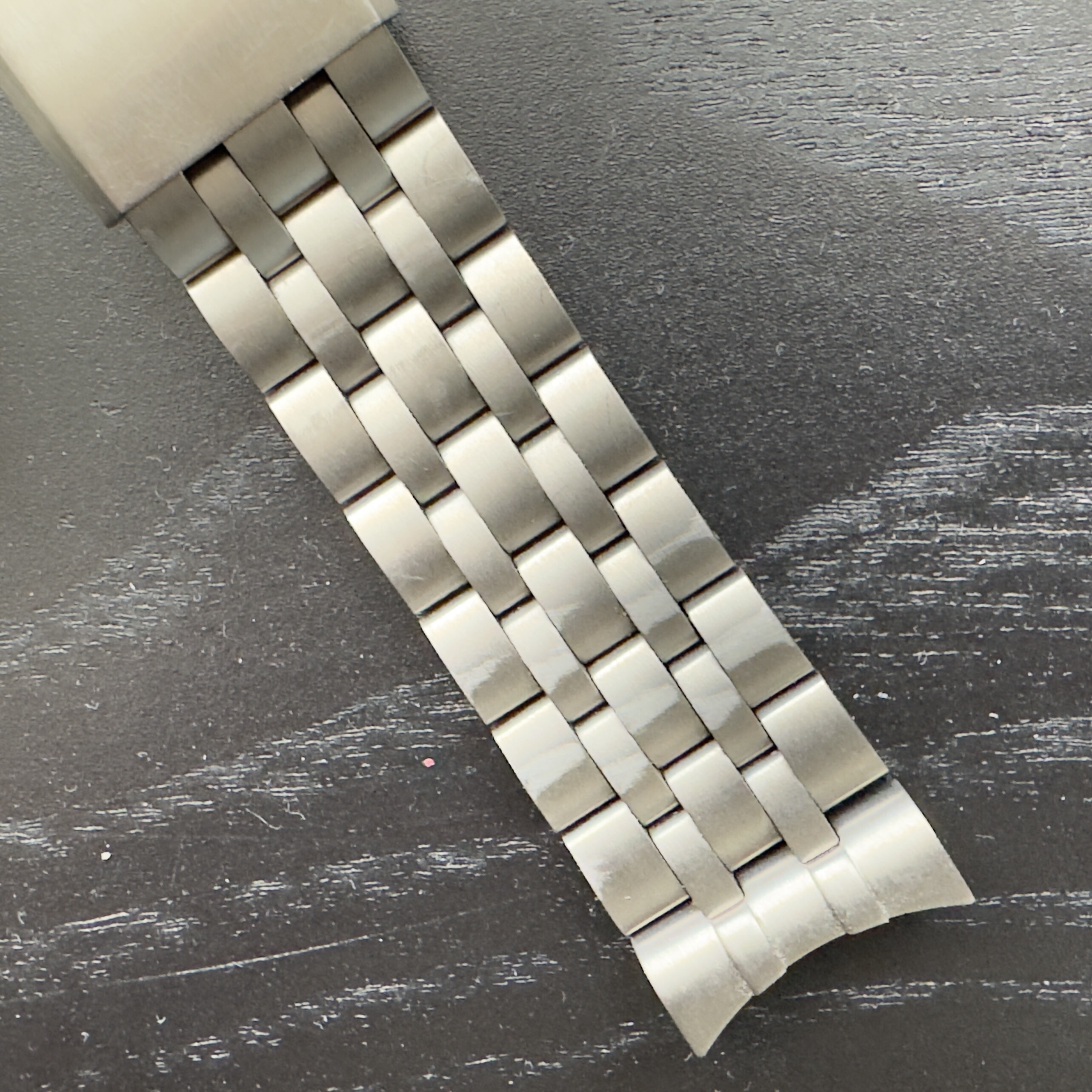 Materiaal is Grade 2 titanium, heeft her en der wat dingetjes en onder de lugs sporen van bandenwissels. De titanium band heeft wat vegen op de links en de sluiting.