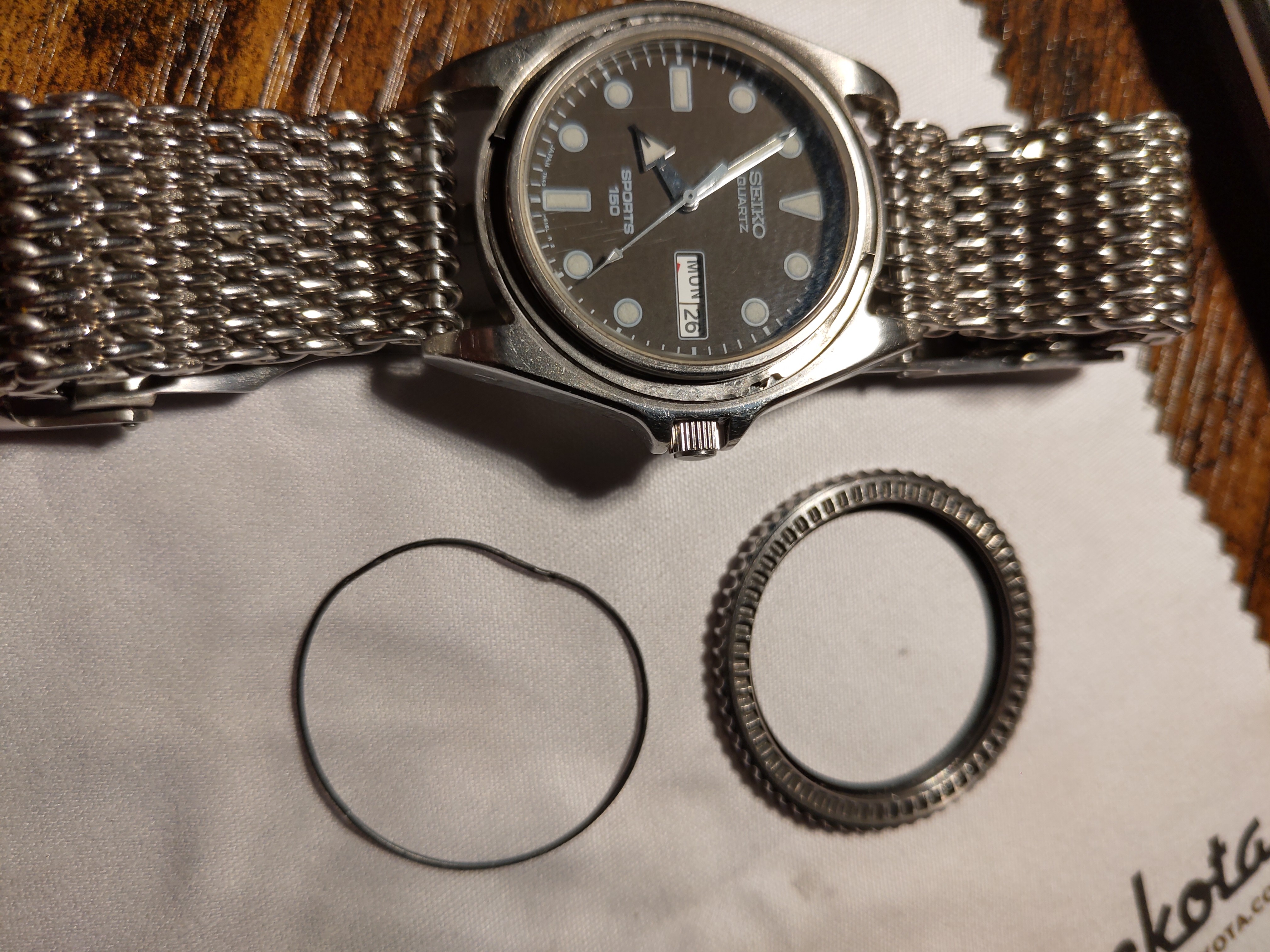 Pakking ziet er niet meer helemaal goed uit en moet strak in de bezel zitten, die pakking zorgt voor de frictie van de bezel.