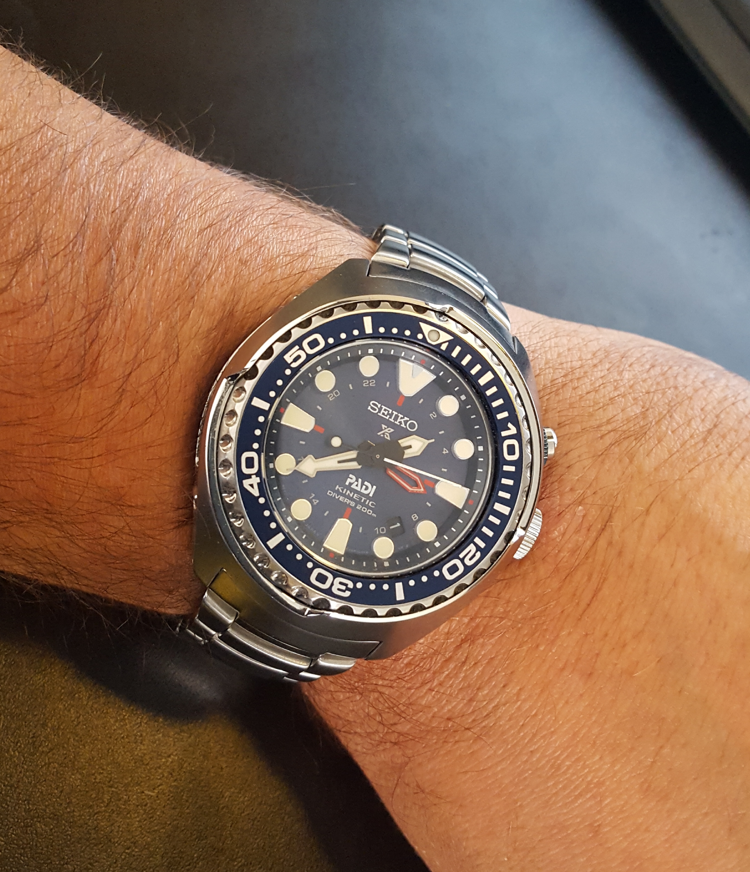 Nieuw in mân bescheiden verzameling; de Seiko SUN065 PADI met stalen band (van de SUN019). Heerlijke massieve klok en ondanks zân formaat, voor mij niks te groot