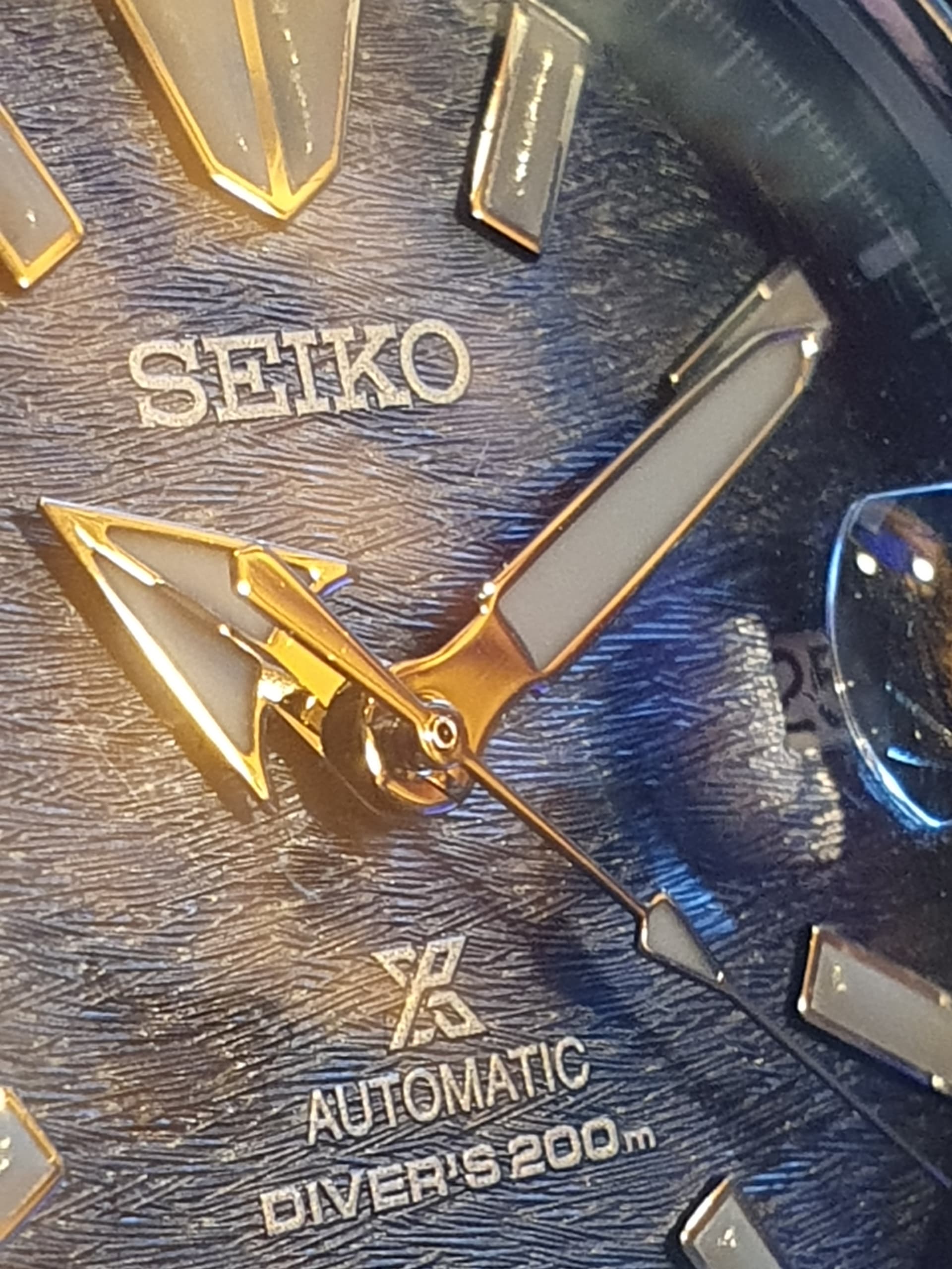 De dial kan met gemak de strijd aan met zijn duurdere broertjes uit de Grand Seiko stal. Heb het zo goed als mogelijk vast proberen te leggen. (Zie foto’s).