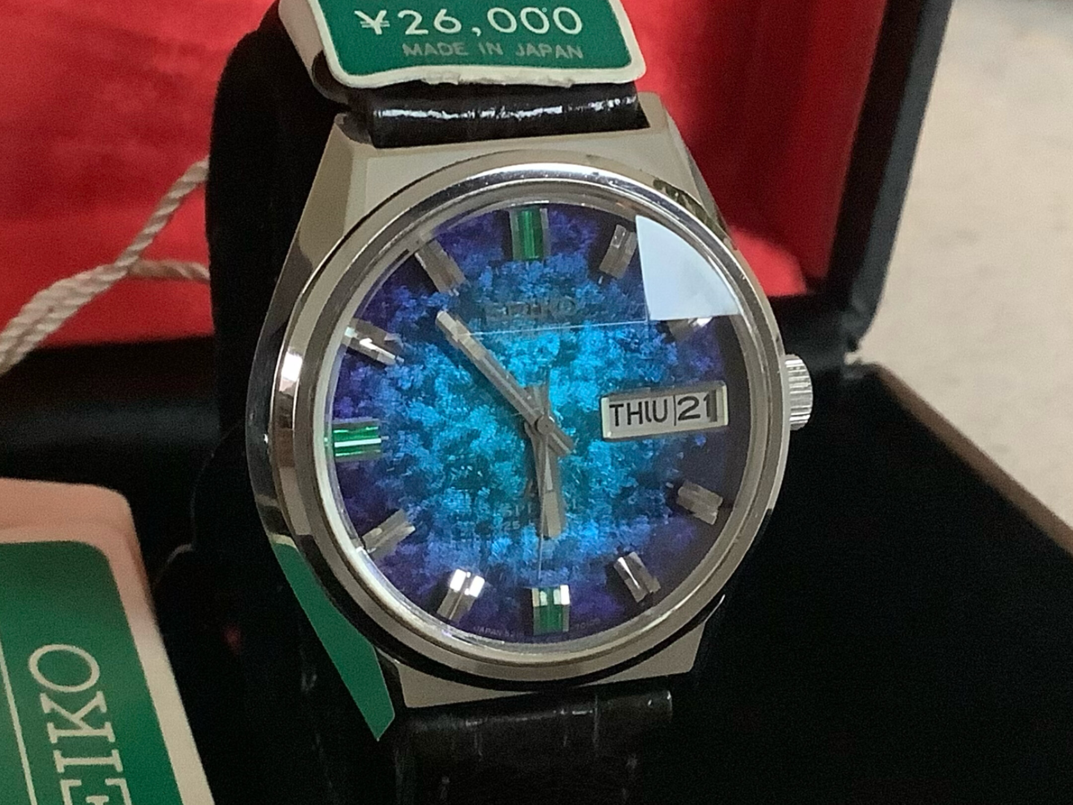 Seiko Superior 3883-7000 “Morpho”: Dit was een van de duurste horloges van Seiko toen het in 1974 werd uitgebracht. De wijzerplaat staat bekend om zijn unieke, iriserende textuur die doet denken aan de vleugels van een morphovlinder.