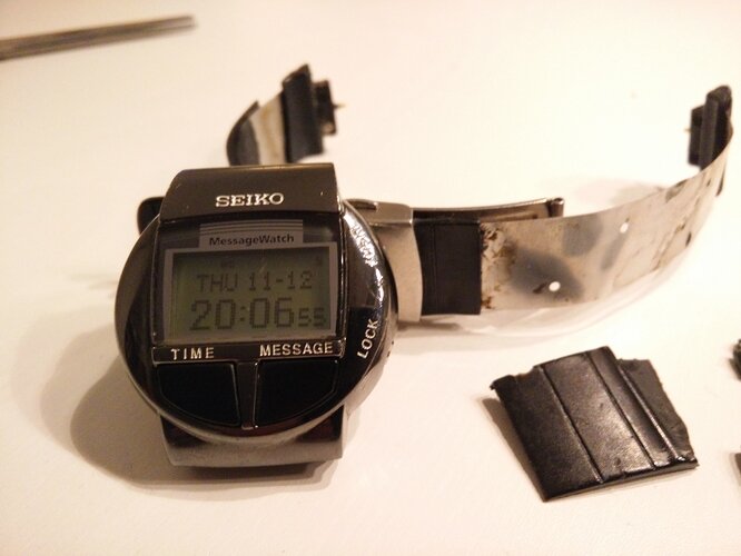 Ik ben voor een Seiko Message Watch (MA54-4A00 R1) op zoek naar een vervangende band. Die is in de loop van de jaren vergaan en nu laat de rubberen laag los van de metalen band. Deze metalen binnenband diende als antenne voor de berichtenservice die aan dit horloge was gekoppeld. Met de nadruk op was, want die service bestaat niet meer.