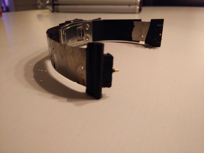 Ik heb al verschillende sites bezocht, maar het probleem is vooral de bevestiging aan de kast. Er zit een uitstulping aan, die in de kast valt. In deze uitstulping zitten twee metalen pinnetjes, die in twee gaatjes in de kast vallen. Dat zal voor de stevigheid zijn, zodat de band niet zomaar uit die opening getrokken kan worden.