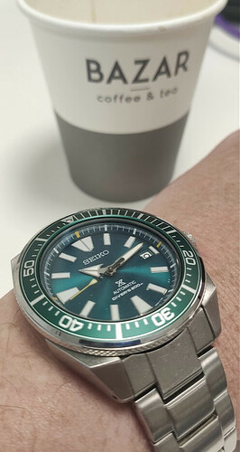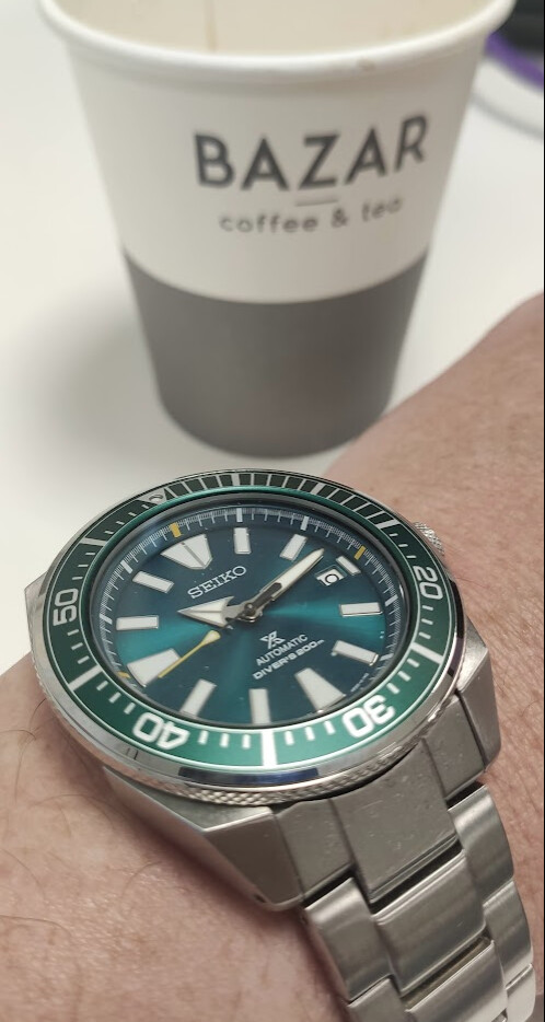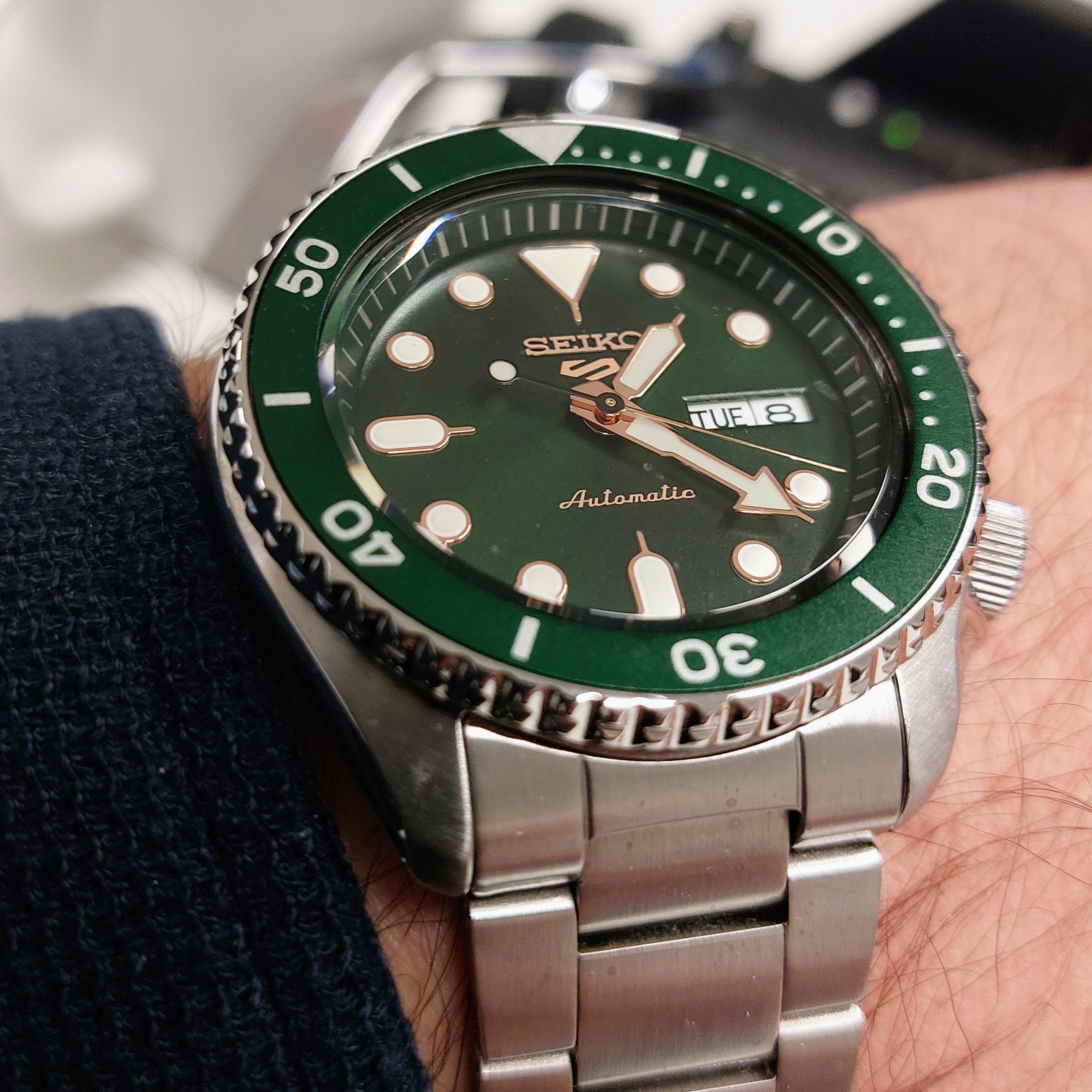 Nog zo’n klassieker-in-spe: The Green Goblin of anders de Hulk. De SRPD63K1. Sunburst groene wijzerplaat, goudomrande indices, groene bezel en een best prima stalen Seiko band. Resultaat is een klassiek/tijdloos horloge.