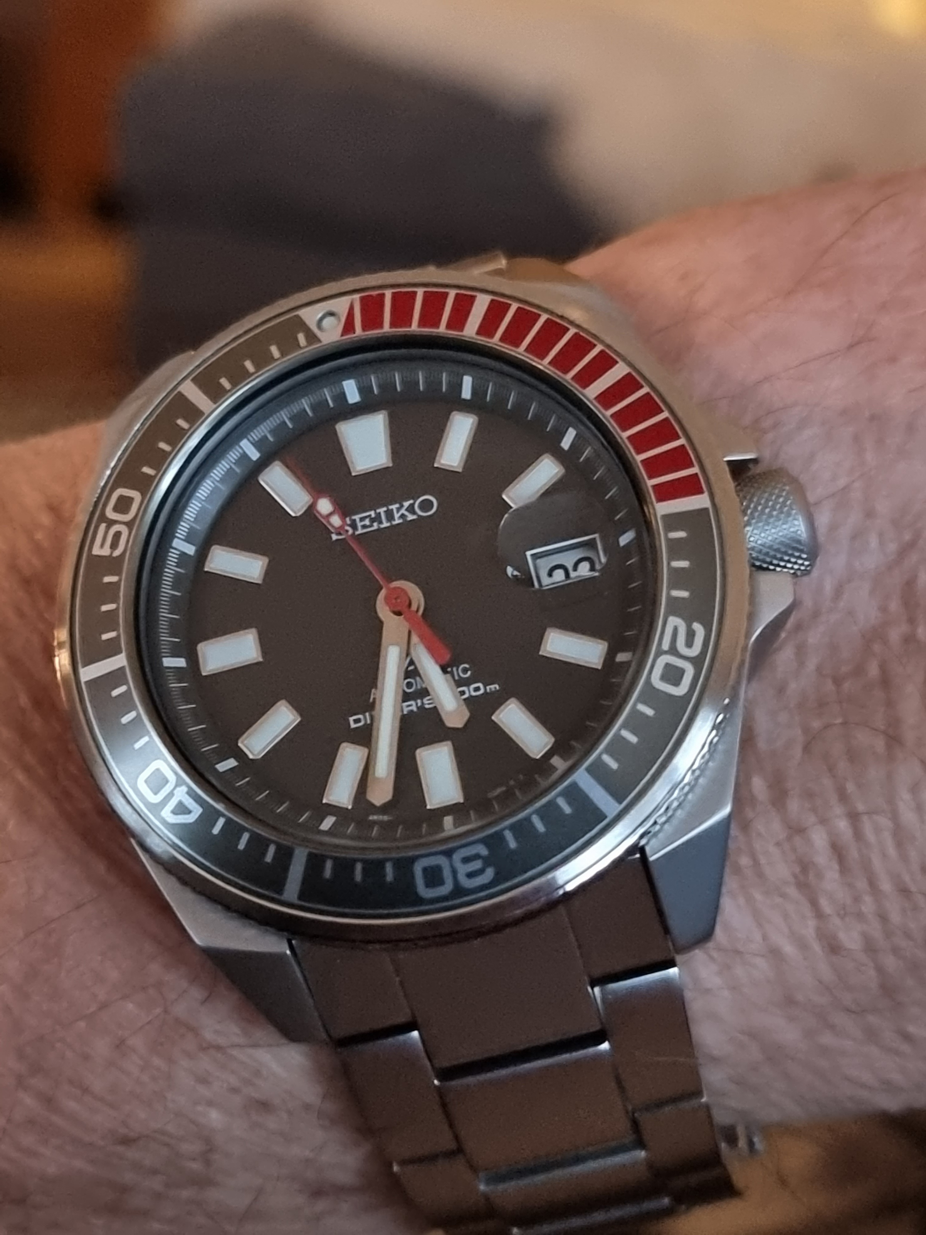 Gaaf man! Lekker maatje met 38mm, lugs 20mm, saffierglas, niet te dik, leuke dial, opgelegd logo, tikje scheve uitlijning (Seiko ®). Nu nog de SARB031 hands scoren via Perry dan is hij helemaal af