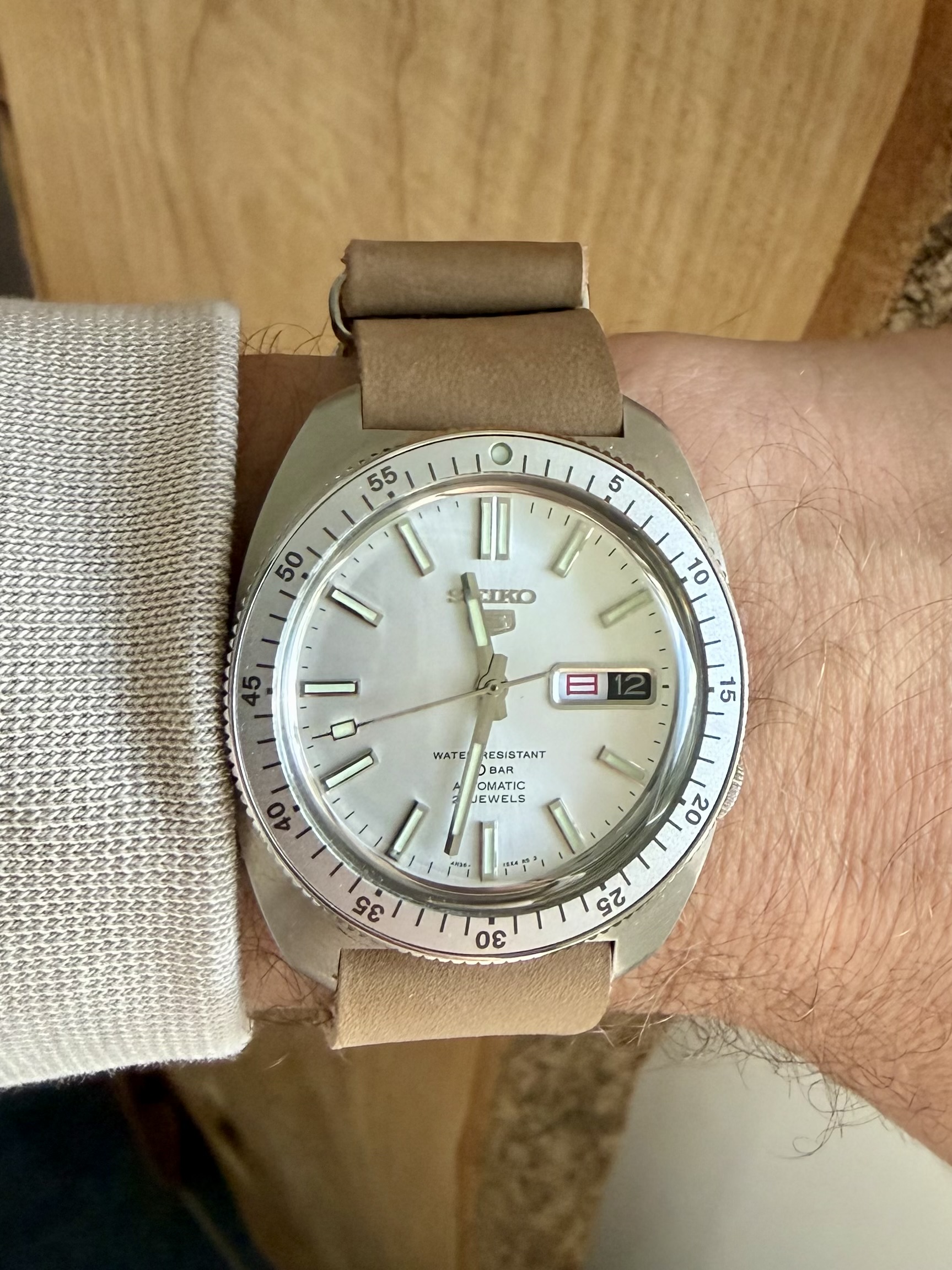 De SPB529 is een stuk forser met zijn 40,2mm en dat zie je meteen. Hij is duidelijker, maar niet storend, aanwezig. Een 40mm PRX is duidelijk groter om de pols. De lederen band is wat fletser dan op veel foto’s. Ik hoopte dat die wat meer kleur had.