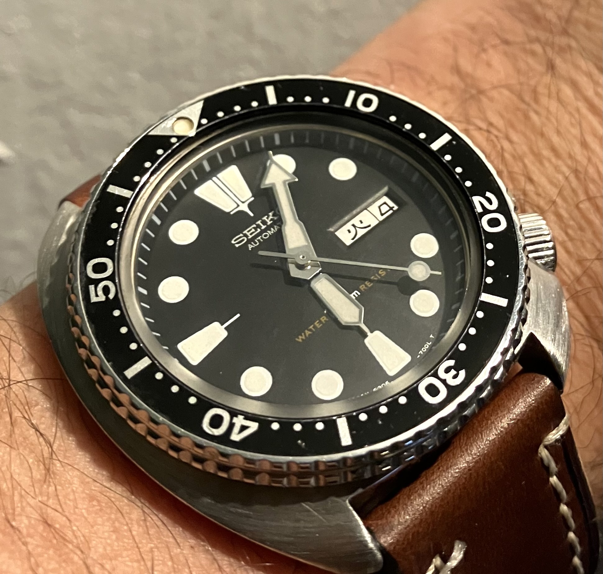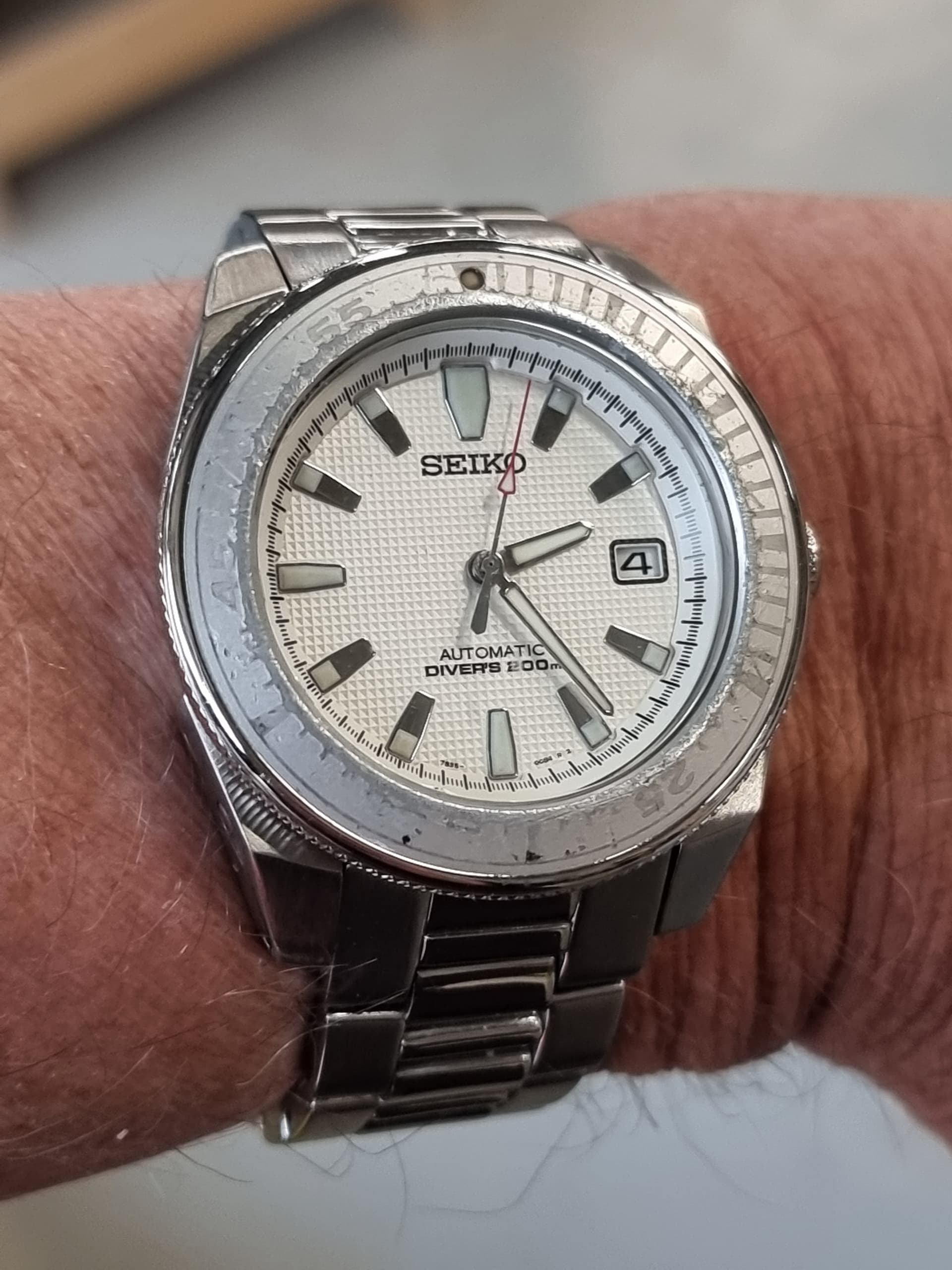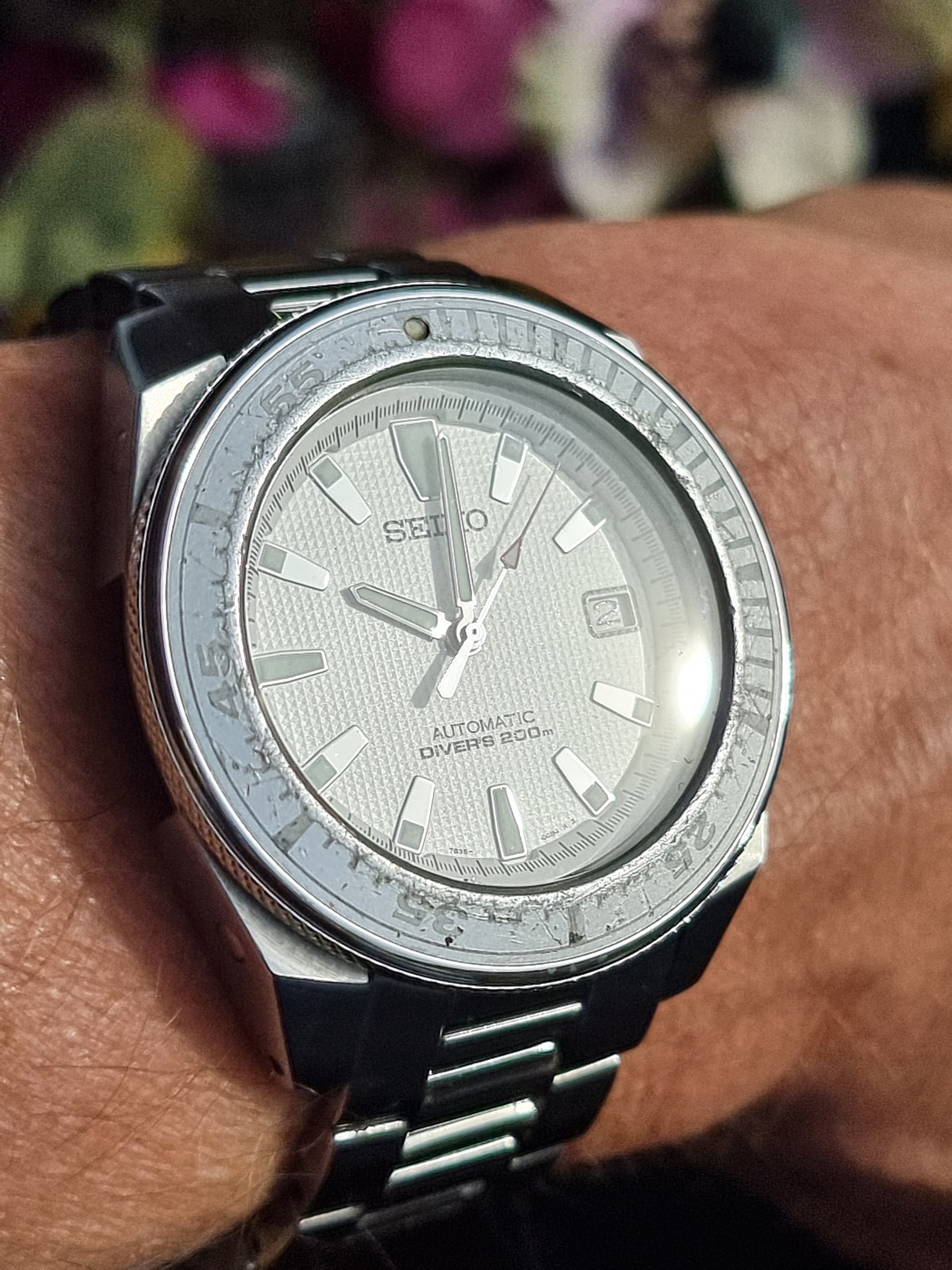 Ik weet oprecht niet wat mensen soms zeuren over de 7S26, maar als er iets een werkpaard is, dan is het dit uurwerk wel. Ja, van buiten is er bij dit ouwe bessie wel wat vervangen in de loop der jaren (kast, bezel, insert, horlogeband, periodiek wat o-ringen) maar dat is omdat het ding echt serieuze klappen heeft gehad, ik het ook gebruik waarvoor het gemaakt is (duiken) en ik de originele bezel met insert tijdens het verkeerd inzetten van een achterwaartse rol verloor toen mijn arm tegen de romp van de boot sloeg en de bezel eraf tikte. Alleen van binnen… daar is het kloppend hart dat van een jonge god. Het blijven topperties die SKX’en en ze verdienen alle mogelijke respect.
