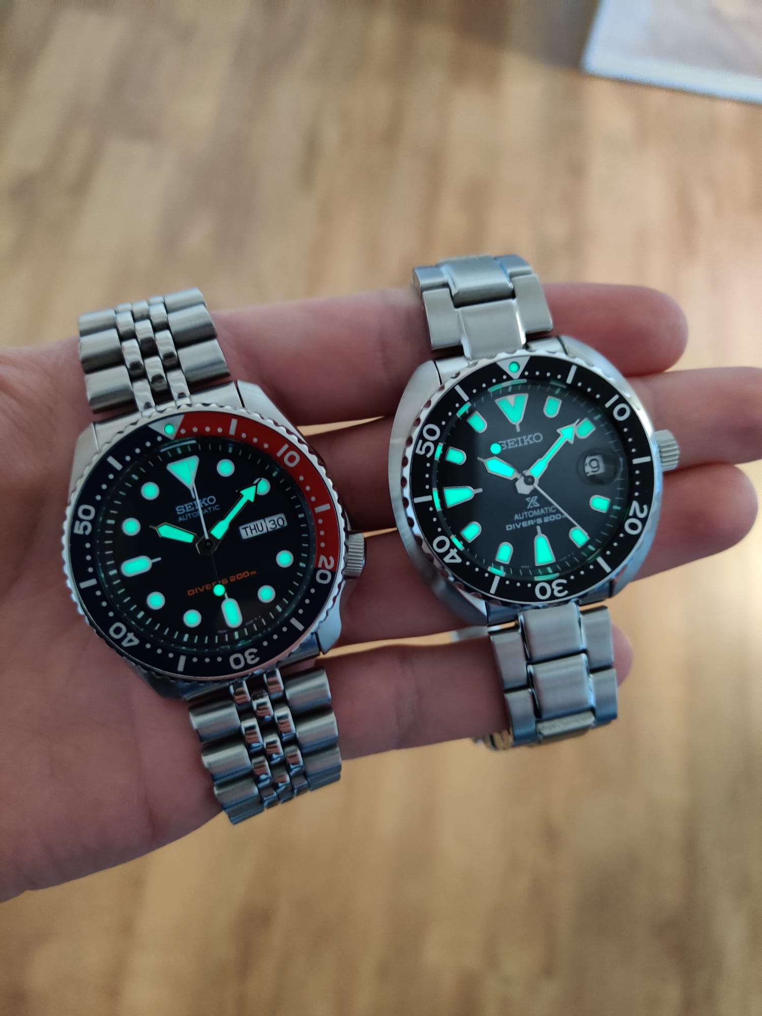 Grappig om te lezen dat de meningen zijn verdeeld. Voor mij is de mini turtle toch favoriet. Vooral omdat de schroefkroon makkelijker te draaien is, er geen dag-functie op zit, en hij opgelegde indices heeft.