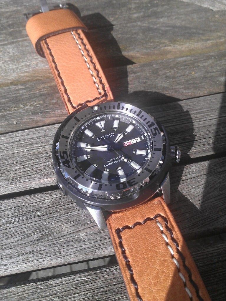 Stoere duiker, schitterend bandje! :~ Maar de combi is niet de mijne. Ik vind persoonlijk dat deze duiker aan rubber hoort, eventueel aan een zwarte carbon of aan staal, maar niet aan leer.