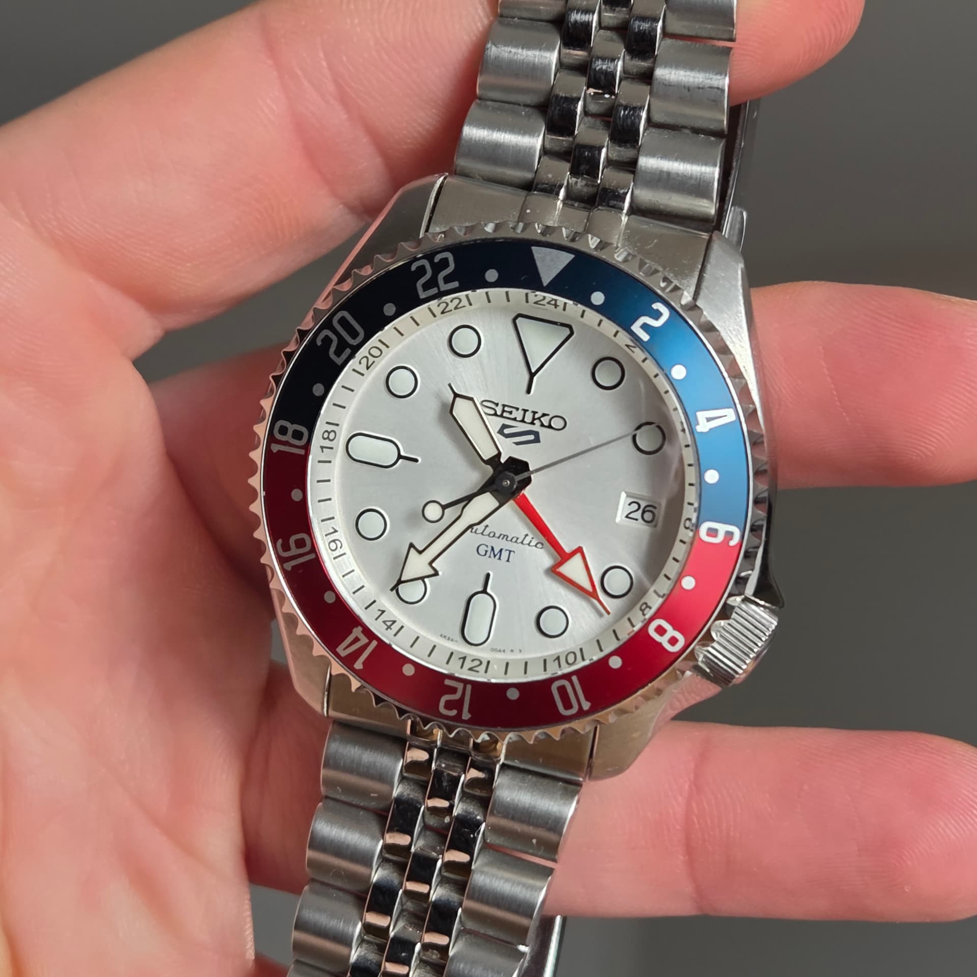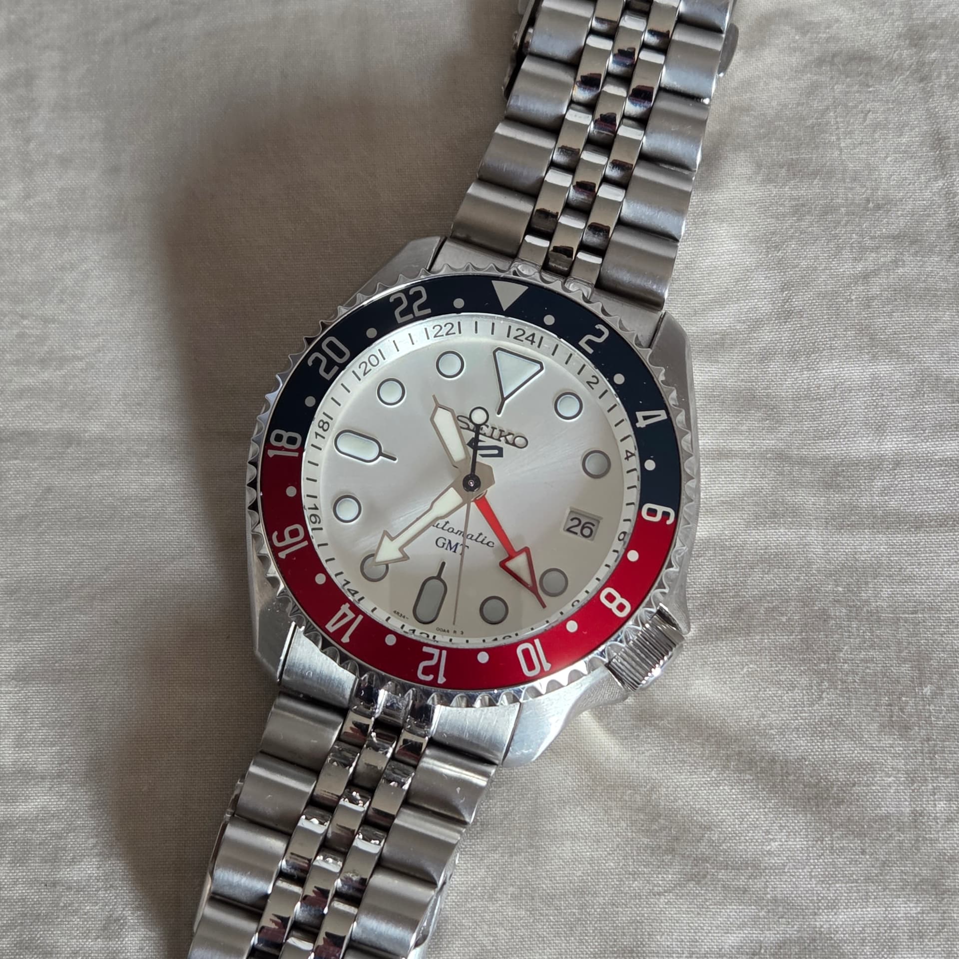 De welbekende Seiko SSK003 GMT Batman, maar dan met wat modificaties, allemaal besteld bij gerenommeerde mod-leverancier Namoki: