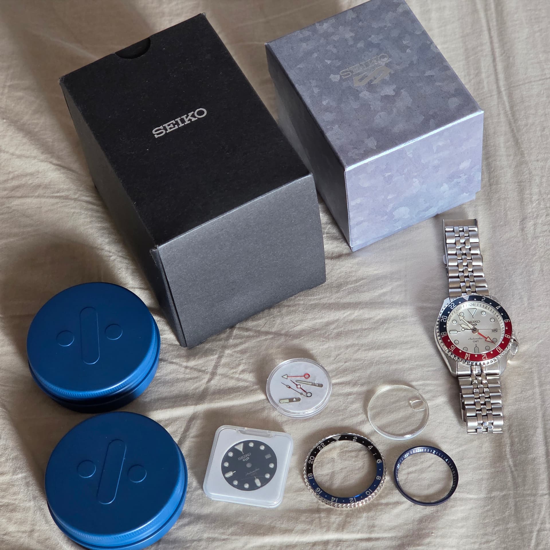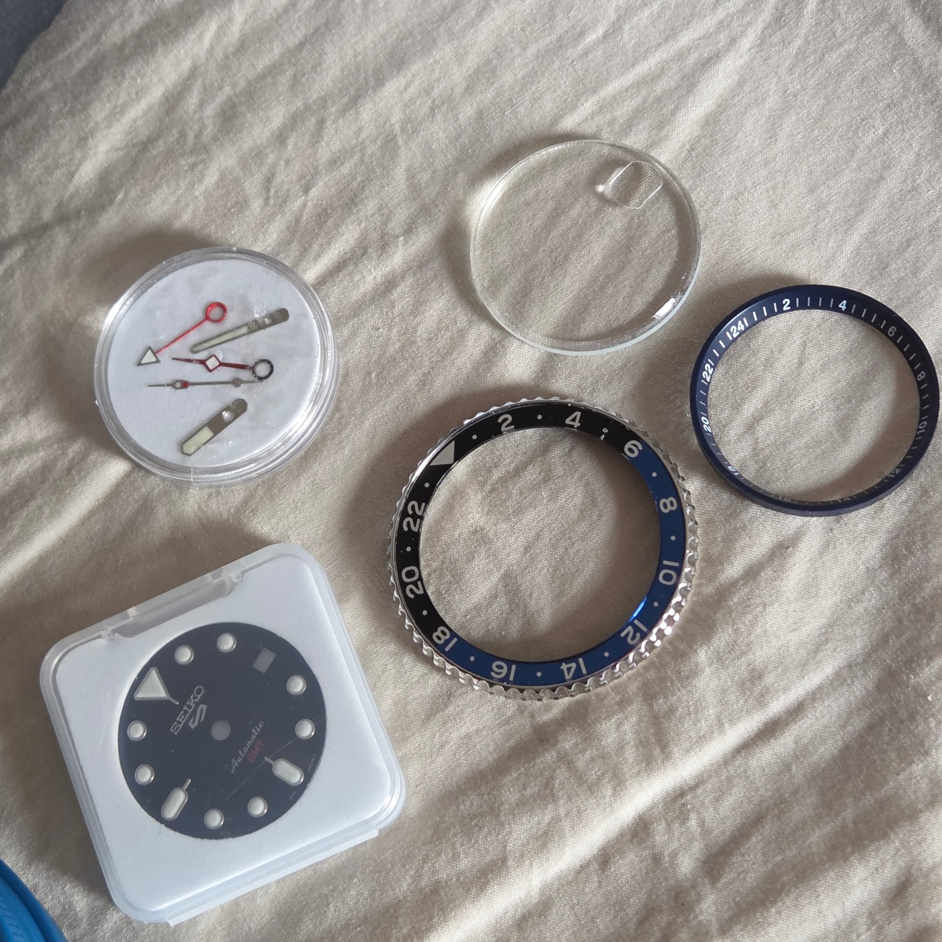 Originele hardlex glas (met kras), blauwe dial, blauwe chapter ring en bezel+insert uiteraard inbegrepen. De inbegrepen wijzers zijn mod, degene die geïnstalleerd zijn, zijn origineel. Laatste foto is in originele toestand vlak voor modificatie. Er is na de modificatie gewoon nog gezwommen met het horloge in zowel zee als zwembad, zonder problemen.
