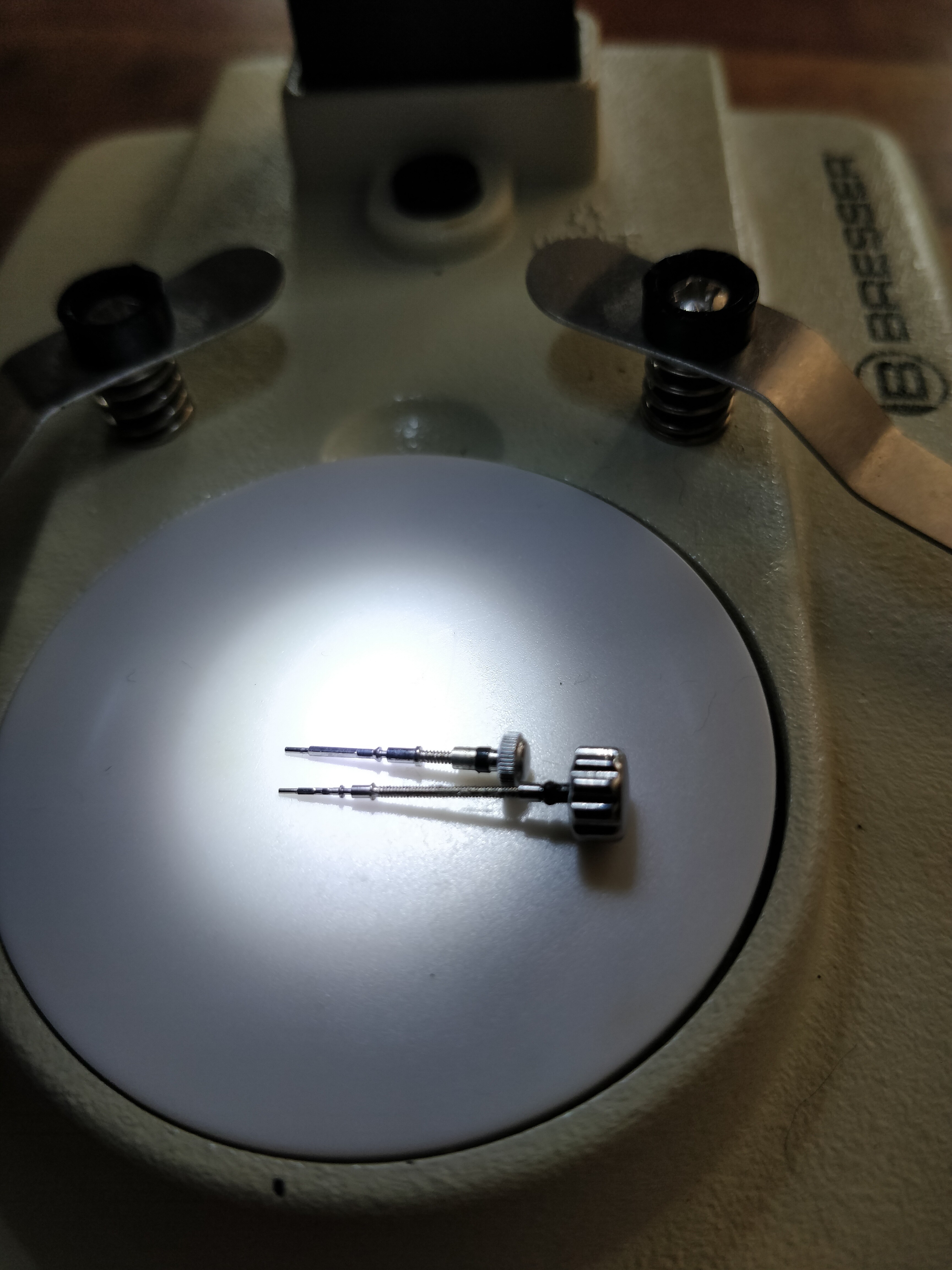 Hoe unlock ik de kroon met as van onderstaand horloge en aangezien de andere kast breder is, kun je de as verlengen en er een nieuwe kroon op zetten of moet ik een nieuwe as kopen?