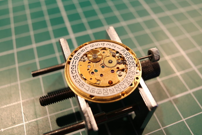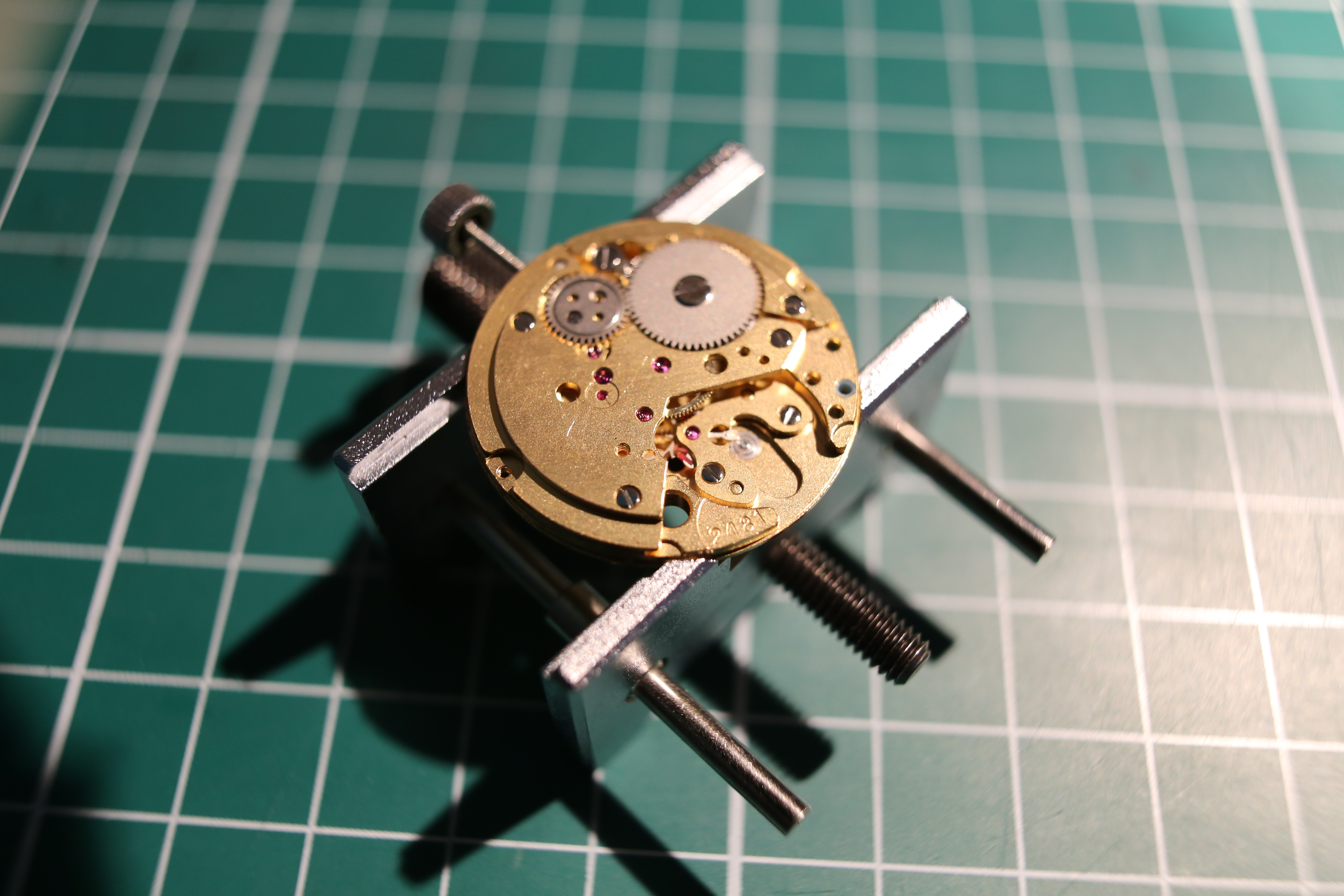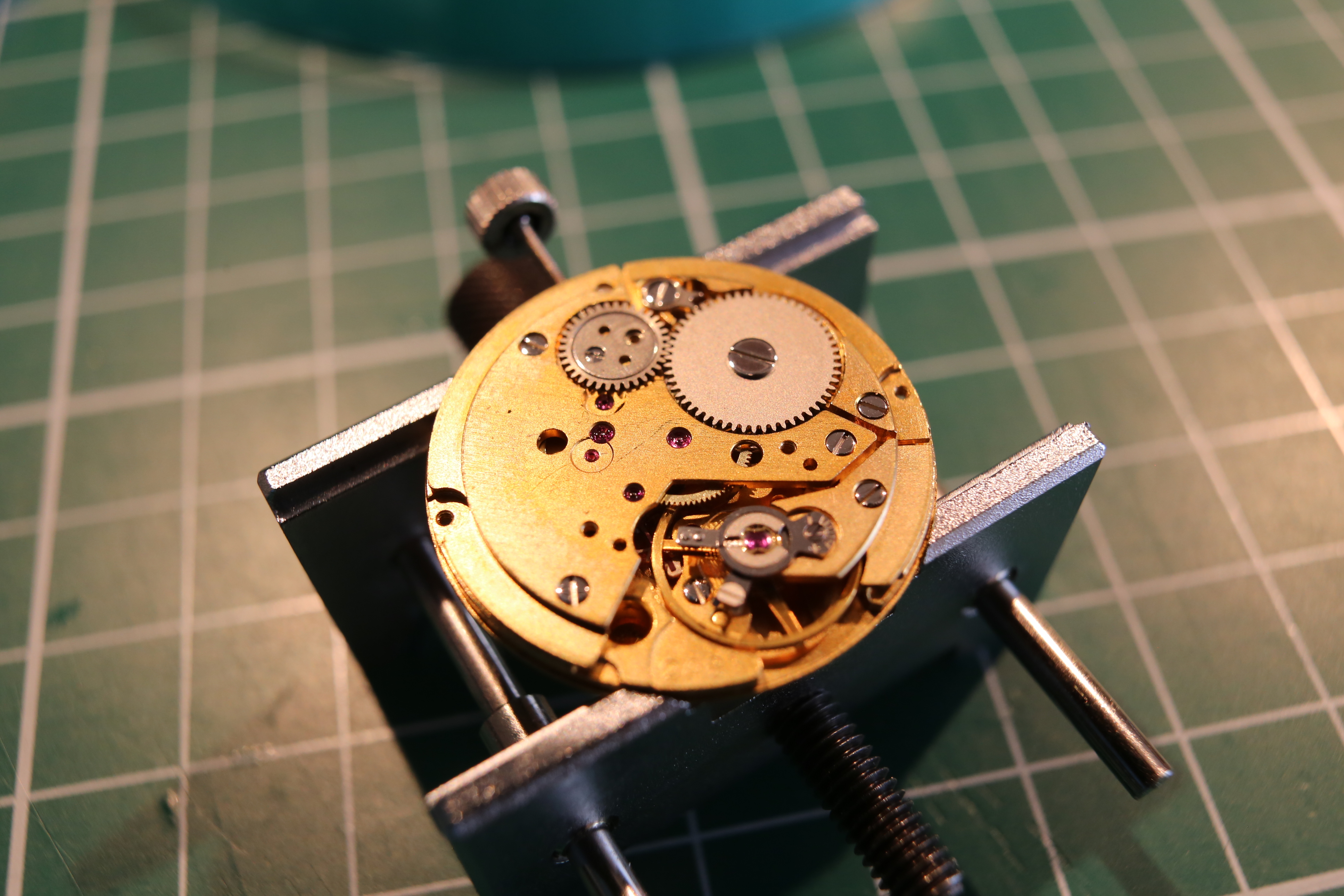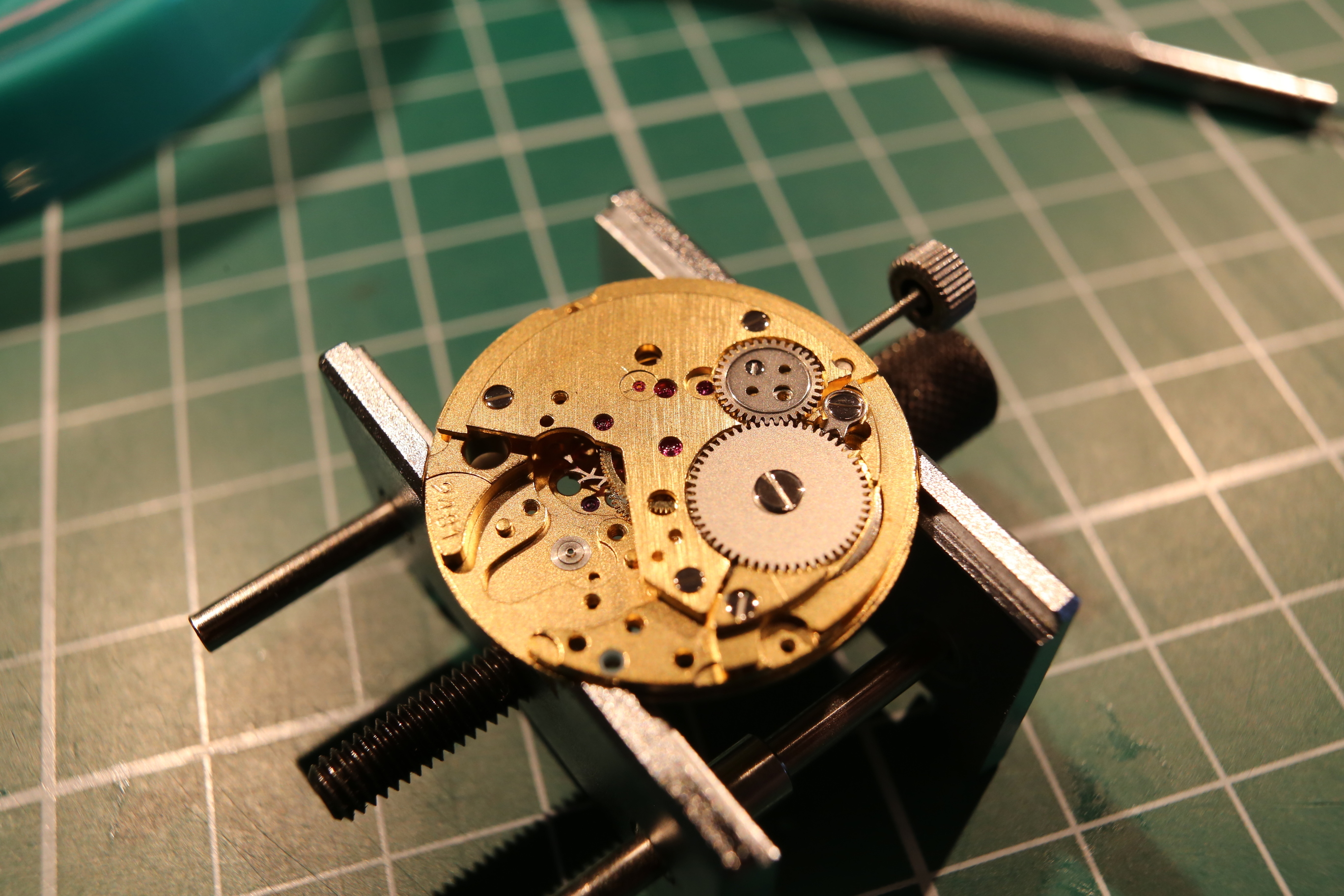 Uurwerk in de kast en stift plaatsen. De gangbare mening is dat je de stift bij dit uurwerk in wijzerverzetstand moet verwijderen en terugplaatsen; ik doe dat juist altijd in opwindstand, heb ik betere ervaringen mee.