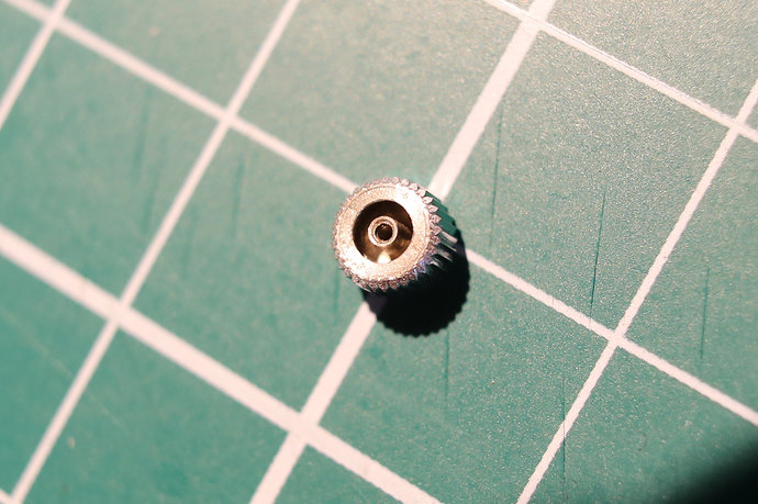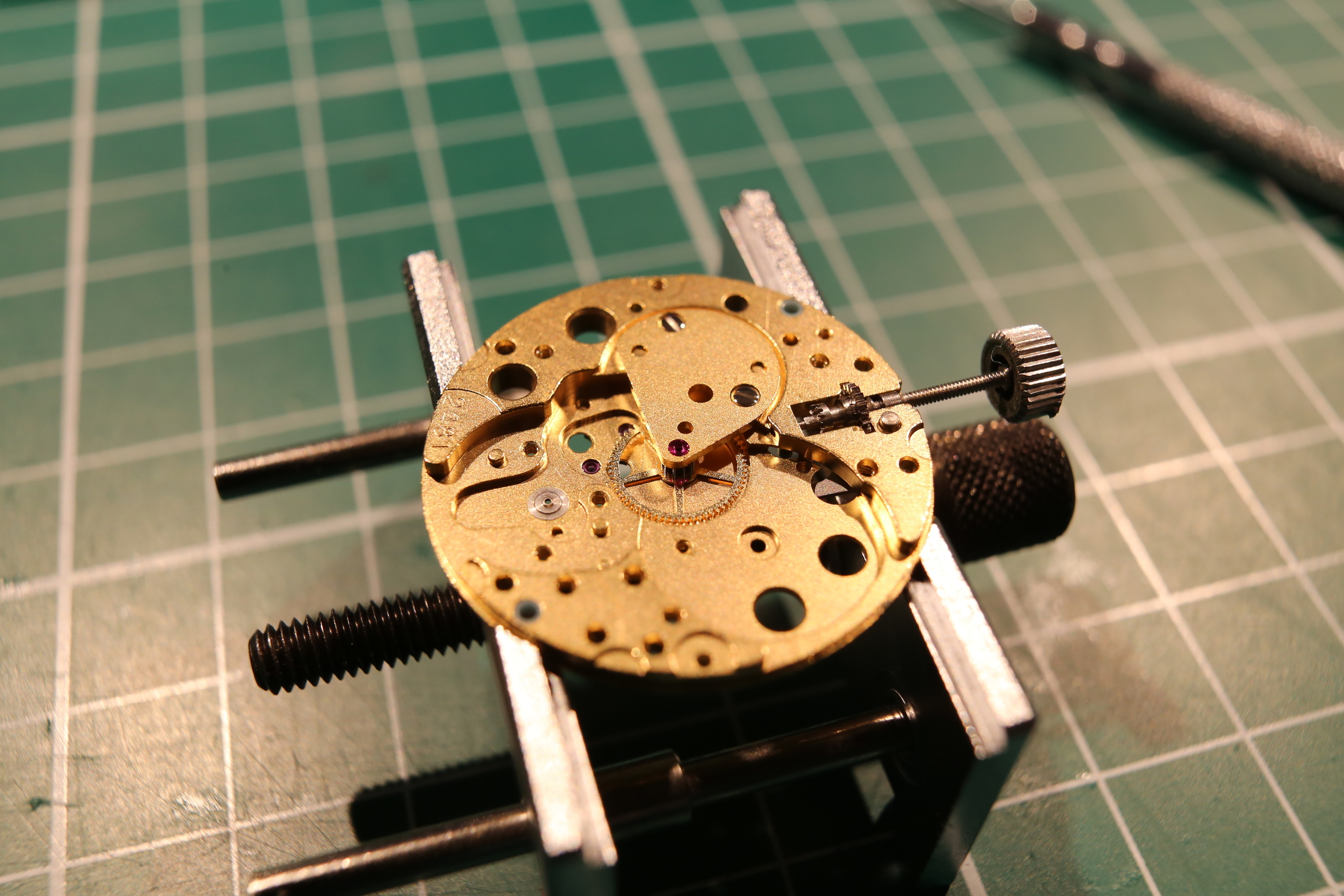 Opbouwen van het uurwerk begin ik altijd met het plaatsen van de stift en het opwind- en wijzerverzetsysteem; dat vergemakkelijkt het hanteren van het uurwerk. De originele kroon heeft nogal een oplawaai gehad, maar ik heb een identieke in m’n kronenvoorraad, dus die vervang ik later nog even.