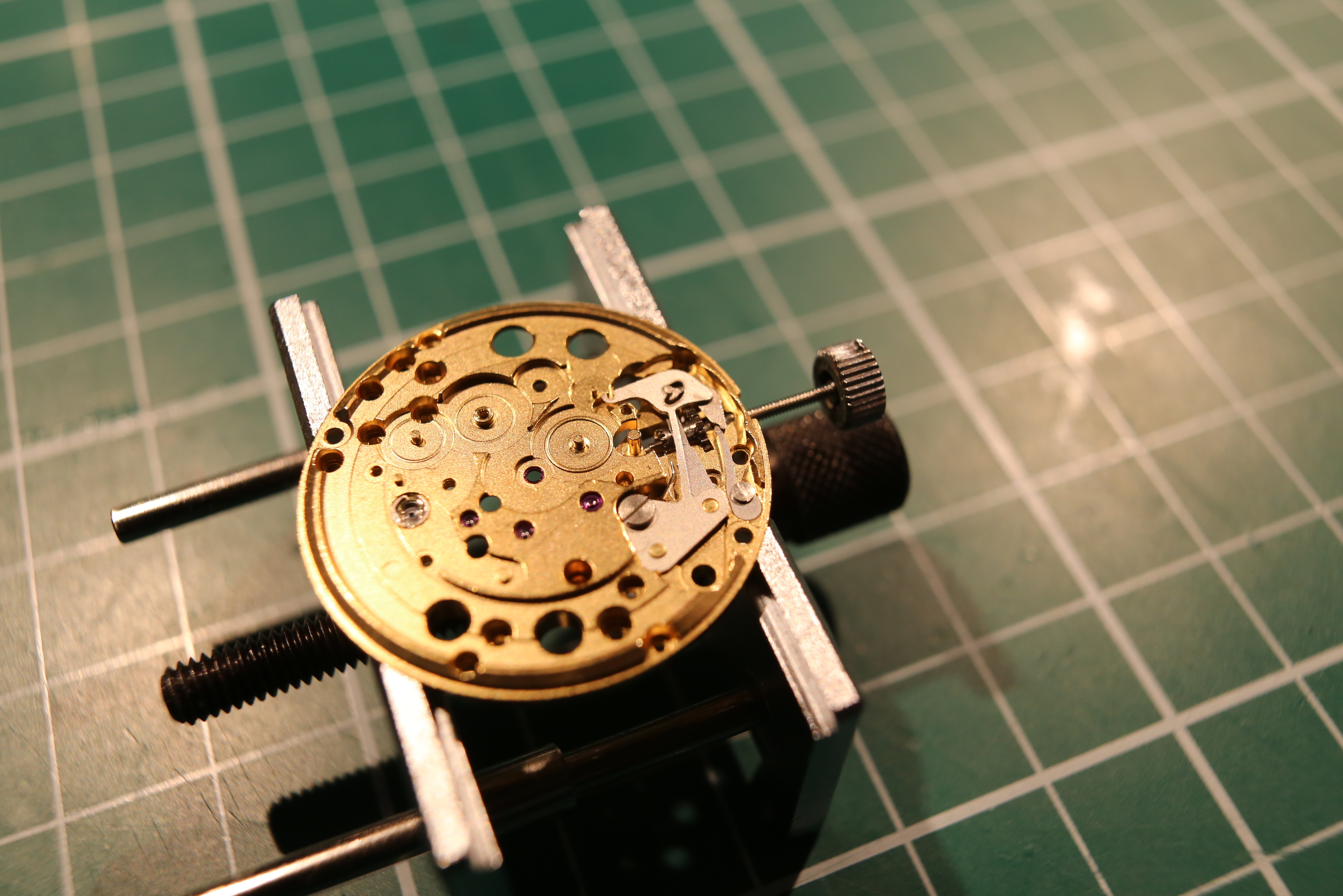 Demontage is klaar, alle uurwerkdelen (behalve de datumschijf) krijgen een ritje in de schoonmaakmachine. Ik begin met het plaatsen van de nieuwe veer in de veerton: