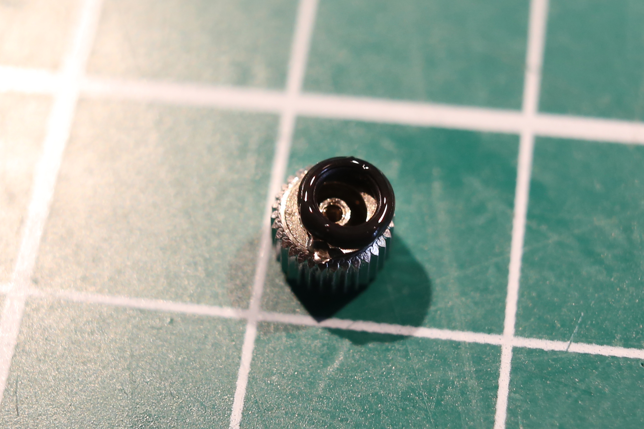 De kroon uit m’n voorraadje is optisch netjes, maar de o-ring is net zo vergaan als die in de kast. Daar moet dus een nieuwe in. Dat is even pielen, maar meestal lukt dat wel. Ik heb een oude speld met een kromme punt waarmee in de prut uit de kroon verwijder.