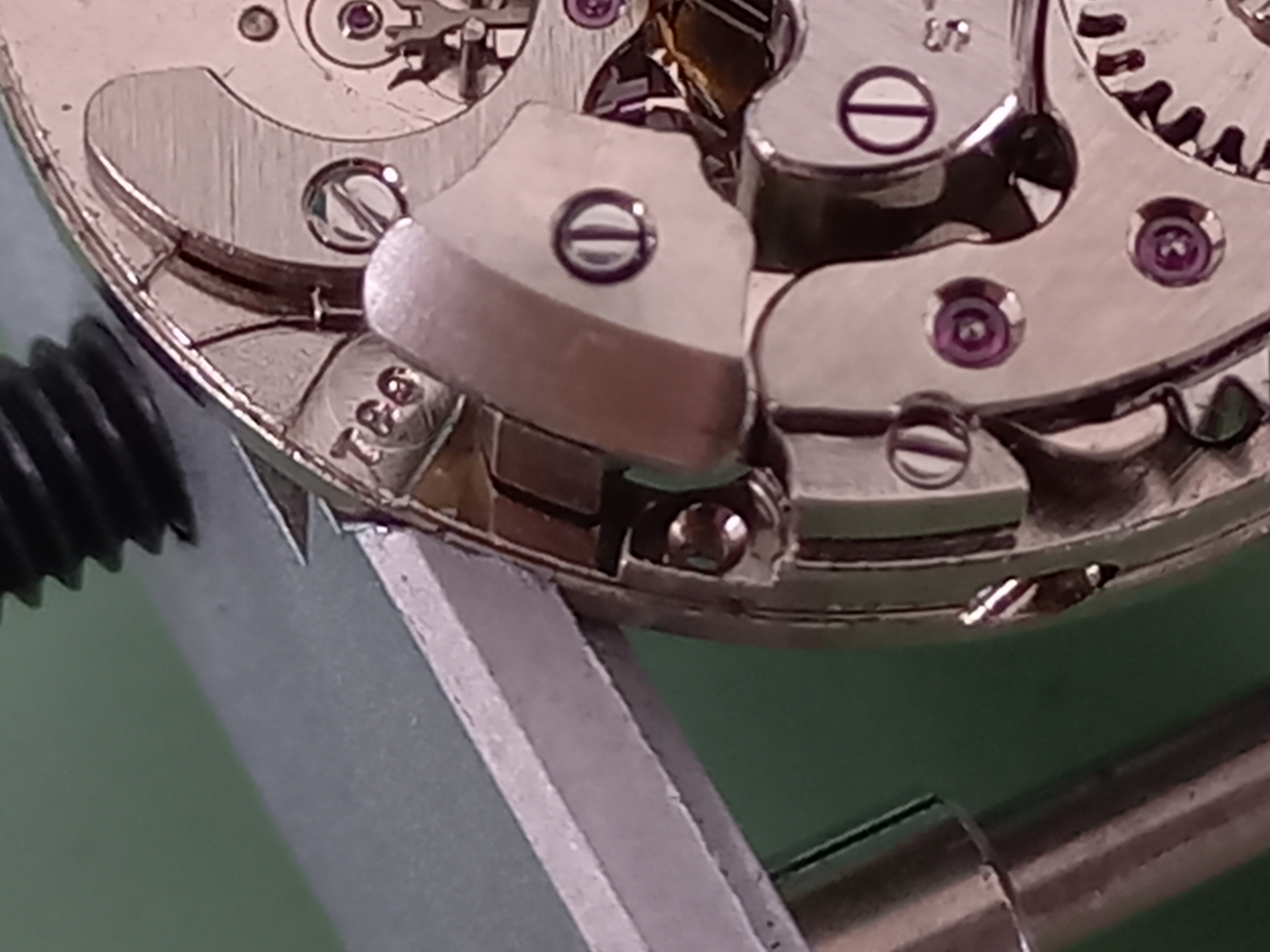 Bij de tweede kroon is “where the magic happens”. Bij ingedrukt wordt de veerton opgewonden door het losse tandwiel onder de veerton. Bij uitgetrokken gebeuren er meerdere dingen. Door een “rotte-boobytrap-achtige-miniscule-wegspringende-tyfus-veertje” (nummer 4!!!), die met een schroef vast zit (1) wordt een brug met twee tandwieljes gekanteld (2) waardoor het wijzerverzetsysteem via het opwindsysteem werkt. Erg goed gevonden.