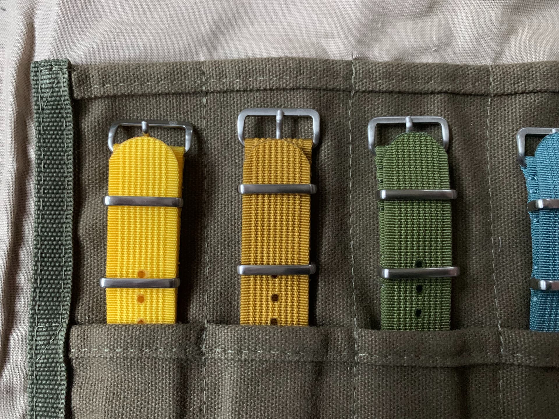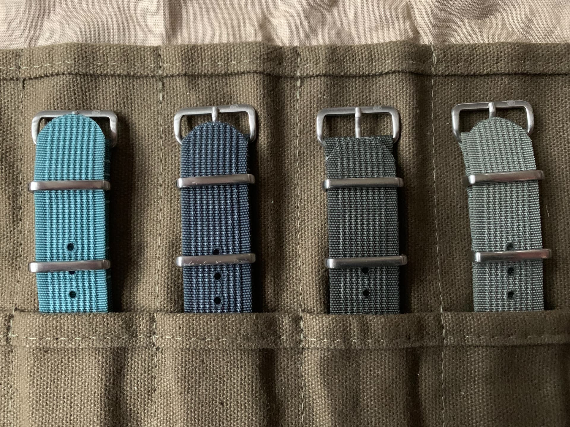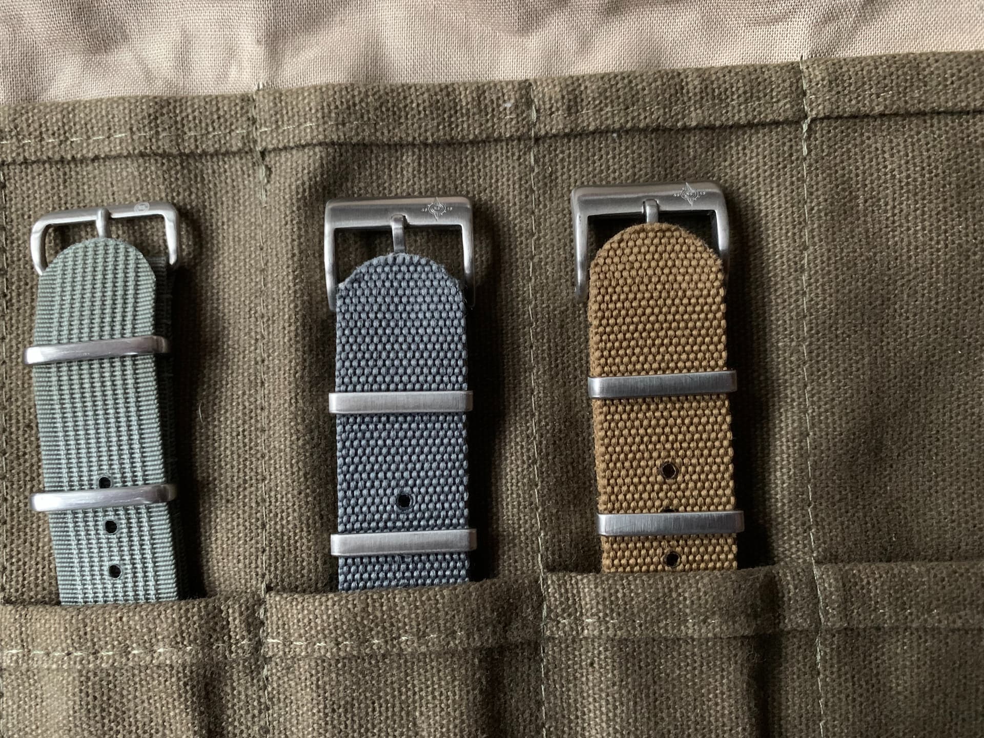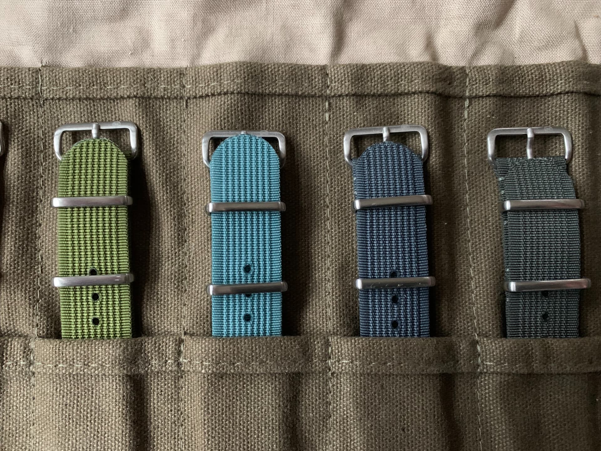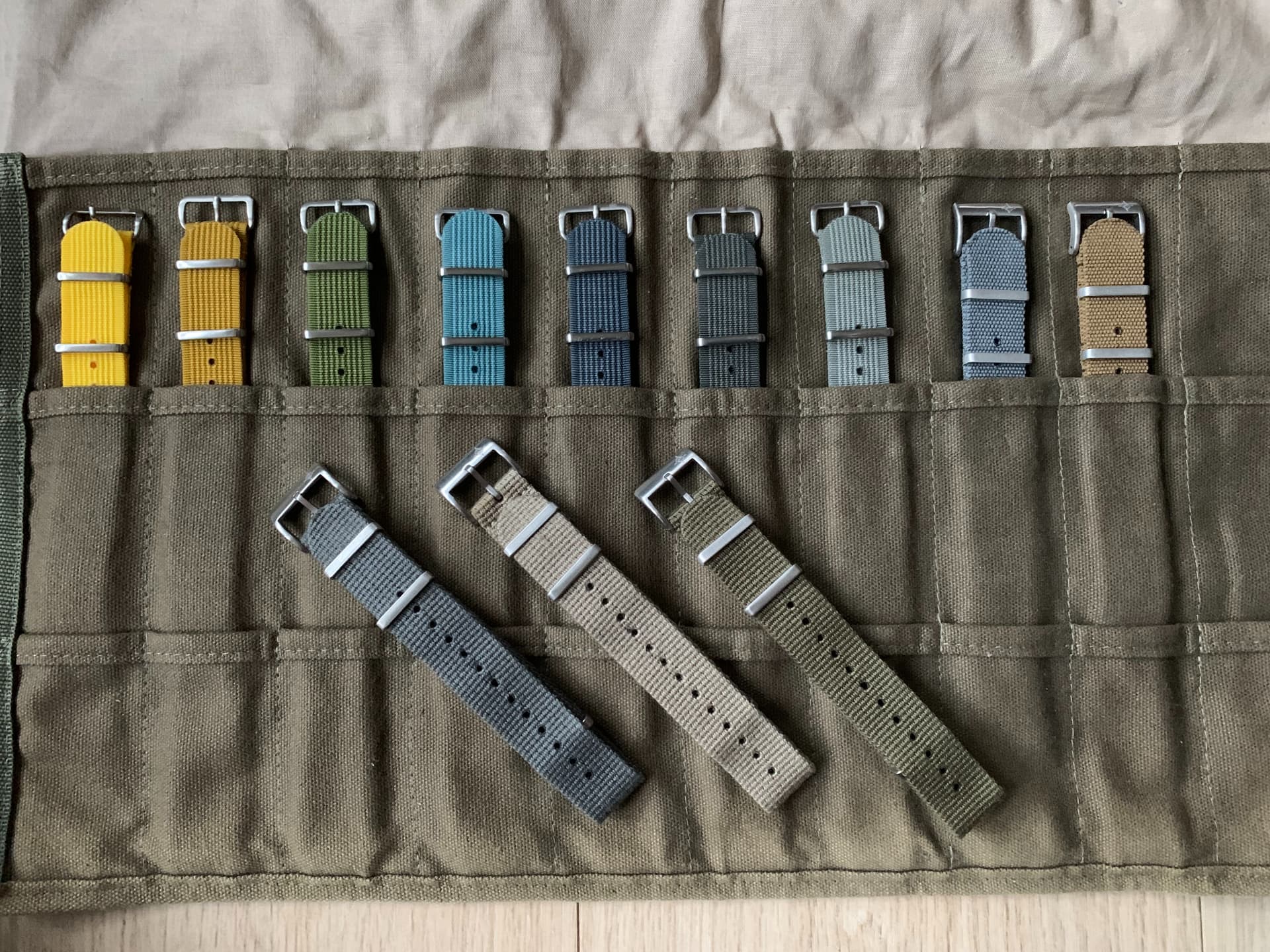 Te koop een set nato straps 20mm. Meerdere kleurtjes en verschillende materialen: 7 ribbed, 3 cotton en 2 premium. Veel zo goed als ongedragen. De strap roll zit er niet bij