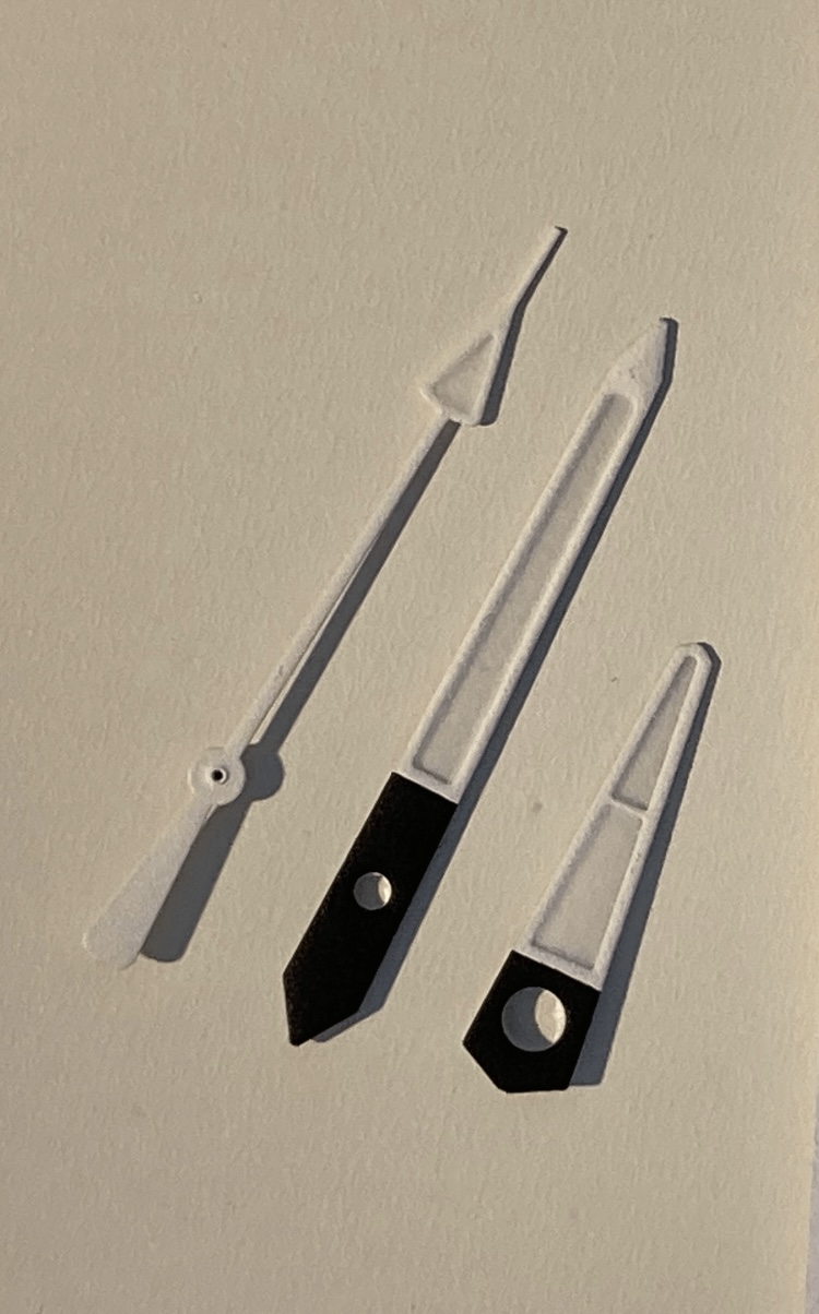 Afmetingen (van as tot punt): Secondewijzer ~14.5mm Minutenwijzer ~ 14mm Uurwijzer ~ 9mm