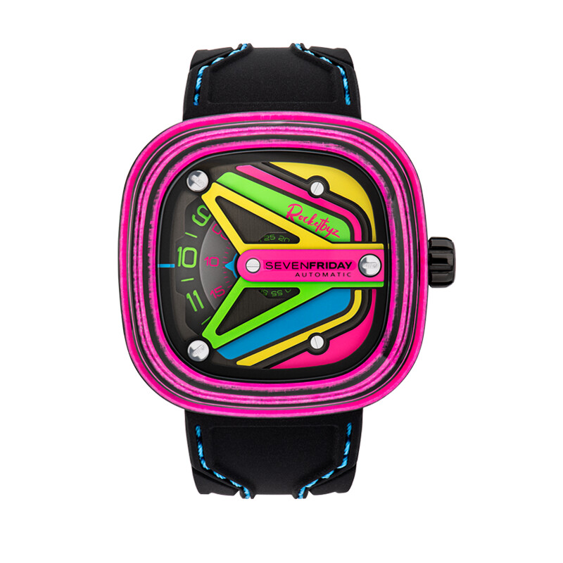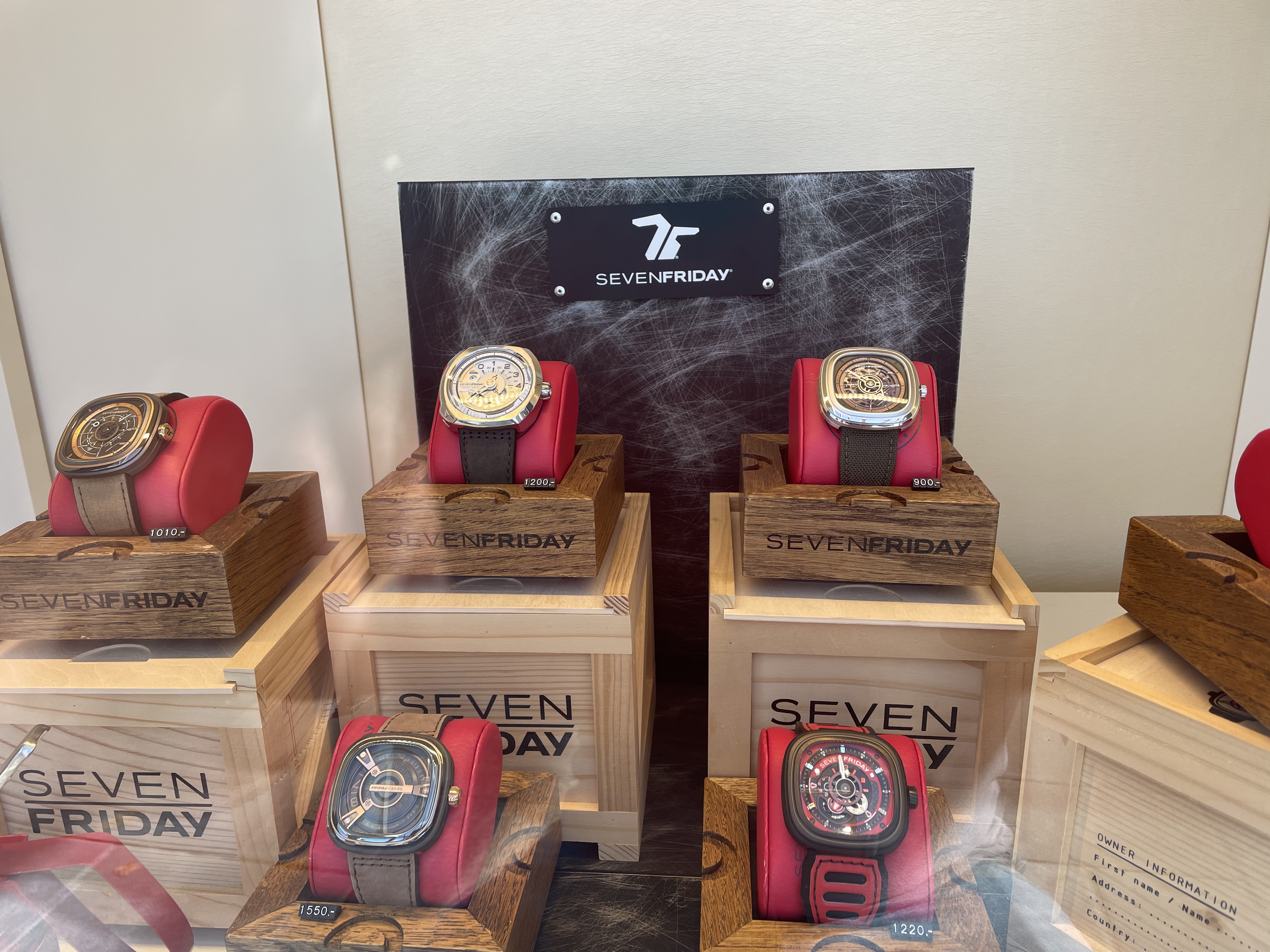 Anyway, in de etalage lagen ook andere topmerken als Blancpain en JLC, evenals Hamilton, Longines, Omega en Tag. Tot mijn verbazing lag er ook een aantal horloges van een merk dat mij compleet onbekend was: SevenFriday. Nu zijn er natuurlijk veel meer horloges die me niets zeggen, maar in mijn ogen misstonden deze horloges toch een beetje tussen hun collega’s van de andere merken. Uiteraard een kwestie van smaak, maar ik vind er werkelijk niks aan.