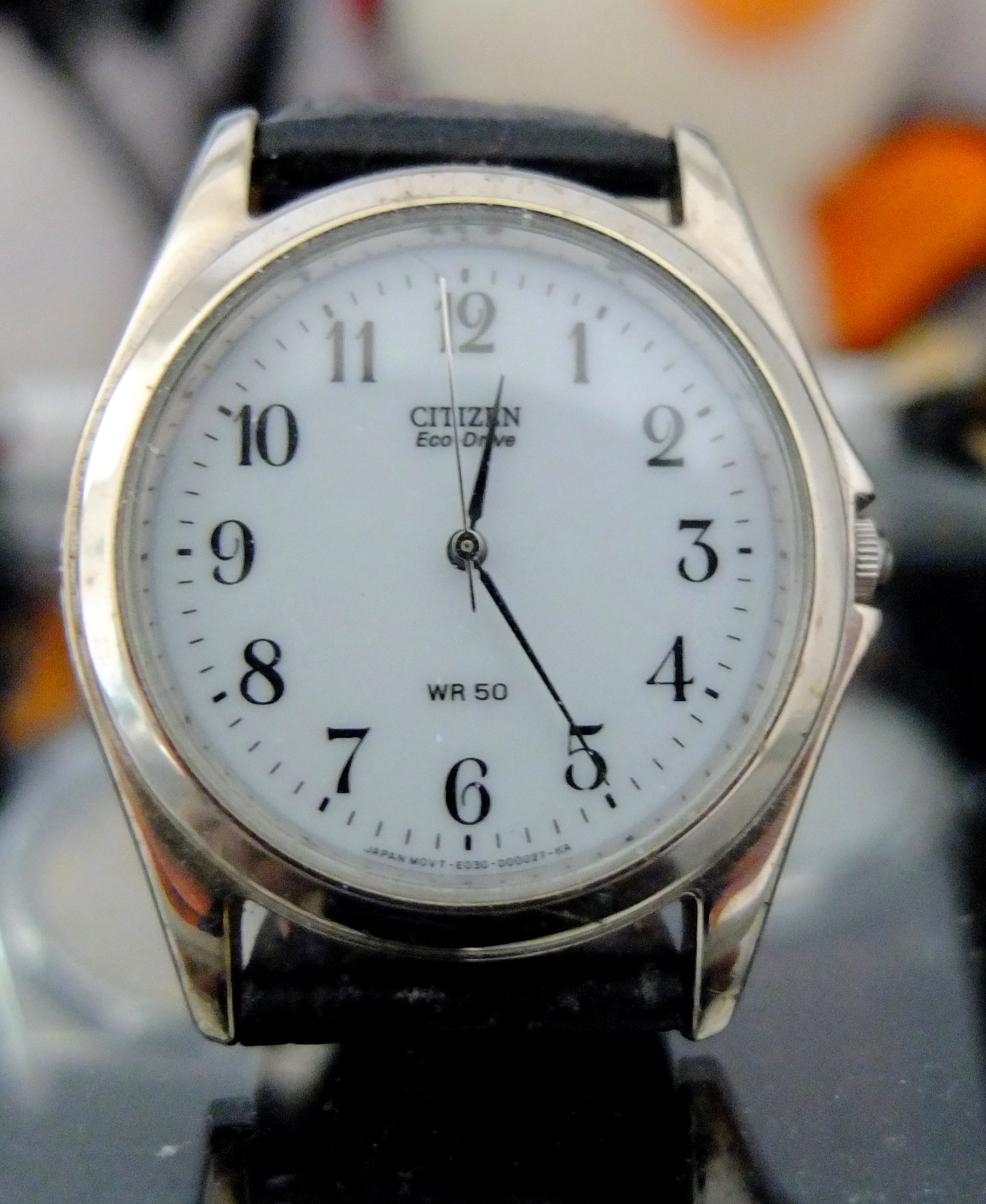 Ik heb al minstens 10 jaar een eenvoudige Citizen Eco Drive die al die jaren probleemloos de tijd heeft aangegeven. Zo nauwkeurig dat het lange tijd mijn referentie horloge was. Niet aan de pols, maar op mijn bureau, om de andere horloges mee gelijk te zetten. Maar nu, sinds enkele weken gaat na al die tijd de accu problemen geven. Als ie een paar dagen geen goed zonlicht krijgt, gaat de seconden wijzer met grote sprongen lopen, hij loopt soms ineens erg achter en de laatste dagen staat ie af en toe helemaal stil. Dat wijst op het einde van de levenduur van het accuutje. Ik moet dus even uitvissen wat voor accu er in hoort en waar ik die kan bestellen.