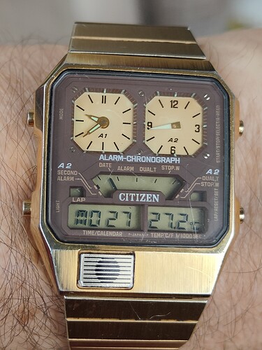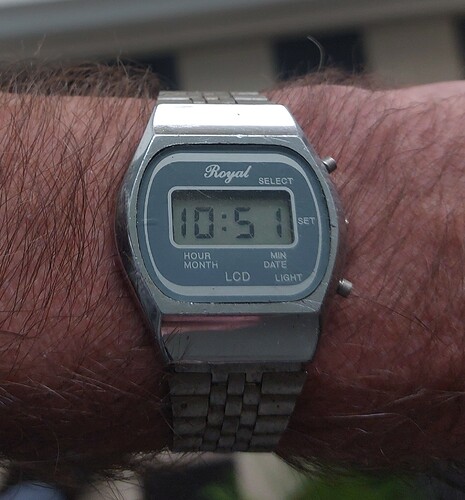 De knop erboven is om te schakelen naar dual time. Volgens mij ook 1 van de eerste LCD horloges met 24:00 uurs tijdsaanduiding.