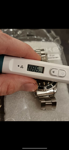 Daarmee zie al direct dat afstand houden loont. Kijk eens wat je meet aan de achterkant? Zal lager zijn door de afscherming van het metaal. Altijd uitlezen in uSv/uur, CPM zegt niet zoveel. De dosislimiet op je huid (pols) is 50000 uSv per jaar dus dit horloge kun je probleemloos regelmatig dragen.