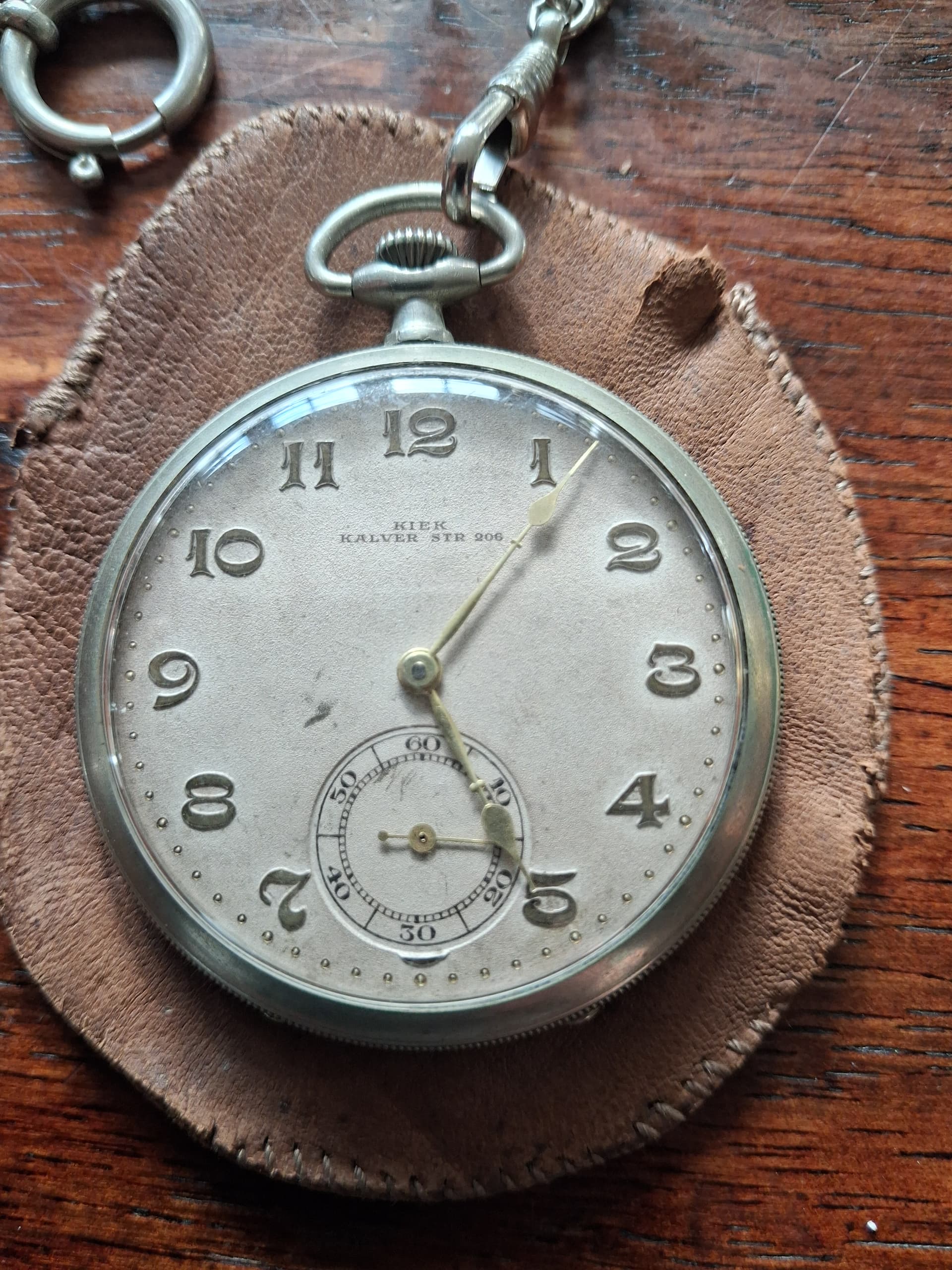 Cylindergang zakhorloge. Geen dure, wel leuk in de doos zo, met ketting, sleuteltjes en een (origineel?) Bulls eye glas