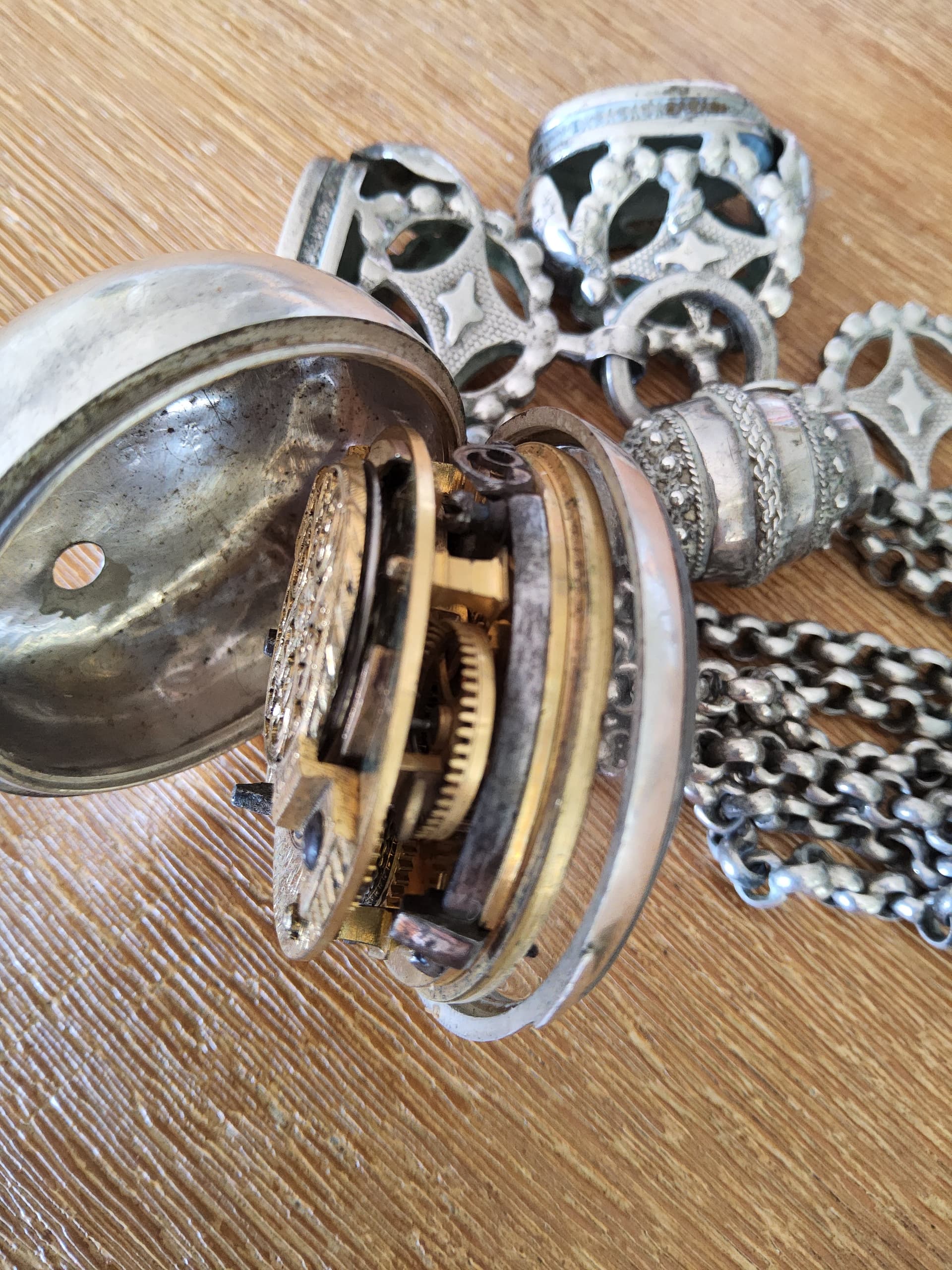 Gekregen uit de familie…een J. Wilders uit London, waarschijnlijk rond 1780 volgens internetbronnen. Helaas loopt ie niet. Ik ben er nog niet emotioneel aan verbonden maar het kriebelt wel een beetje om hem te laten bekijken door een Hf’er of andere specialist. Heeft iemand een tip of aanvullende informatie over dit horloge? Naast dit horloge ook nog een paar andere gekregen die ik apart ga posten. Bedankt alvast voor het meedenken!