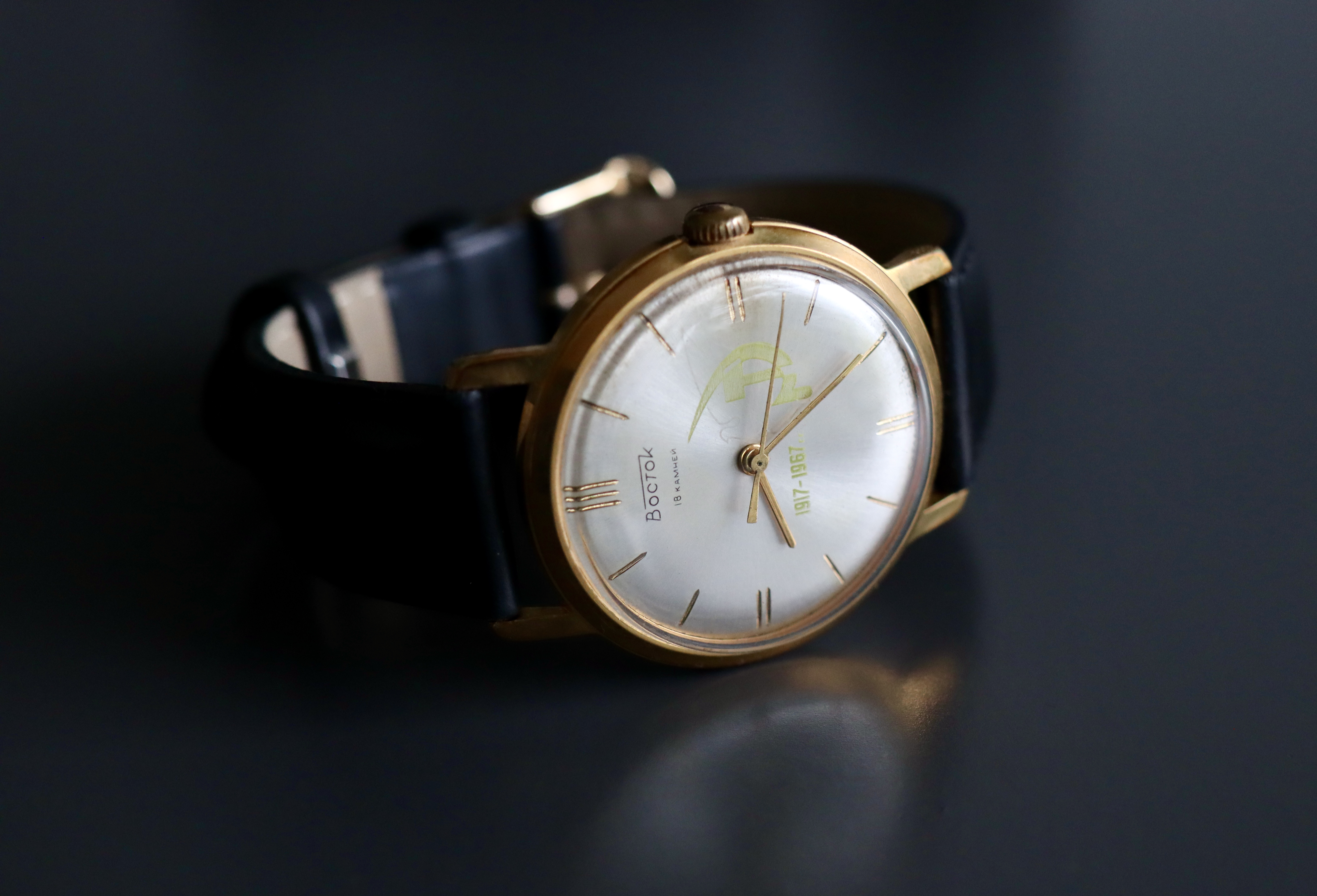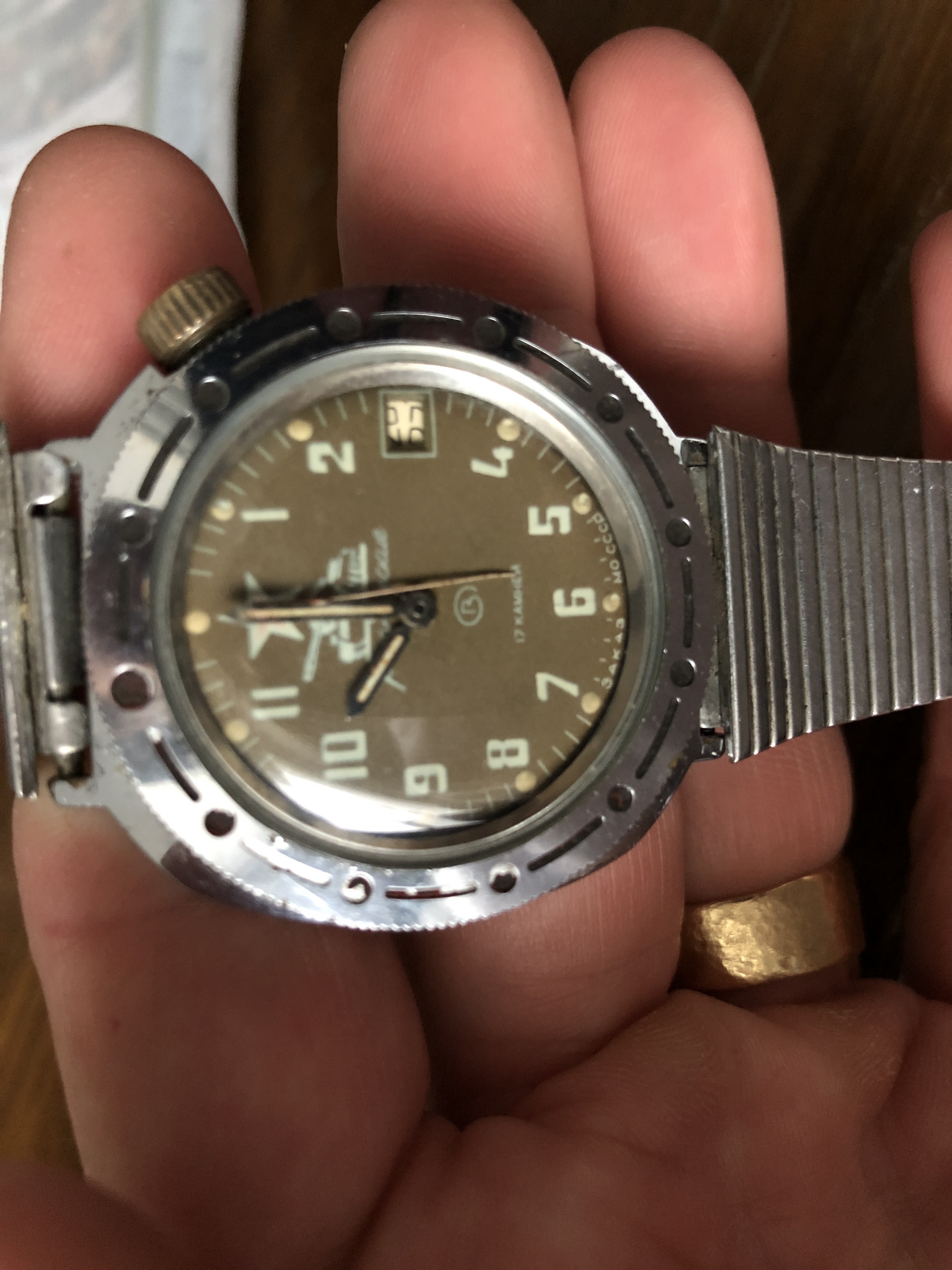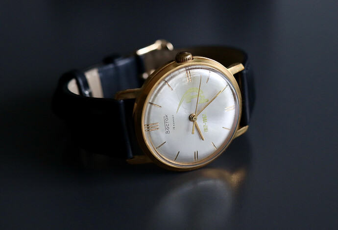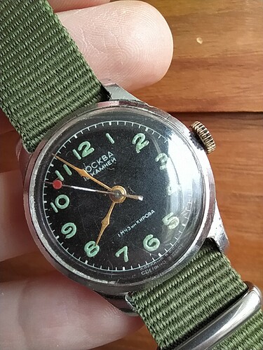 M’n stoere militaire Soviet handwindertje: de Mockba 1MChZ Kirova (Первый Московский Часовой Завод, ПМЧЗ, later Poljot) 16 juweeltjes. Geen idee van de leeftijd (50’s?) en het uurwerk (2408?). Het luide, vastberaden motortje, verchroomde kast en de glijdende “Sputnik” secondewijzer maken dit een leuk stukje Soviet geschiedenis. Maar ik draag 'm erg weinig, dus gaat binnenkort het blauwe gedeelte in.