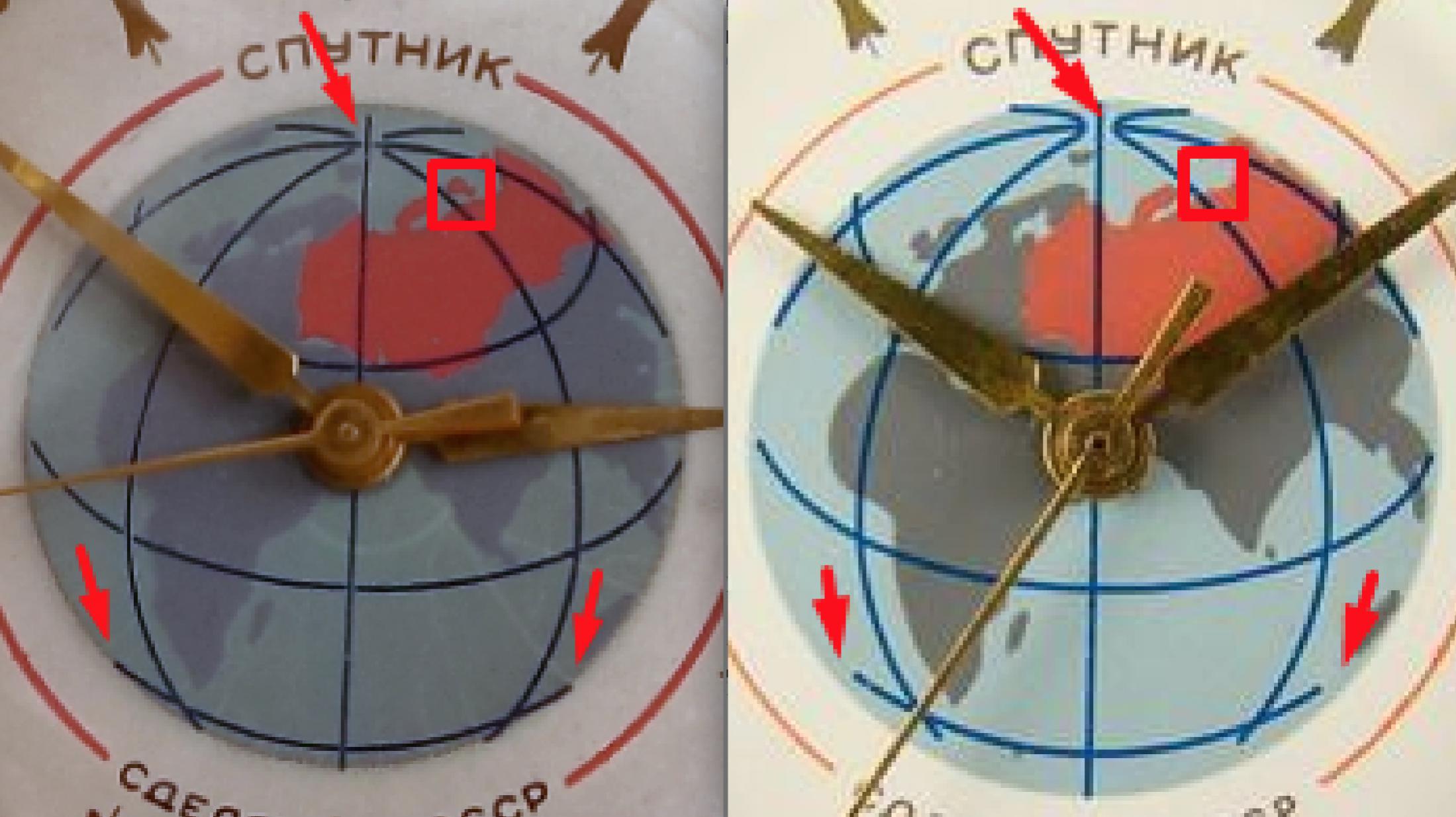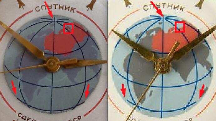 Op de originele wijzerplaat zijn de lijnen iets dunner en lopen meer door. Verder staan er wat eilanden op die je op de fake plaat mist (zie blauwe pijltjes op foto’s die je via de link ziet)