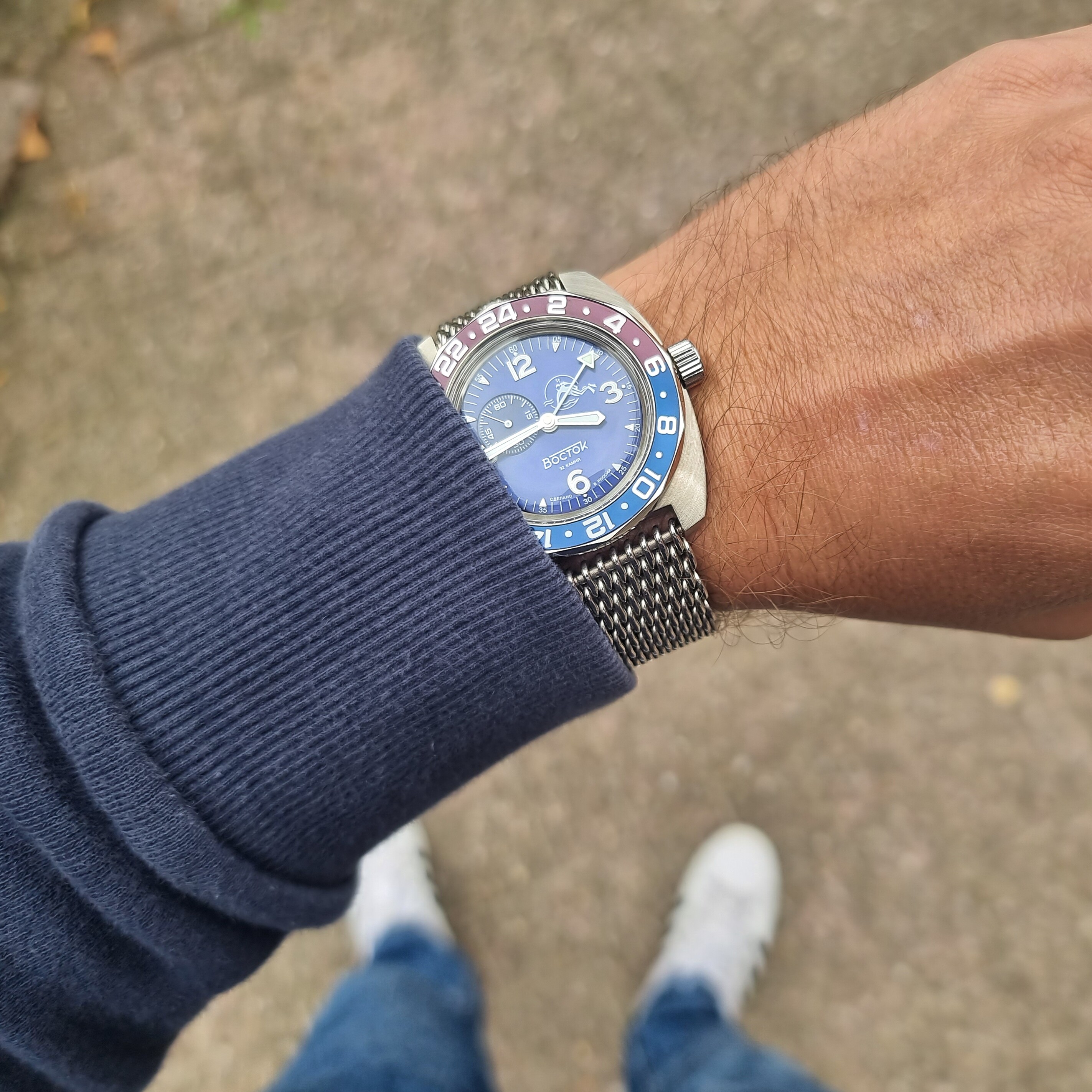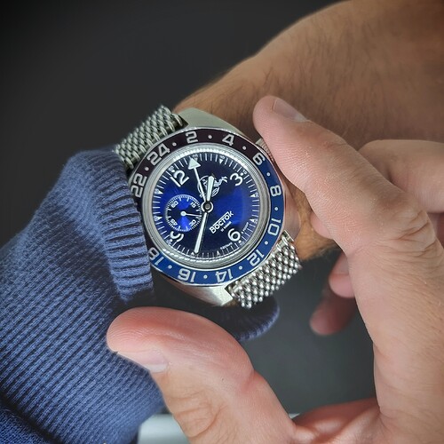 Dezelfde band heeft mij een reparatie van een mooie zilverkleurige Sthurmanskie 3133 opgeleverd. Daar deed ik die eerst op, horloge was net uitgepakt. Ik liep de trap op en had de band niet goed ingehaakt. Dus horloge op de houten vloer vanaf dik 2 meter!