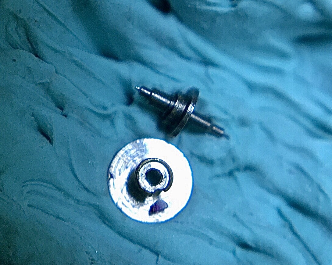 Gezien de mooie uitvoering van de dail en de kast de moeite waard om hier energie in te gaan steken Dat wordt dan maar een totale revisie. Kast gepolijst daar waar nodig en het acryl geschuurd en in de laatste stage gepolijst. Uurwerk geheel gedemonteerd en voordat alles de wasmachine in gaat de onderdelen uitvoerig onder de microscoop gecontroleerd. Kleine glimlach kon ik niet weerhouden toen ik de balans onderwierp aan de check. Tja, dat dit horloge niet wilde lopen was eigenlijk vrij logisch. Aan een kant van de balansas is de pivot afgebroken en liep hierdoor niet in de steen. Dit maakt de diagnose wel heel eenvoudig.