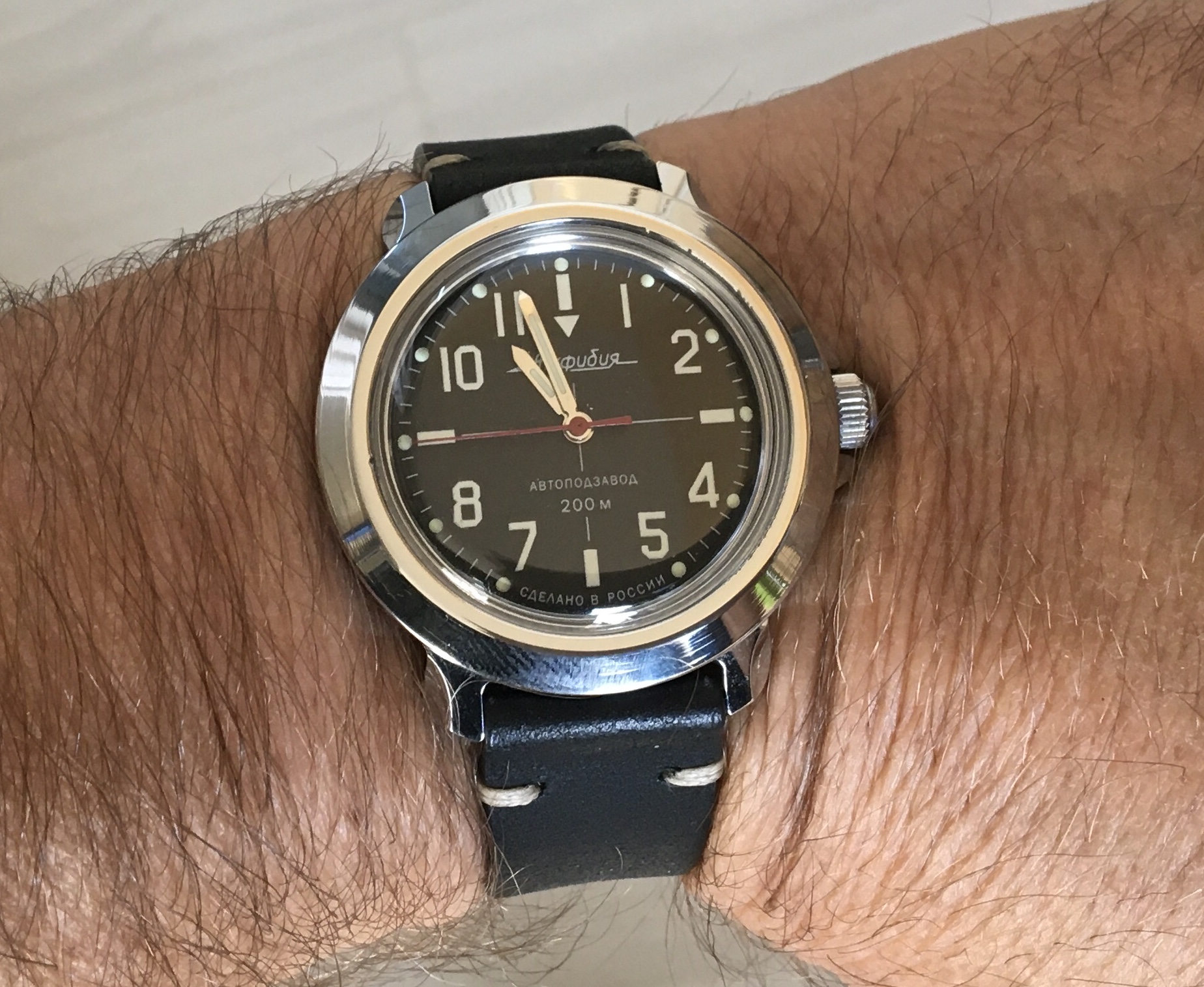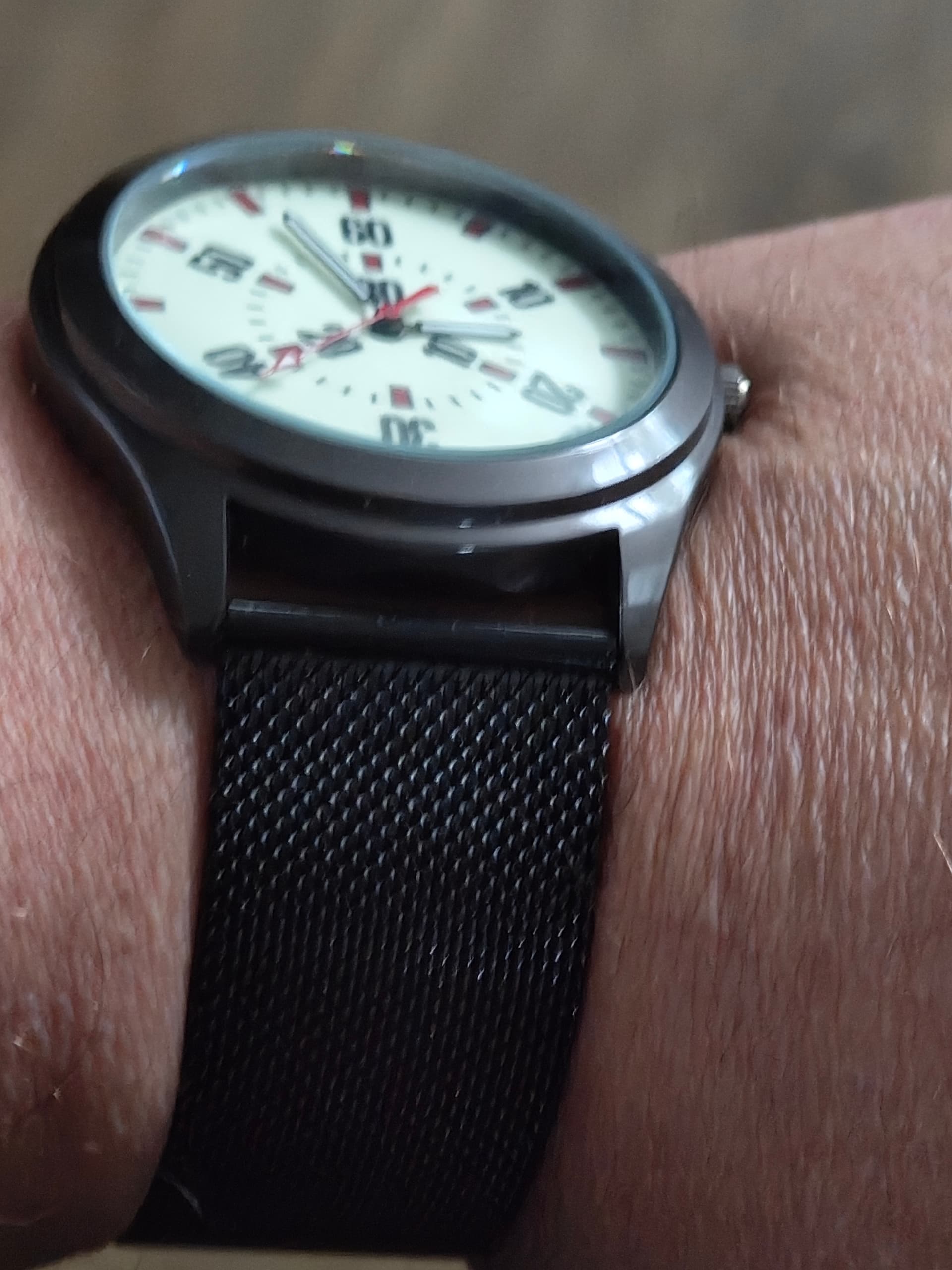 Ik vind het ook helemaal niets, zo’n grauwe kleur. Ik zou 'm eerder op NATO zetten waar iets van de wijzerplaat kleuren in terug komen.