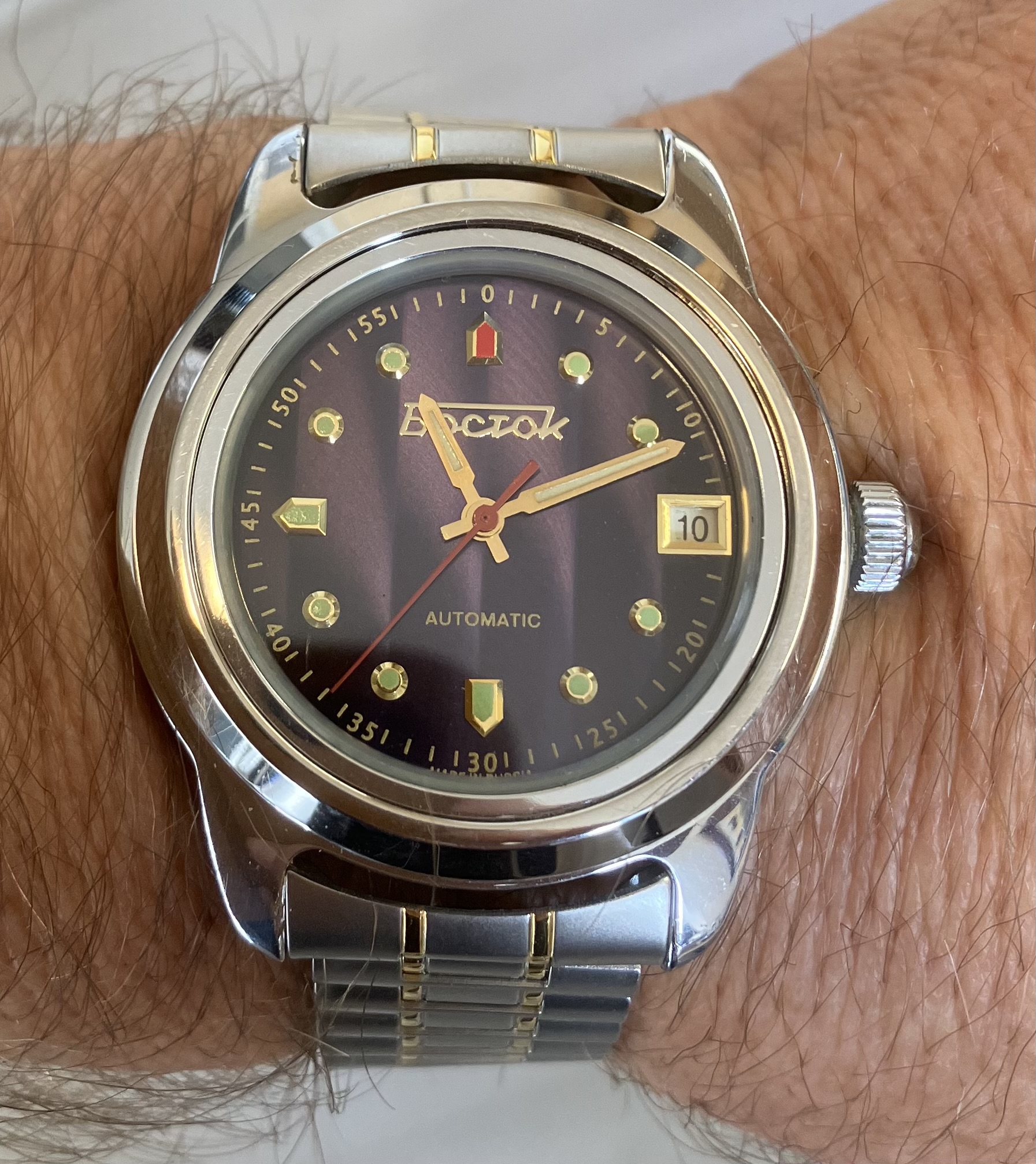 Vandaag speciale Boctok civiele uitvoering met mooie paarse Genève strips op de wijzerplaat.