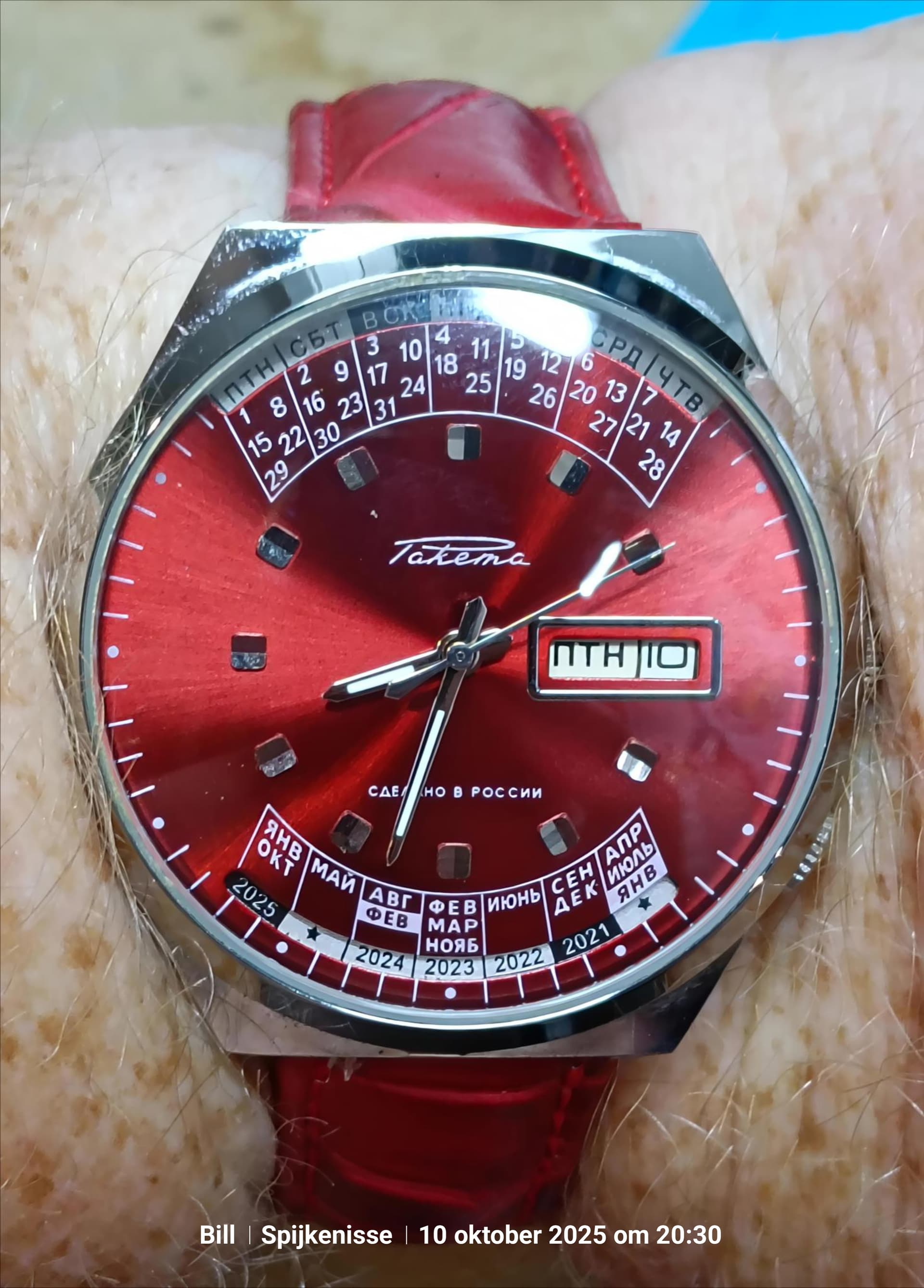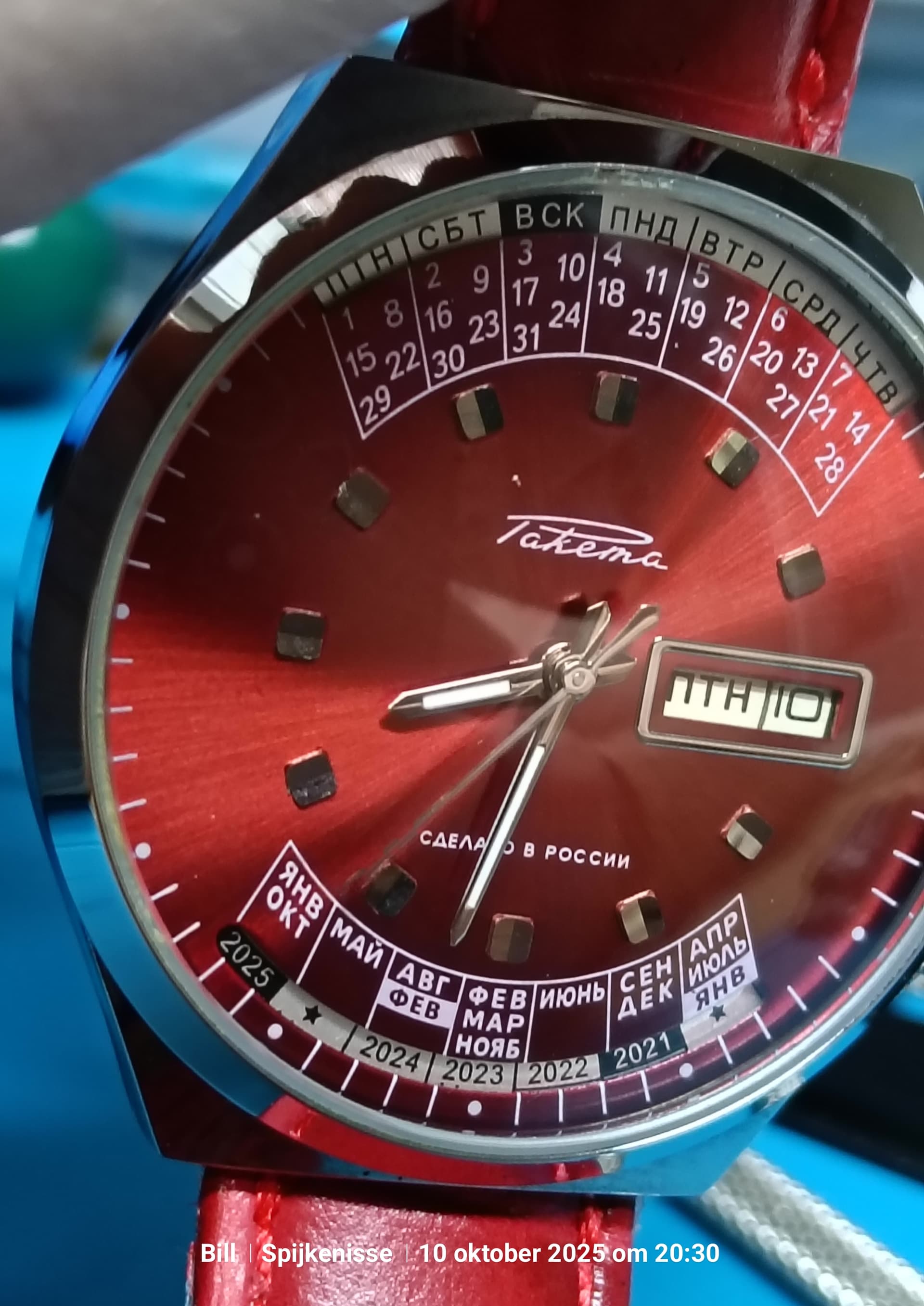 Hoi Bill, kijkend naar je dag/datum zie ik dat het niet midden in het venster staat, komt dat doordat de schijf er net niet goed inzit of door de tand des tijds? Wel mooi die Raketta, zeker die kleur rood