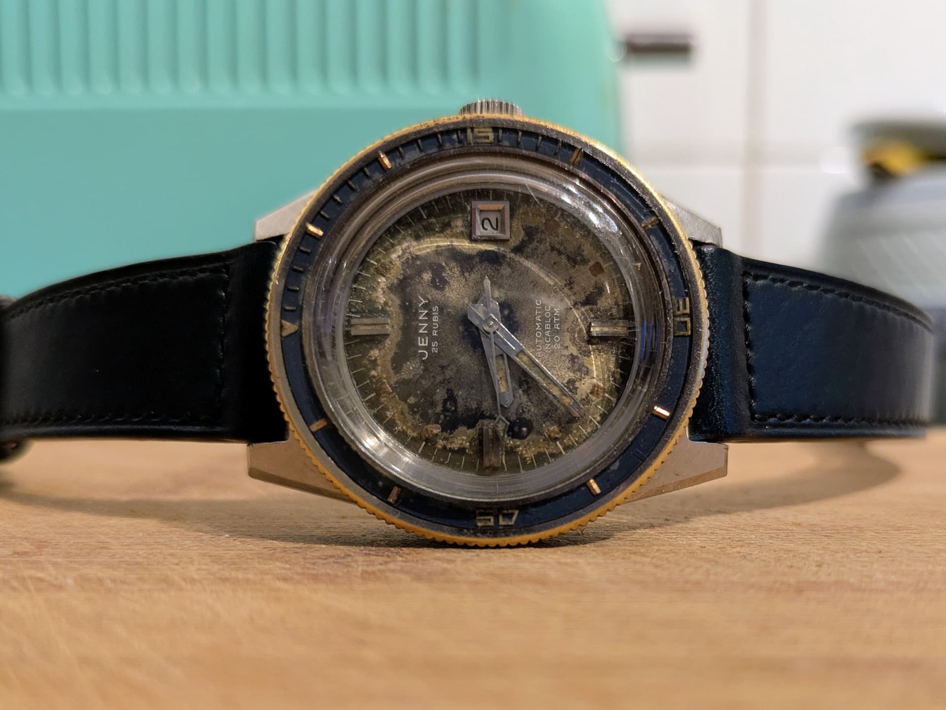 De sunburst is nog steeds subtiel aanwezig ondanks dat de verf er vanaf is, de lume werkt nog steeds als je er een UV-lampje op zet en heeft hetzelfde patina als de wijzerplaat gekregen. Het chroom laagje van de bezel is er compleet af gesleten maar het messing kleurt weer prachtig bij de wijzerplaat en de inlay van de bezel is mooi verweerd blauw met wederom messing accenten.