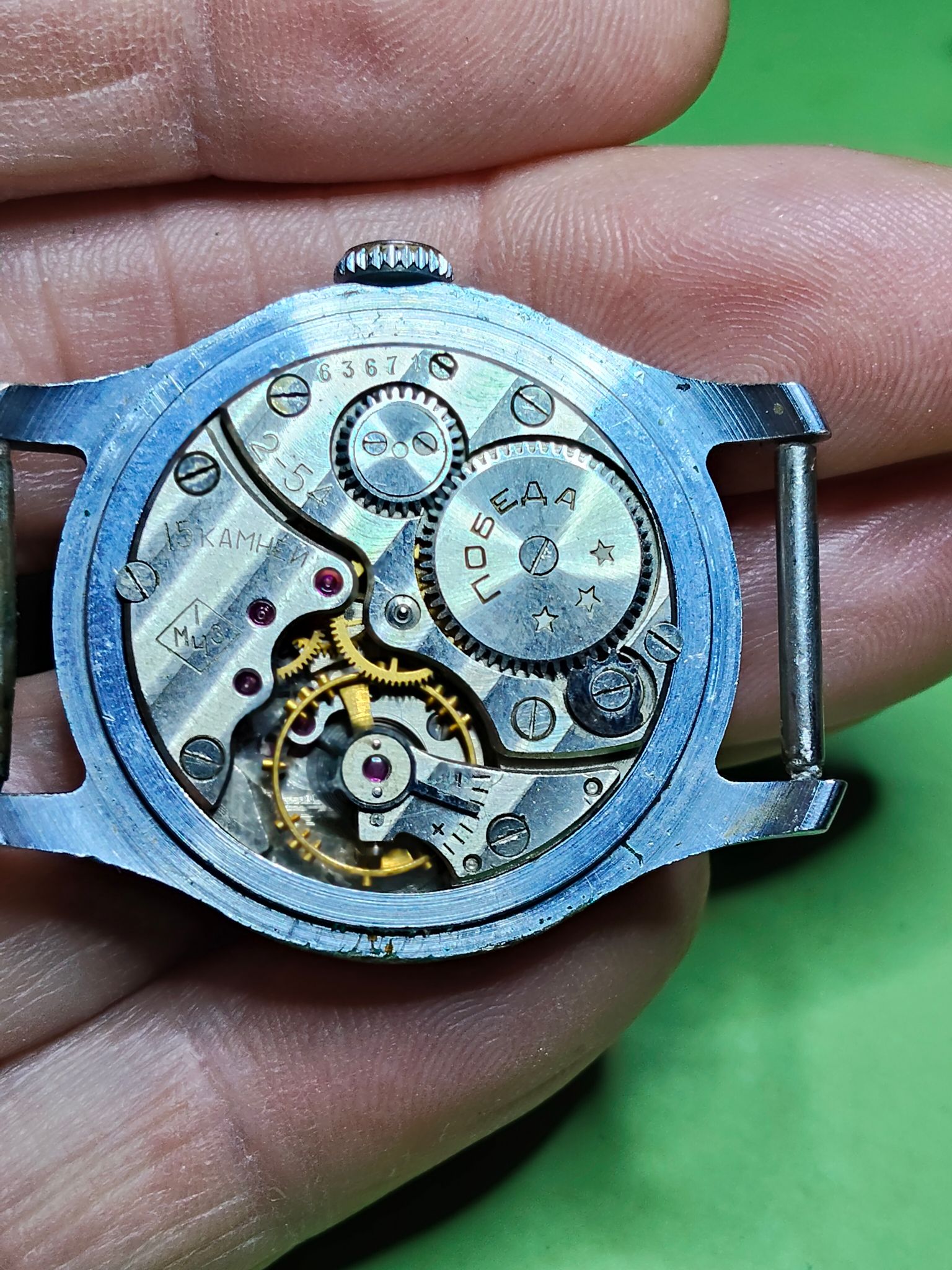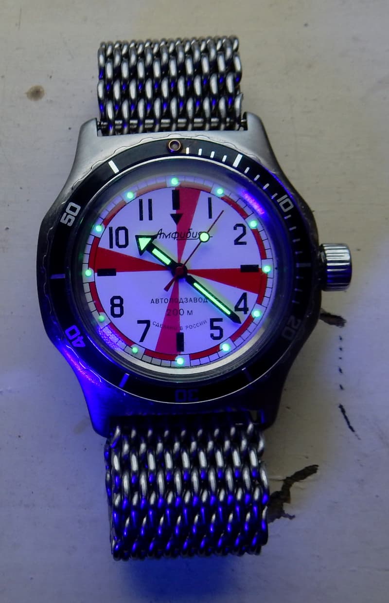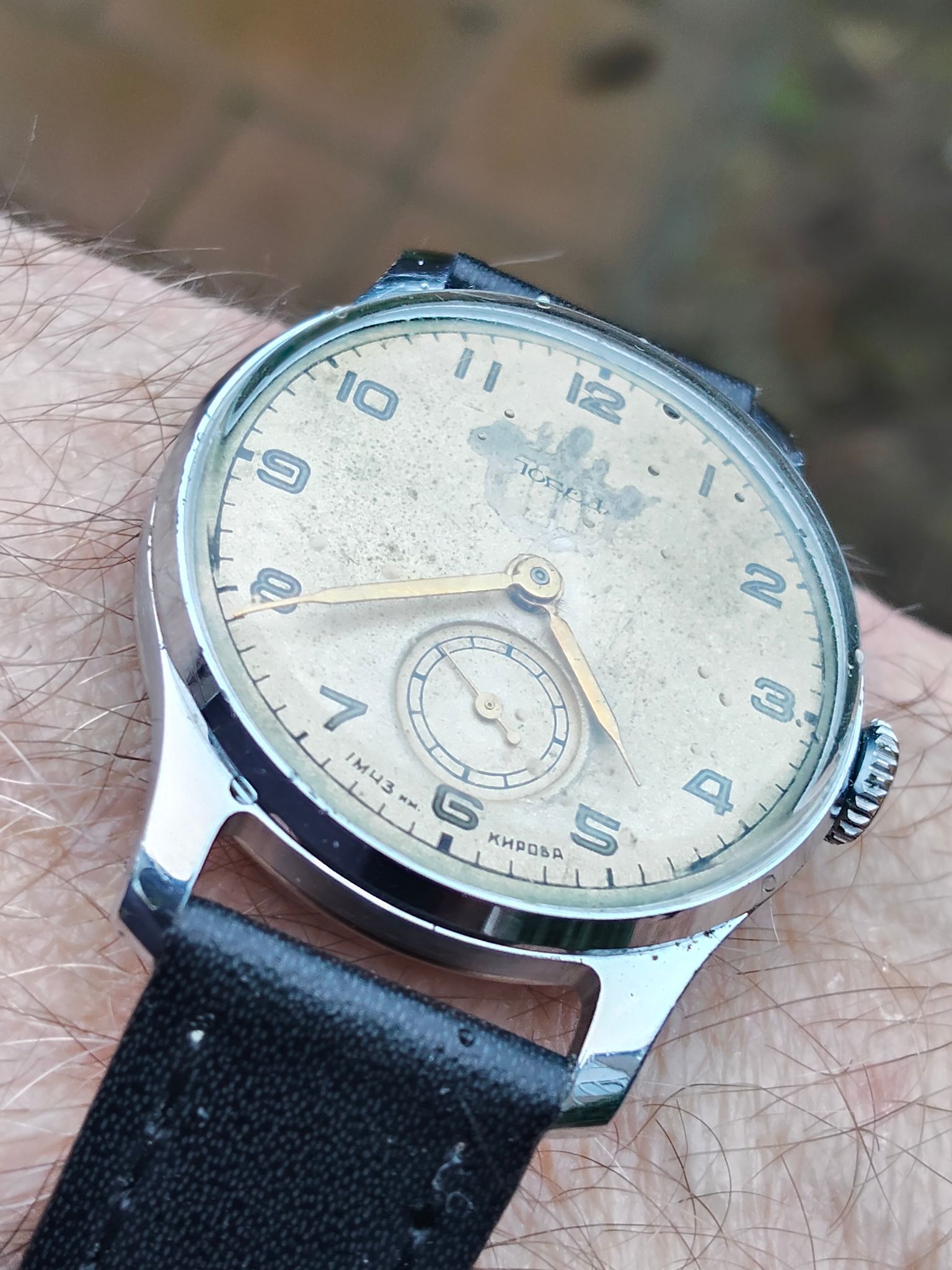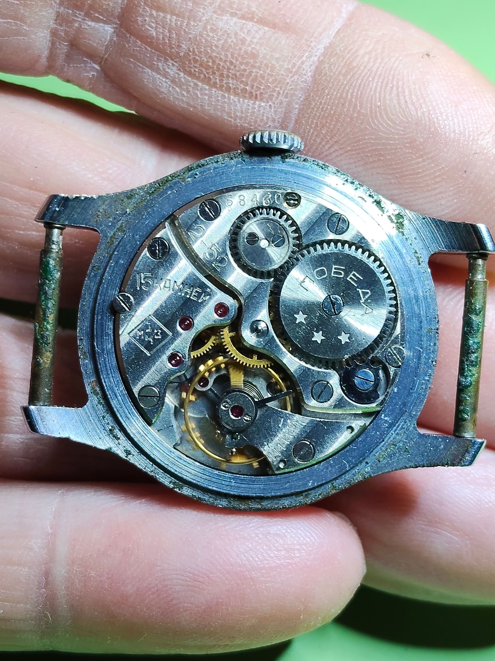 Kwam zojuist dit horloge tegen, ik denk een Pobeda. ik heb de kast even in de ultrasoon gehad en een nieuw bandje aangedaan.