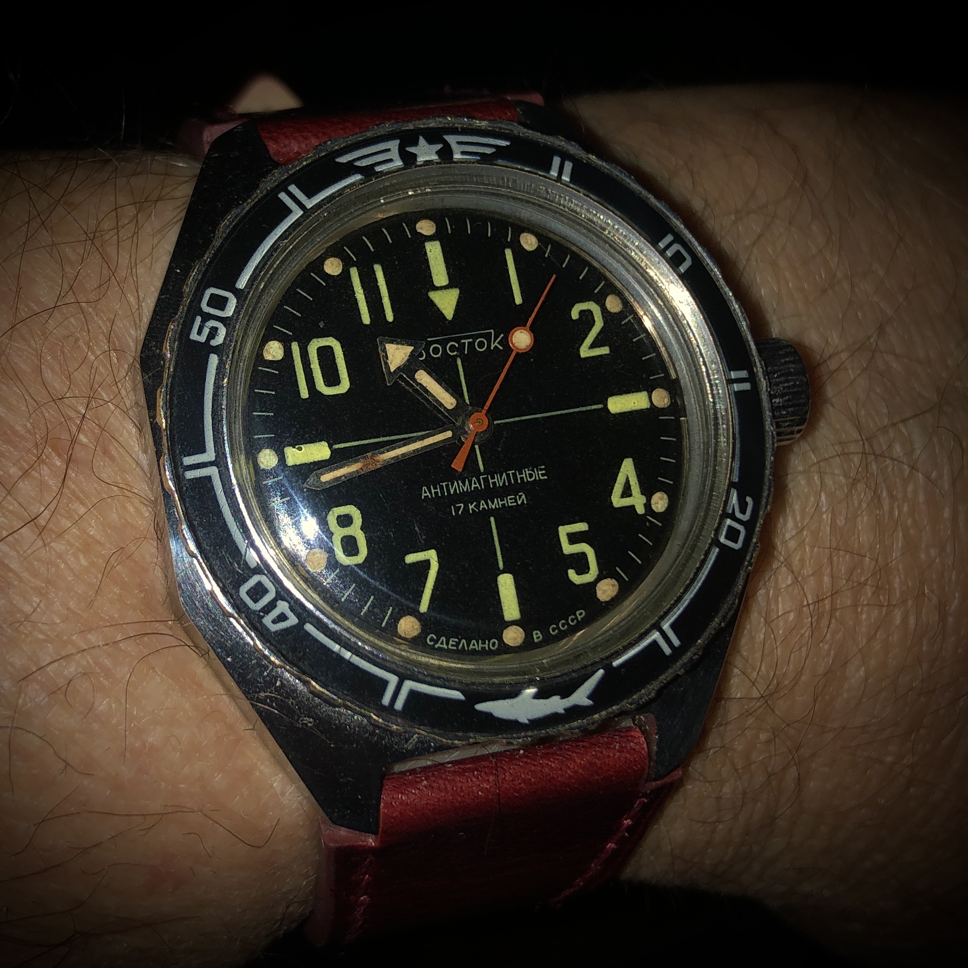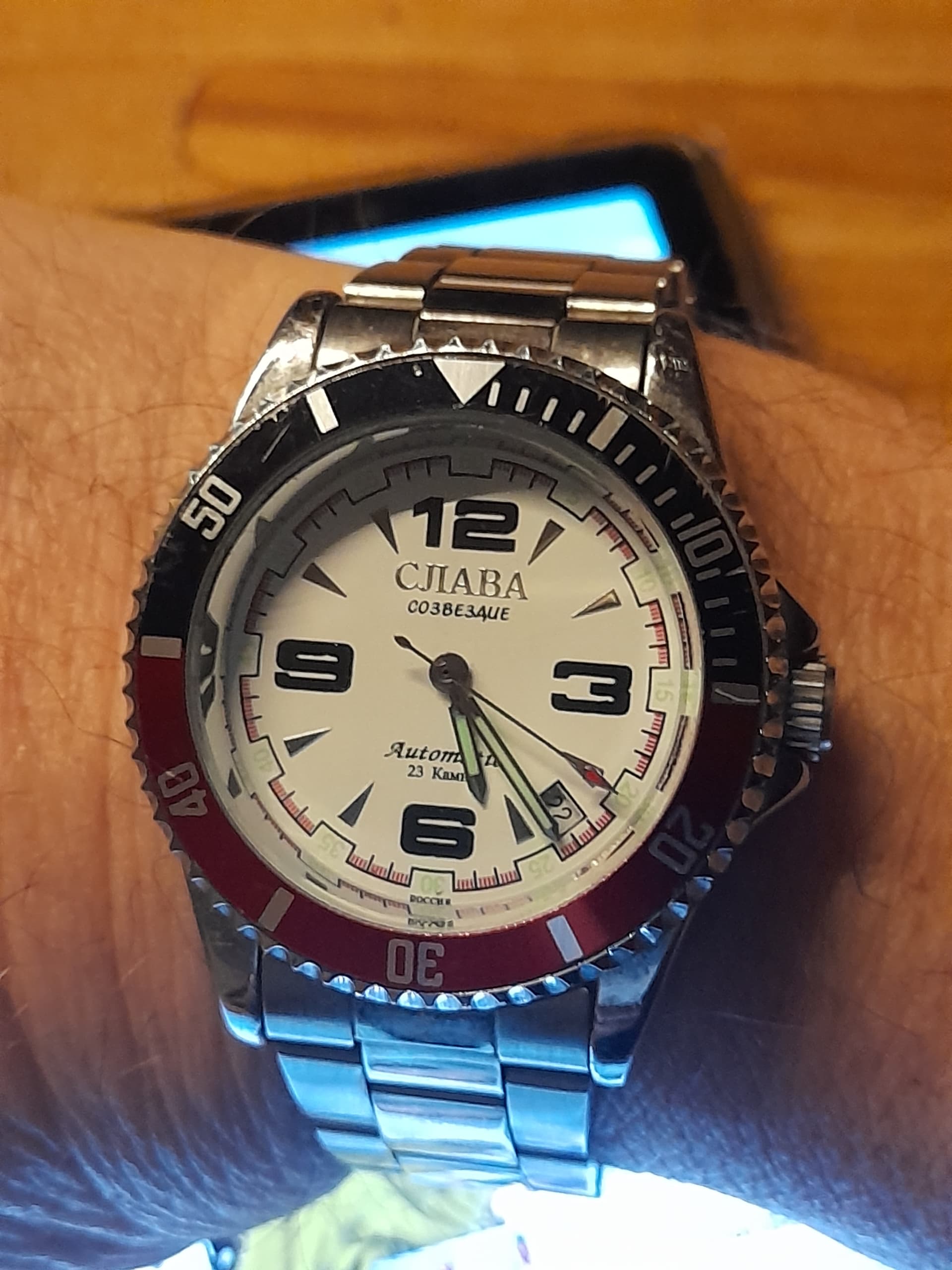 Lelijke foto, sorry, maar even om te vertellen dat deze na twee dagen om de pols nu ongeveer 6 seconden achterloopt — niet verkeerd toch voor een Rus van een jaar of veertig oud?