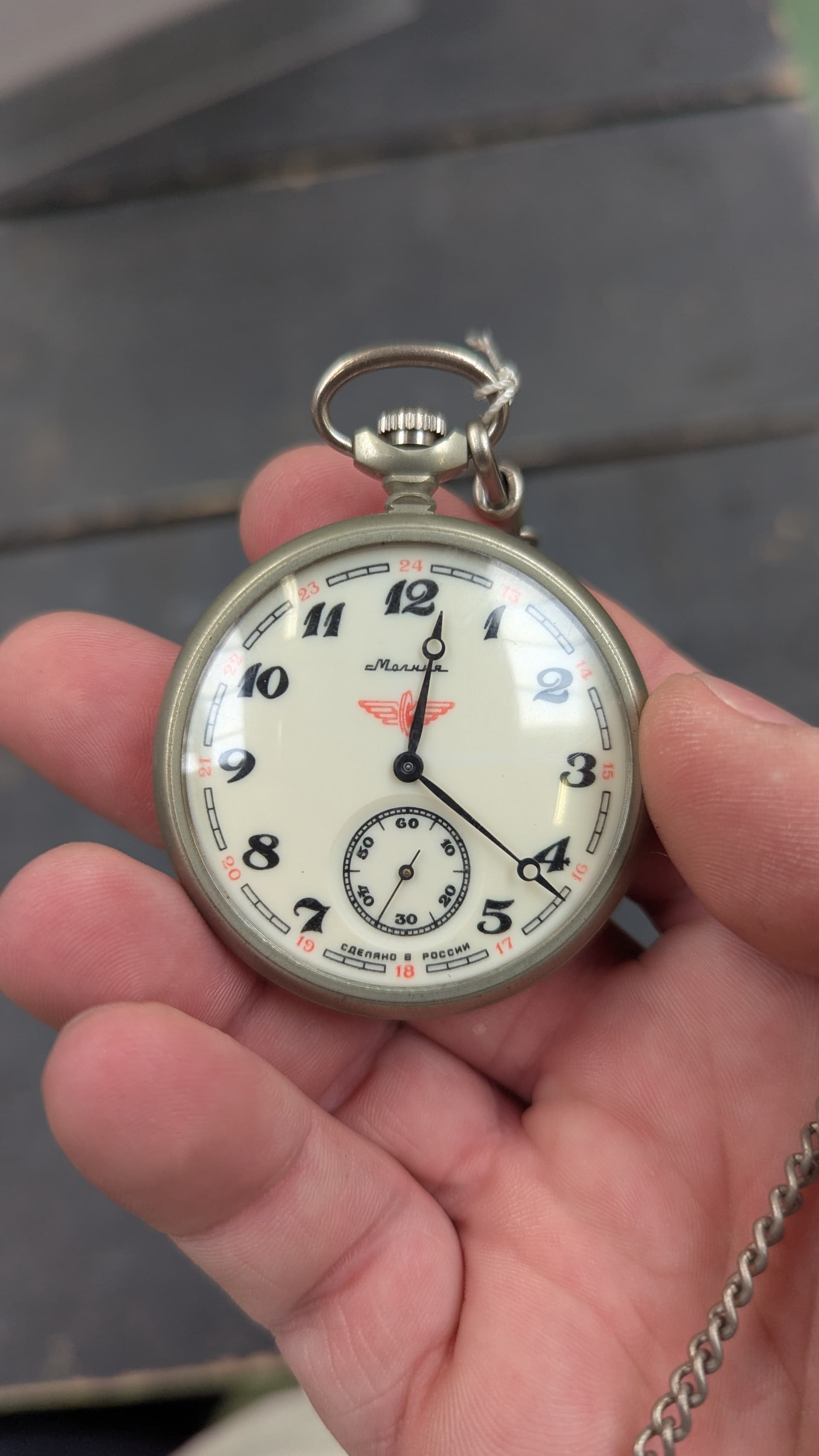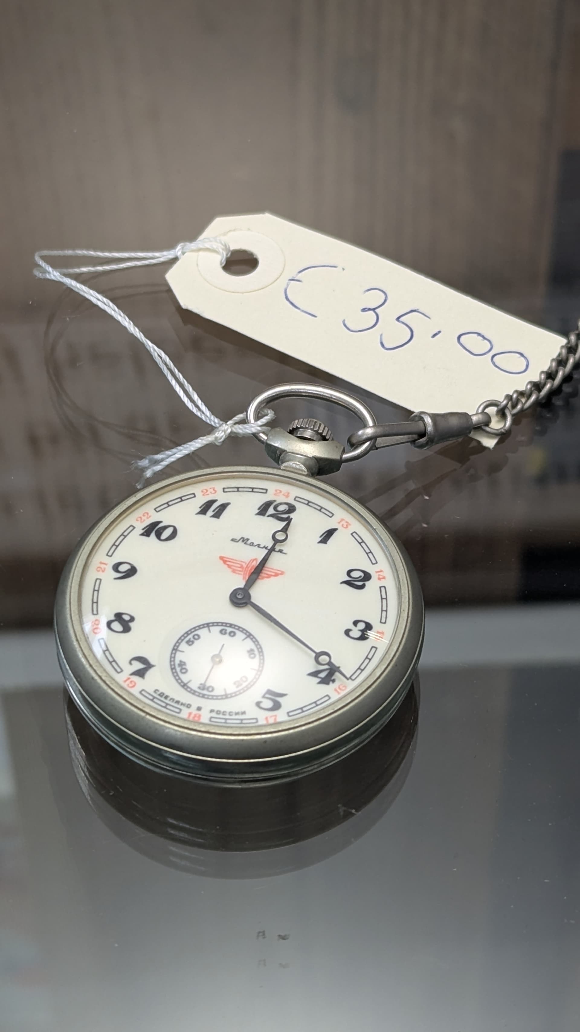 Die Molnija uurwerken zijn niet slecht. Maar je moet wel weten of ie loopt. Veel van die uurwerken hebben geen schokbescherming dus als ie toevallig ooit een keer gevallen is dan is de kans aanwezig dat de balans as gebroken is. Verder een mooi zakhorloge.