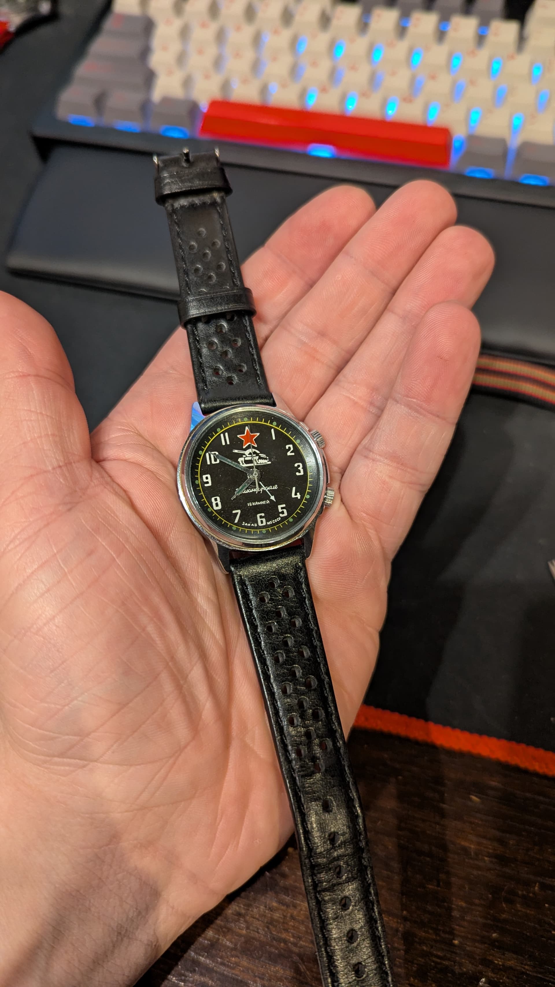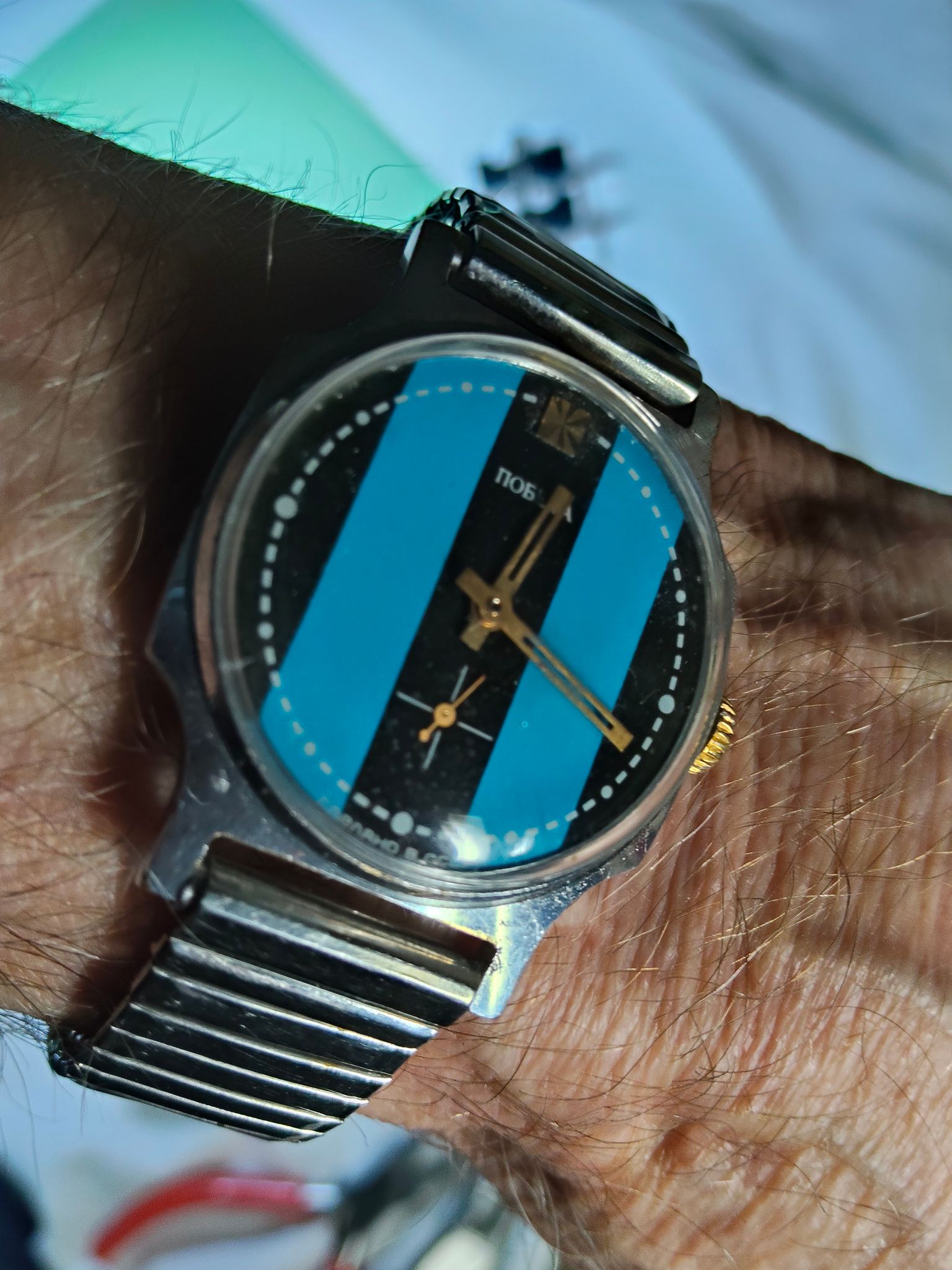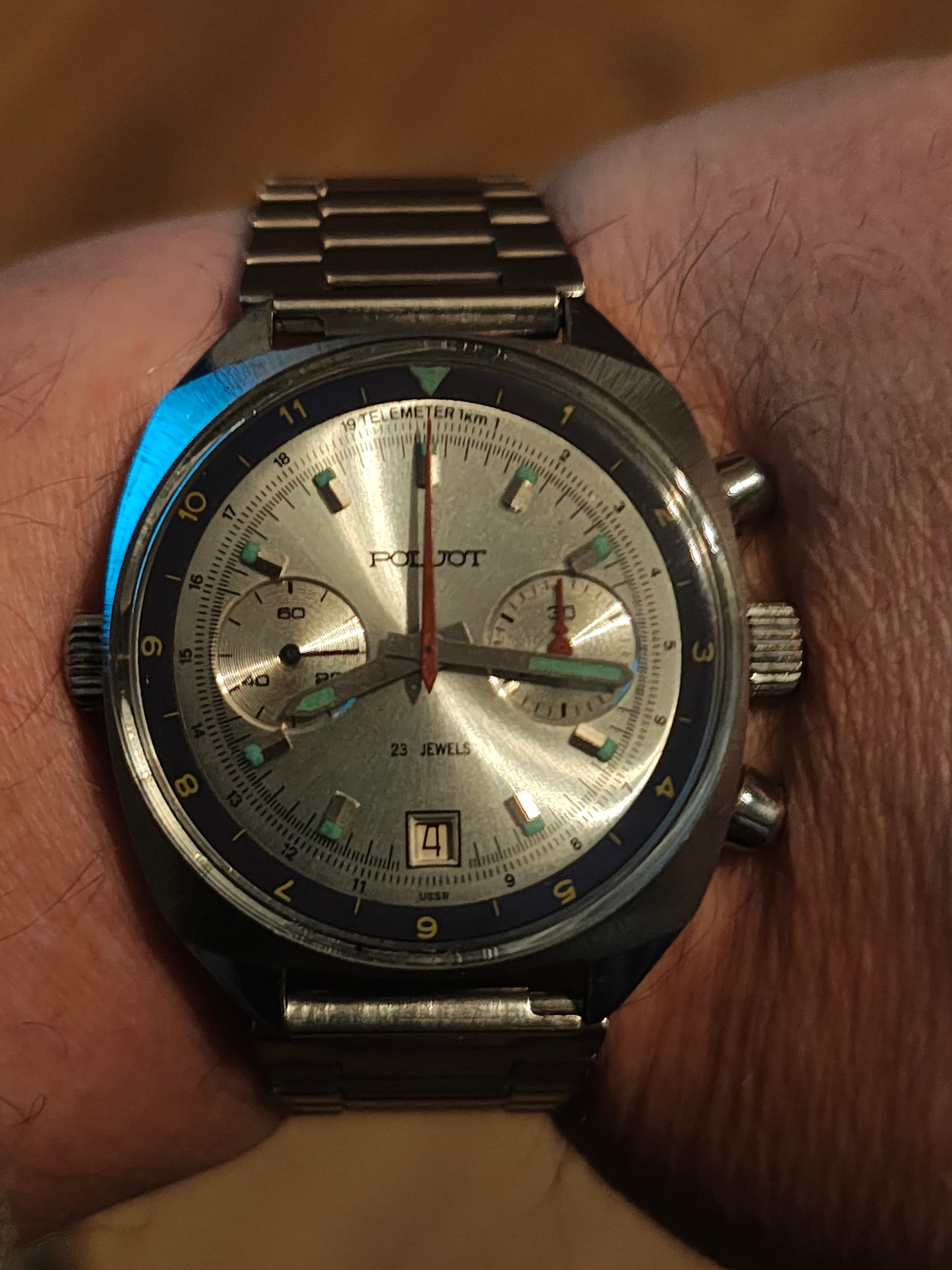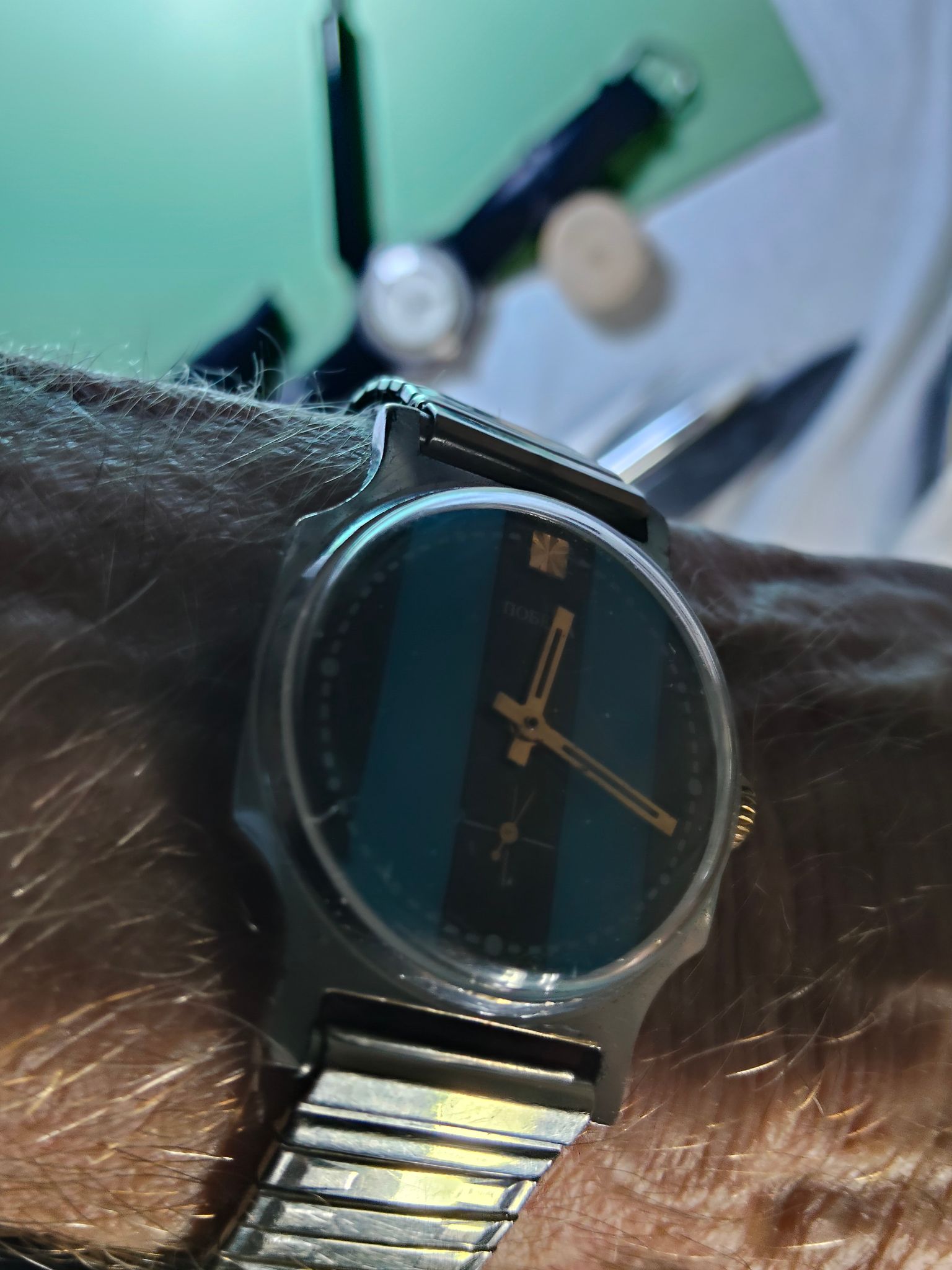 Zo kwam ie binnen, Ik heb hem flink gewassen in de ultrasoon en een nieuw glas erin gezet, en dan ook een stalen bandje aan gehangen. Ziet er nu alweer een stuk leuker uit.