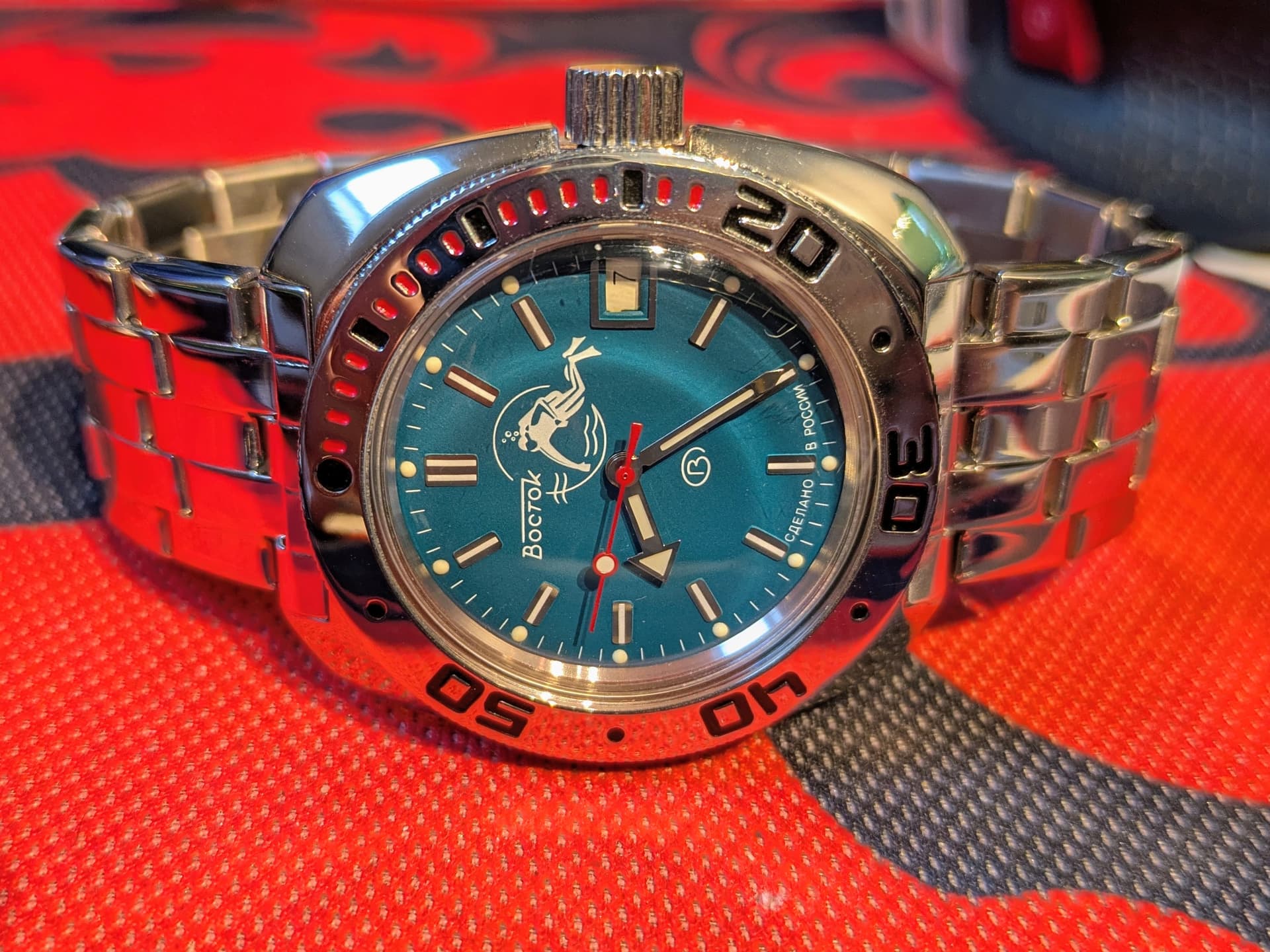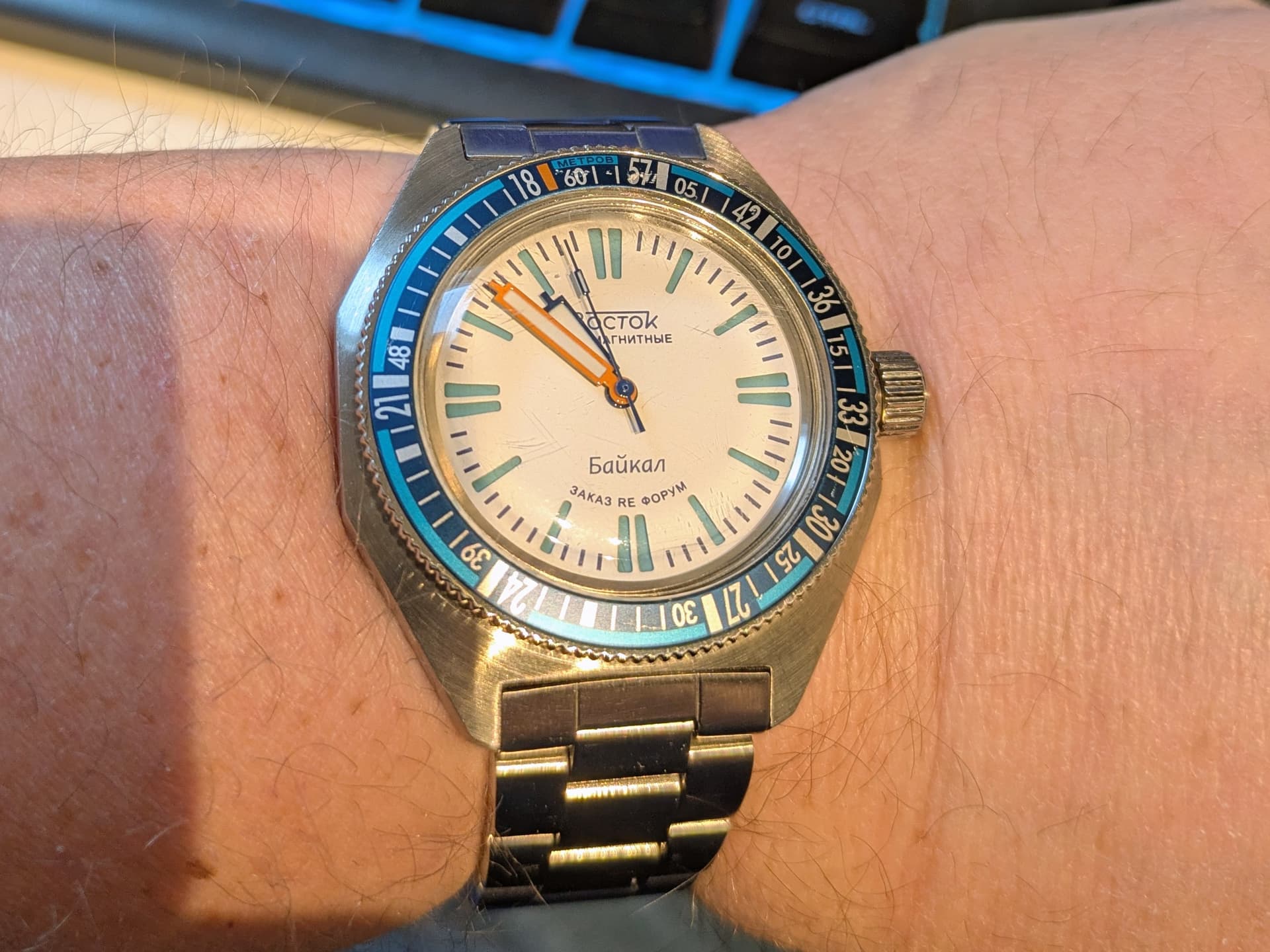 In september dacht ik dat mijn verzameling Russen niet compleet zou zijn zonder een scubadude. Dus op Chrono rondgekeken en uiteindelijk een glimmende kast met blauwe wijzerplaat aangeschaft. Splinternieuw.