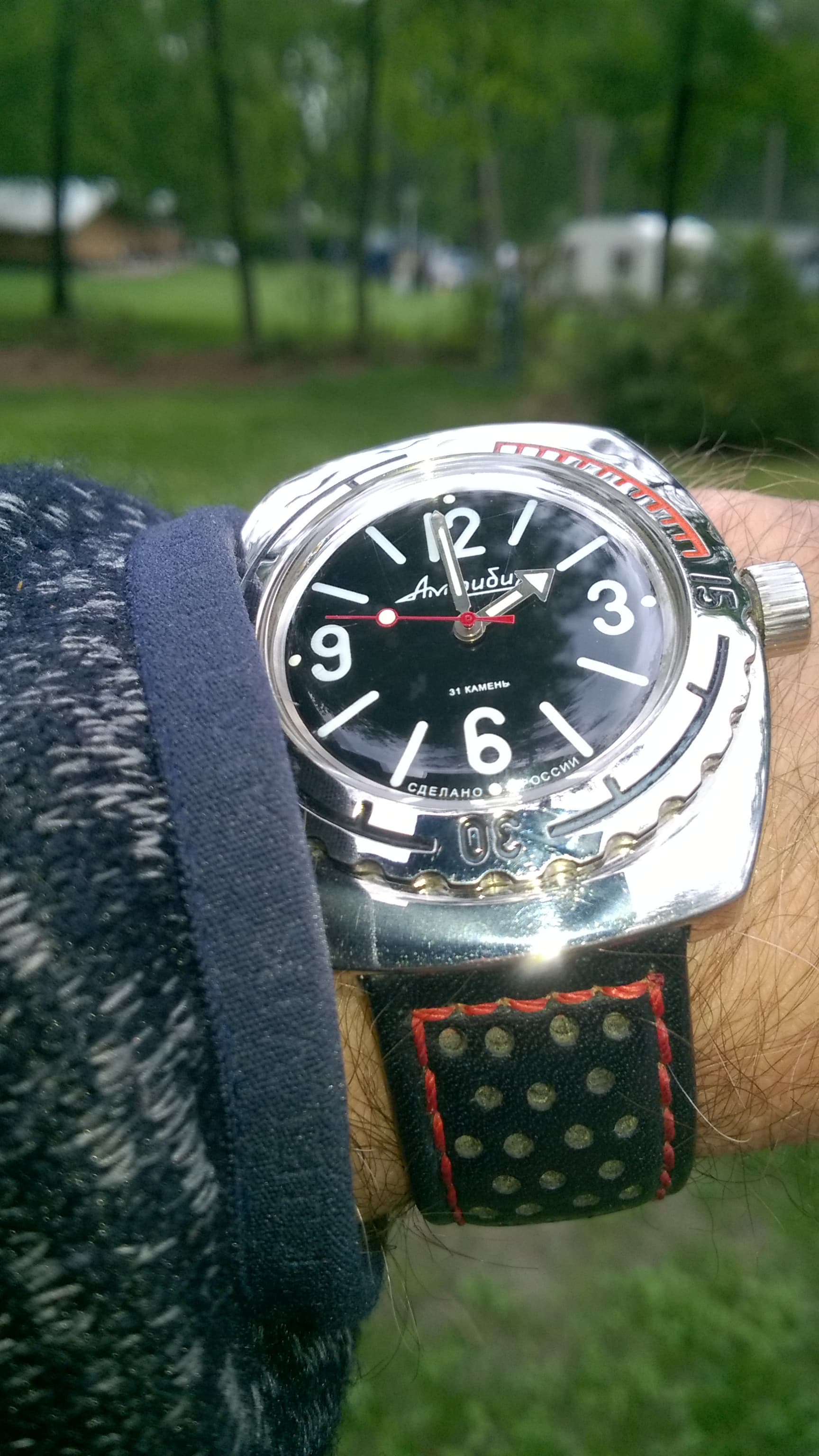Deze 090 gekocht in ca 2013 heeft orgineel een messing verchroomde bezel zoals de meeste Amphibia’s. Die ligt er naast. Ik kocht toen de optioneel bij Meranom verkrijgbare rvs bezel met lume pip. Die zit gemonteerd