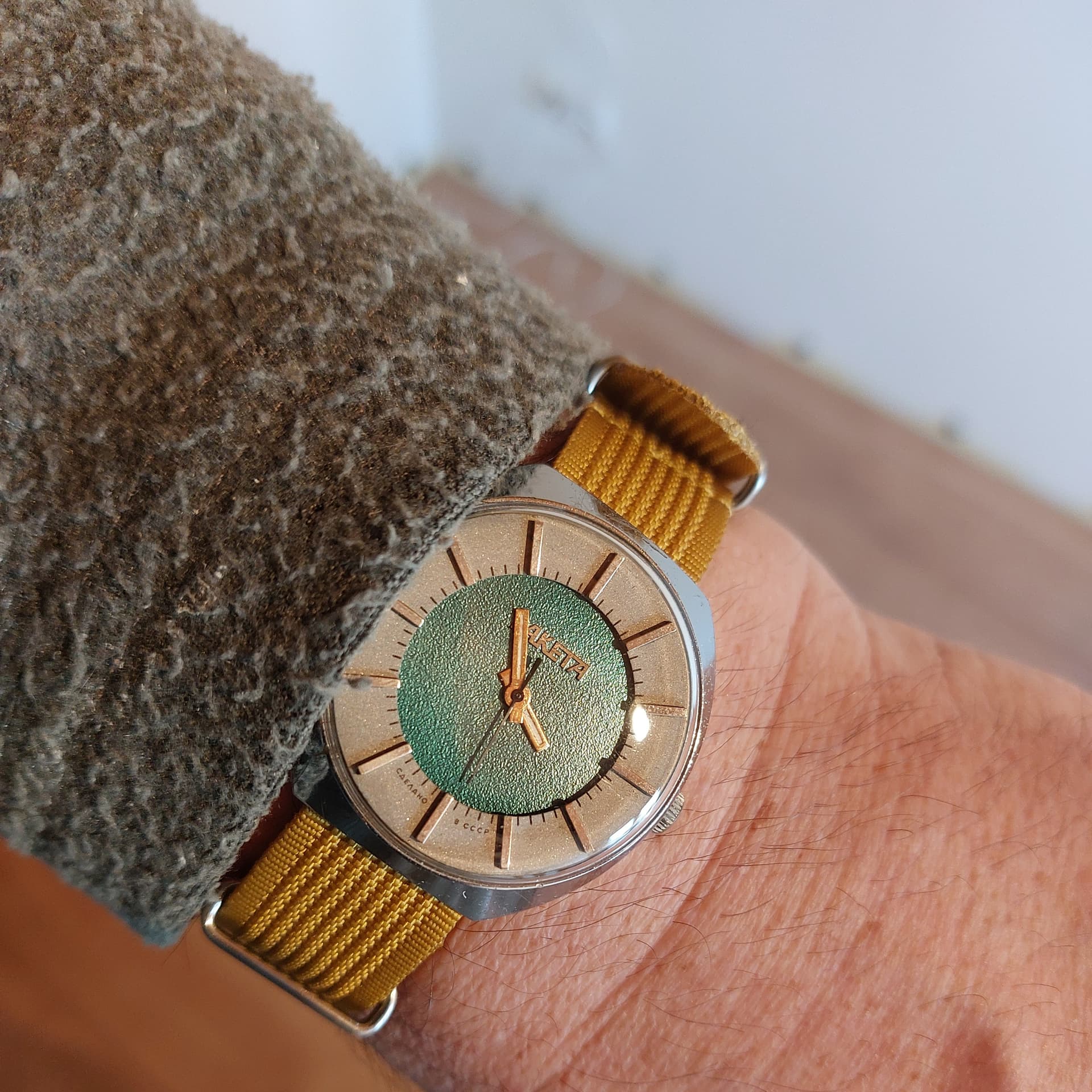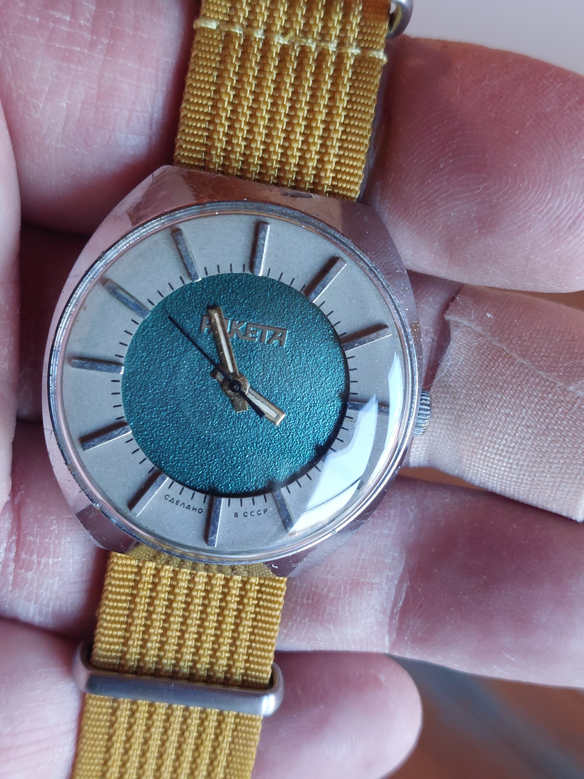 Vandaag vroeg het bed uit om bij dochterlief “even’” een laminaatvloer te leggen. Maar snel uit de bovenste lade een vrolijke en aangenaam zittende band gepakt. Blijkt een Raketa-weeskind aan te hangen. Opwinden en lopen maar.