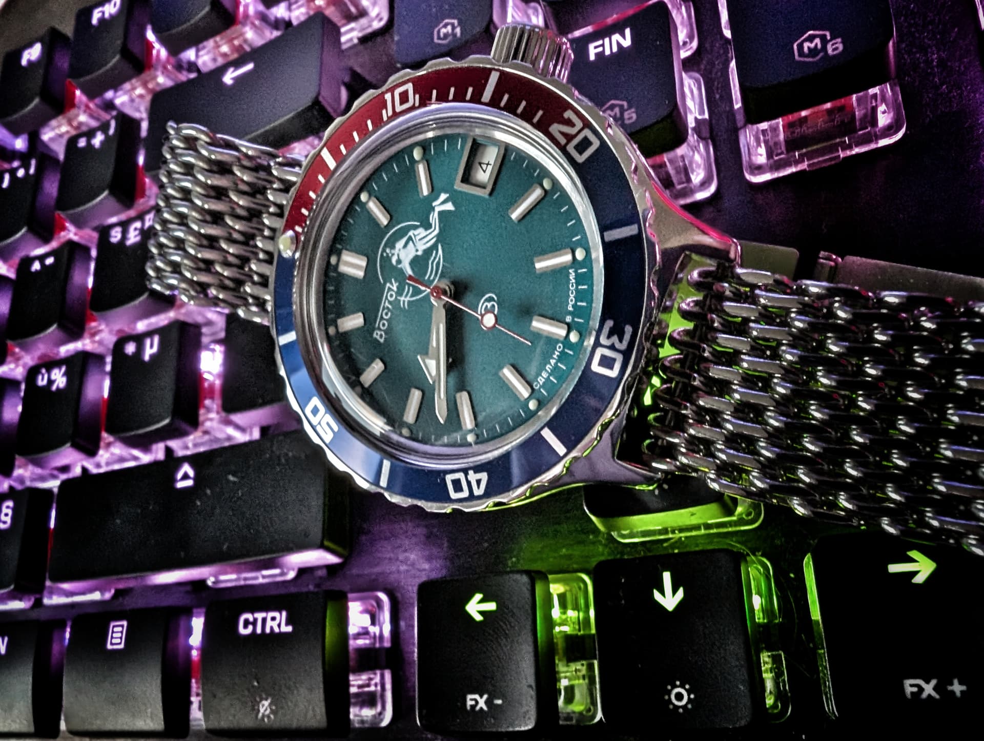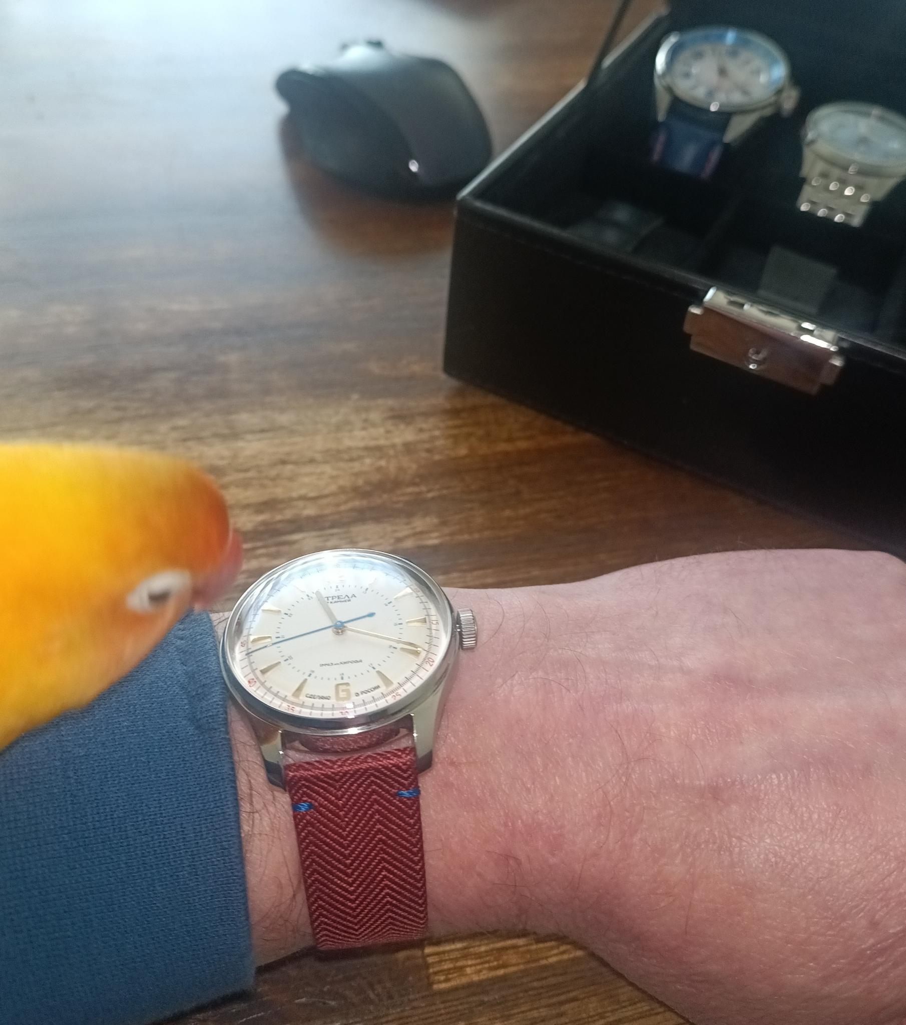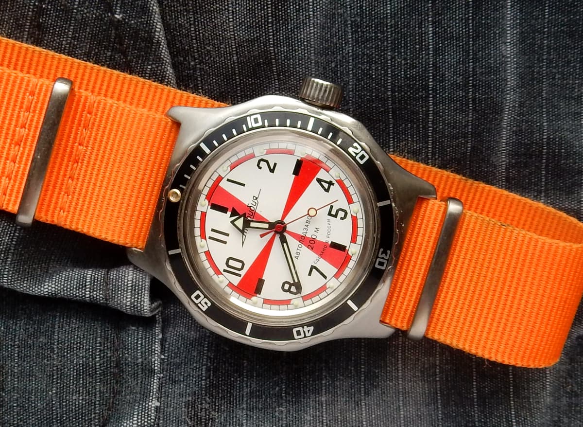 Wat een prachtig resultaat! Ik ben heel blij dat mijn Radioroom wijzerplaat en wijzers in deze bijzondere Vostok terecht gekomen zijn. Al de banden staan 'm goed. Veel plezier ermee Drex!