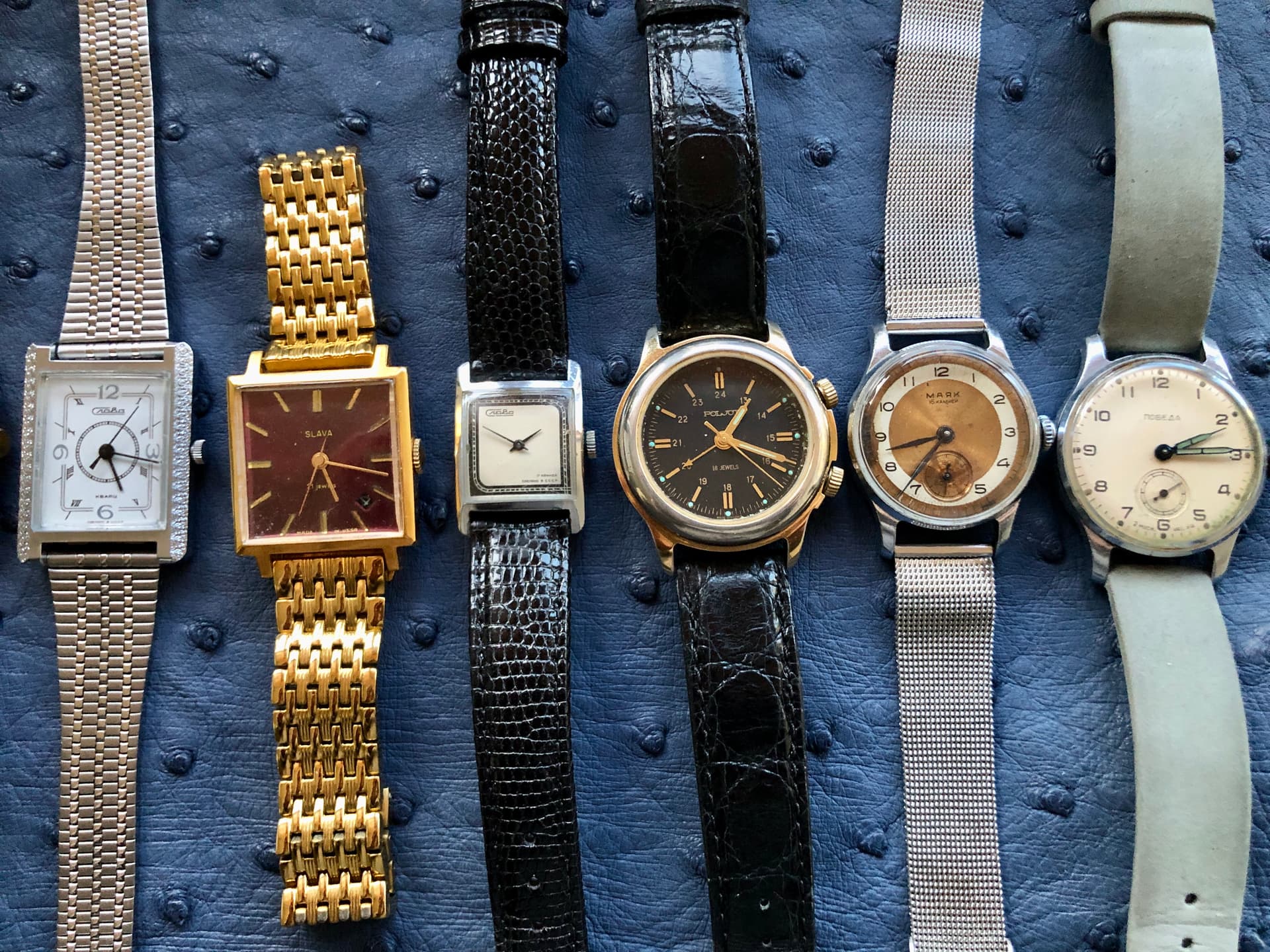 Van alles. Stel Seiko handwinders die ik vaak omdoe, een Avia, een paar Tudors, tank modellen van LIP, Bulova, HMT, Pronto, een Brunmontagne, een oude Seiko duiker, Spinnaker Hull, vintage Pontiac, een Glycine, en ook nog een Timex Weekender want niks is zo handig als indiglo. Uit het hoofd hè, want ik ben het overzicht een beetje kwijt.