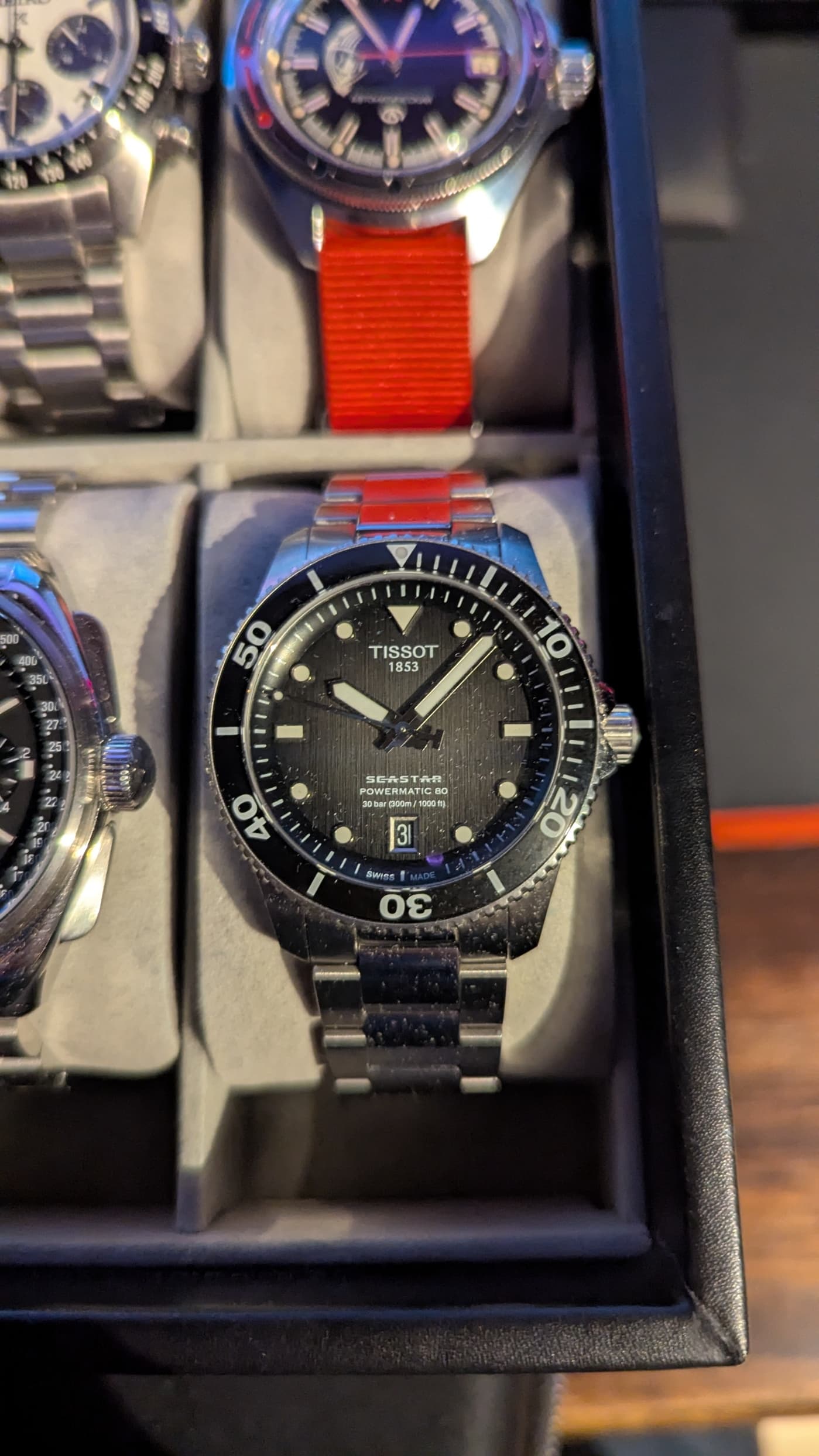 Nou, even snel dan, de mijne. Was m’n eerste Zwitserse horloge. Erg fijn horloge. Lekker uurwerk met 80 uur gangreserve, en ook nog een interessante wijzerplaat.
